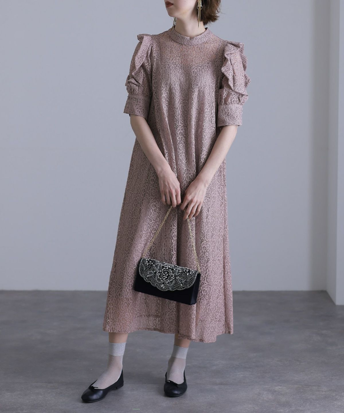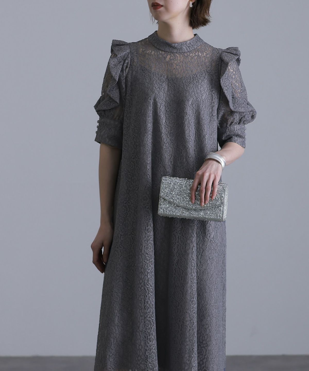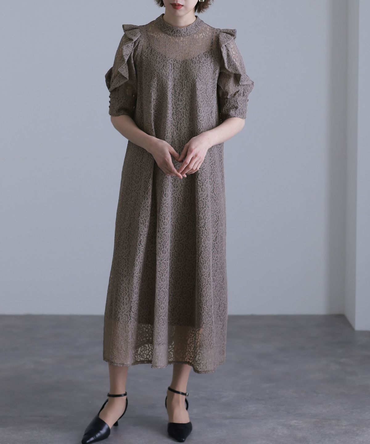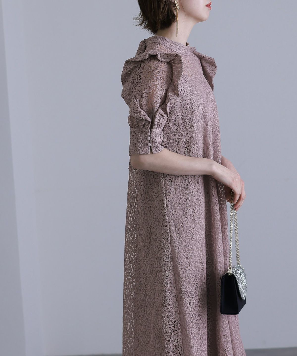 フリルの下のカフス袖がさりげなくオシャレ ハイネックショルダーフリルワンピース
