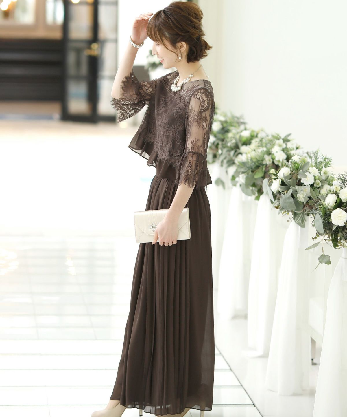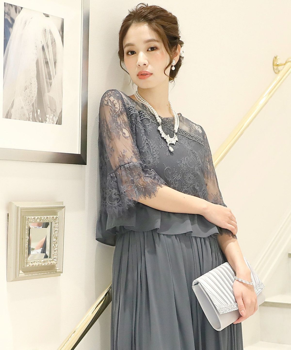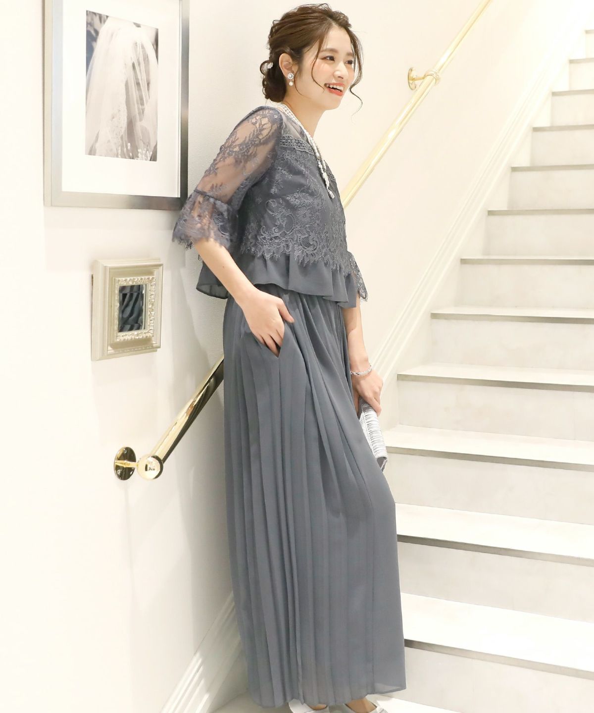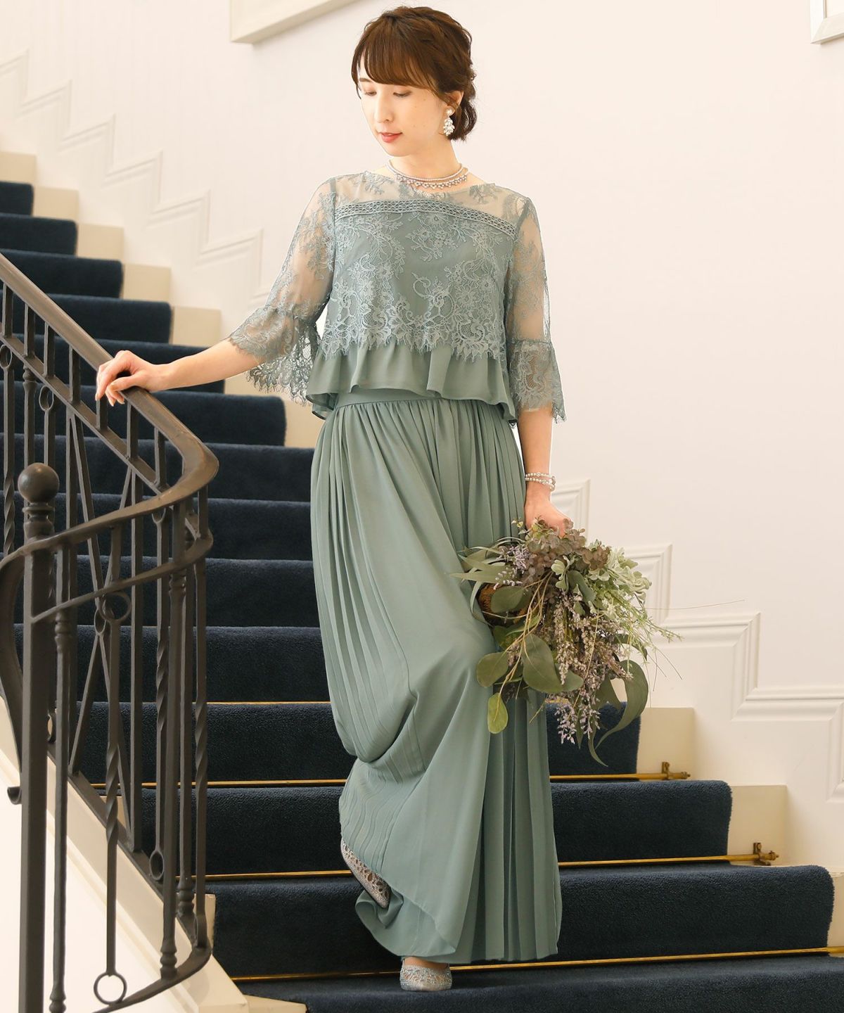 レース袖で気になる二の腕をカバー♪短めトップスとハイウエストパンツで脚長効果もある優秀ドレスです。