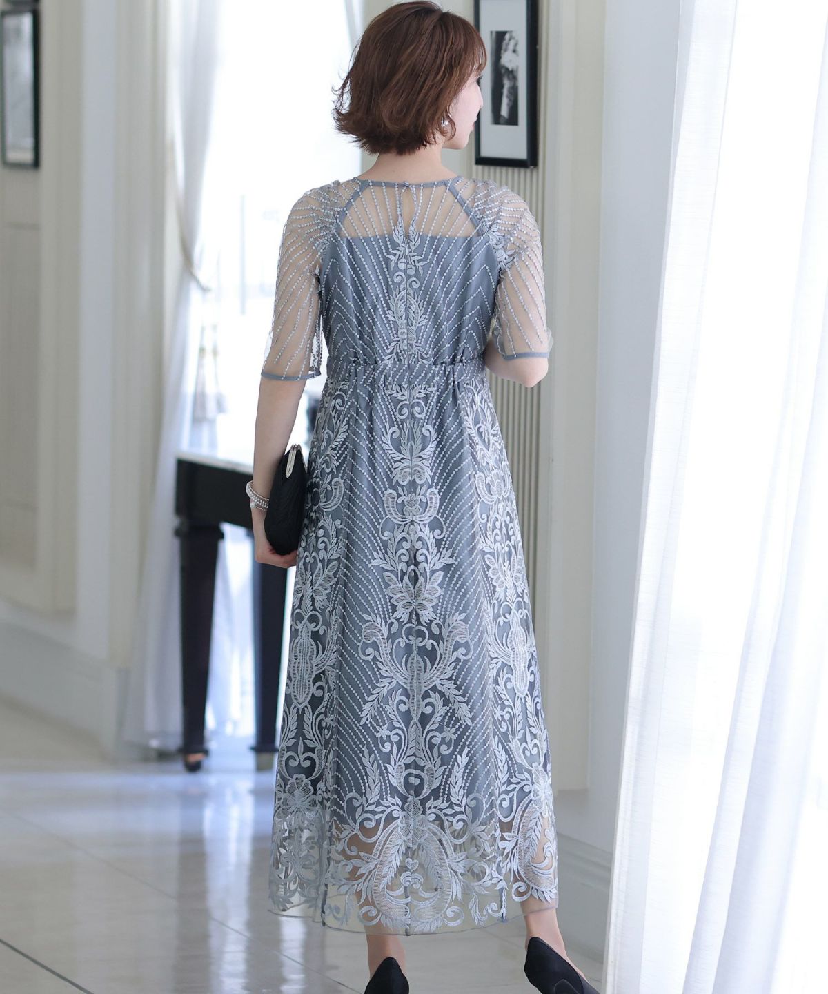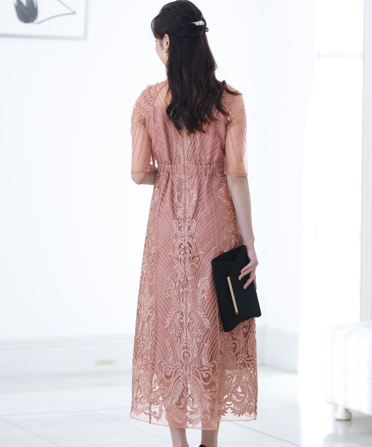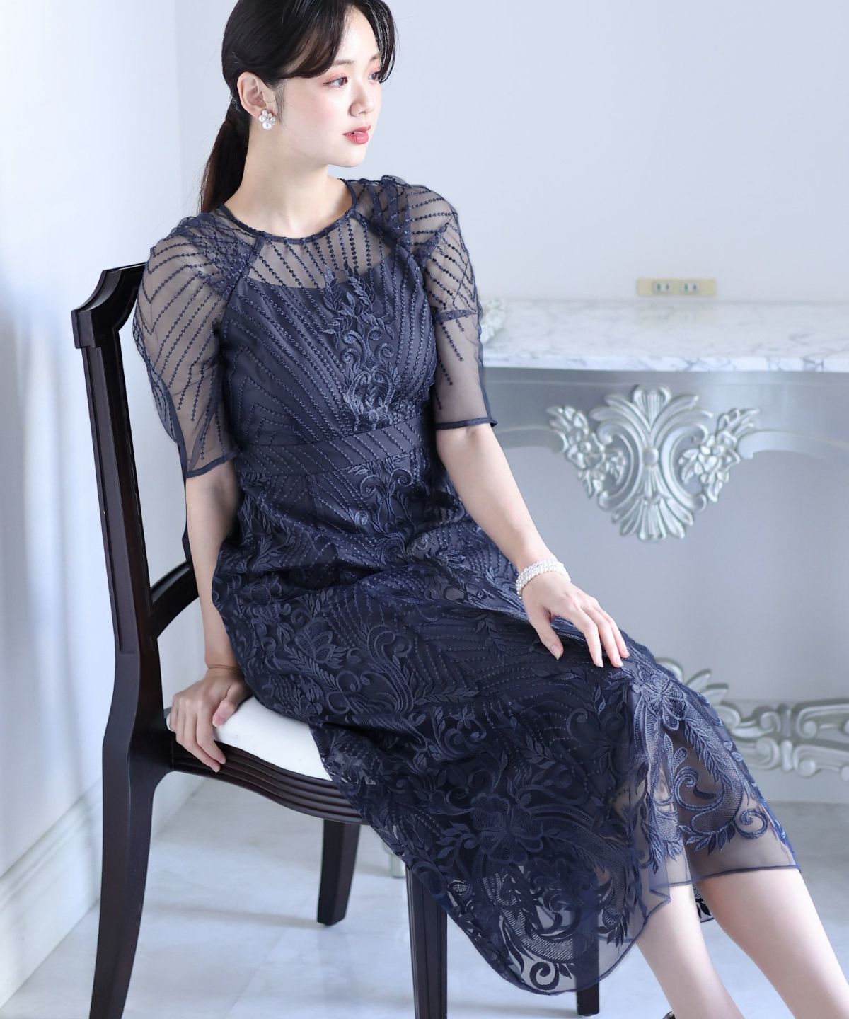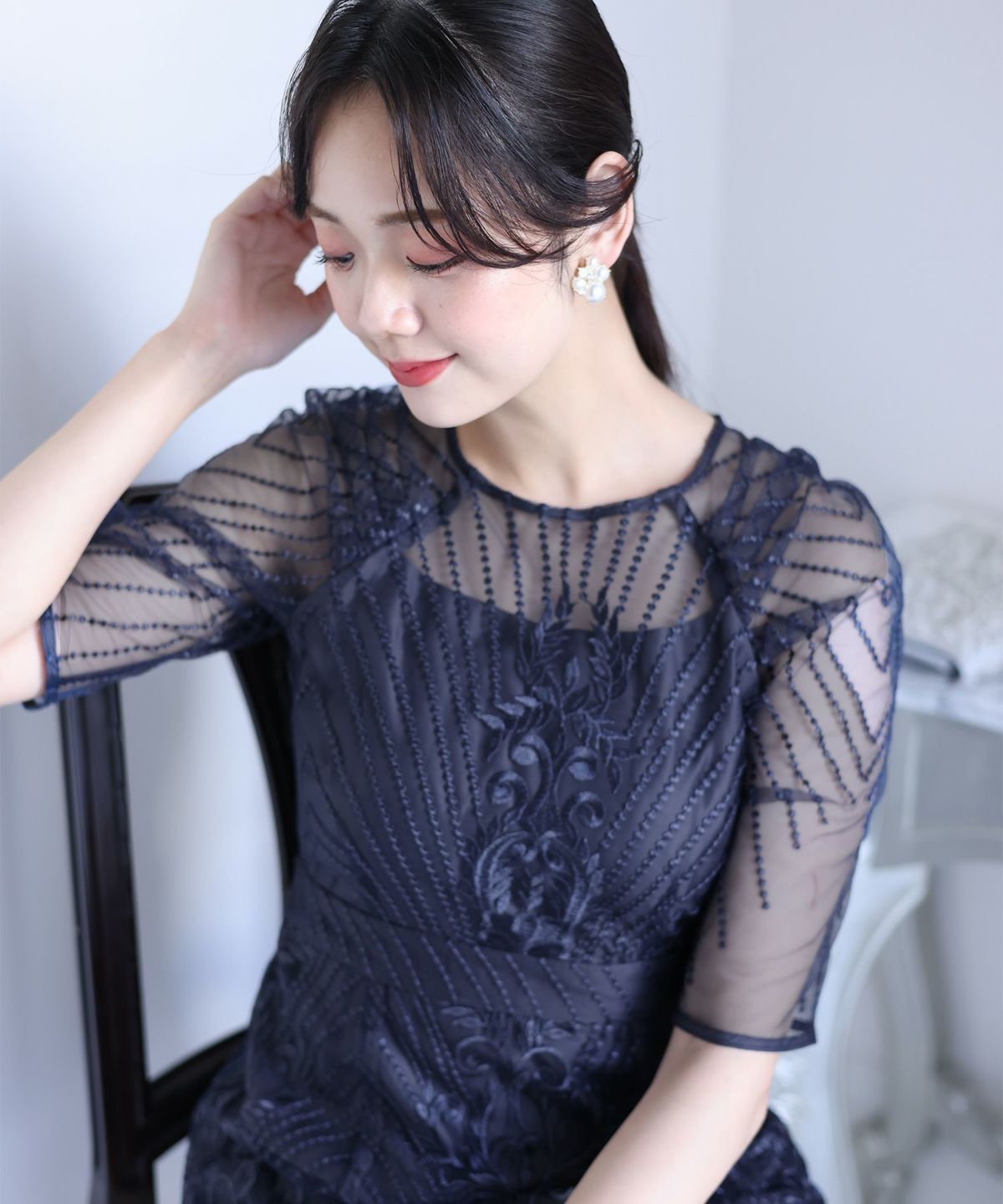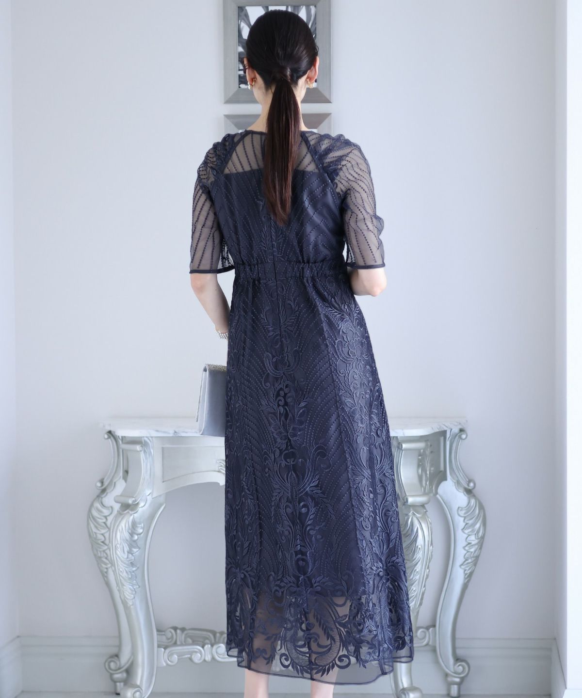 ■デコルテからスリーブにかけた透け感が上品高めのウエストラインで自然なスタイルアップが期待できます。