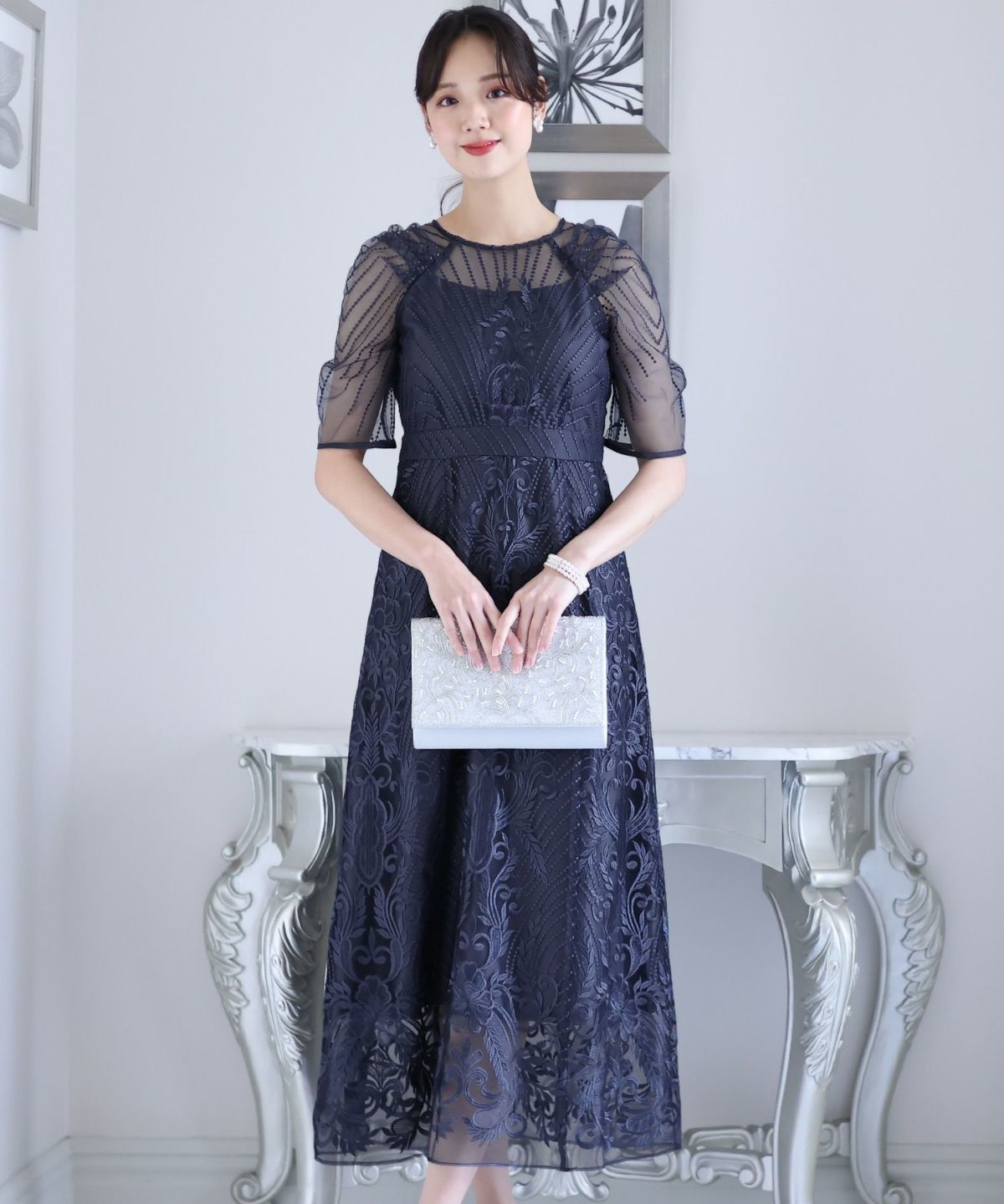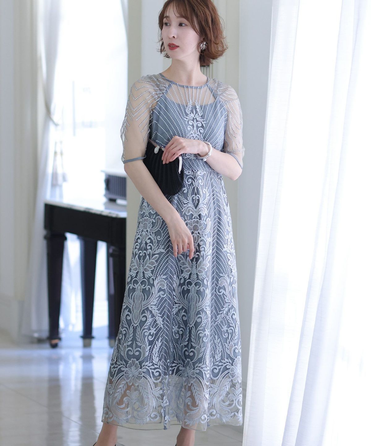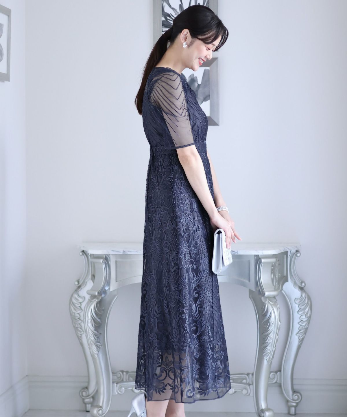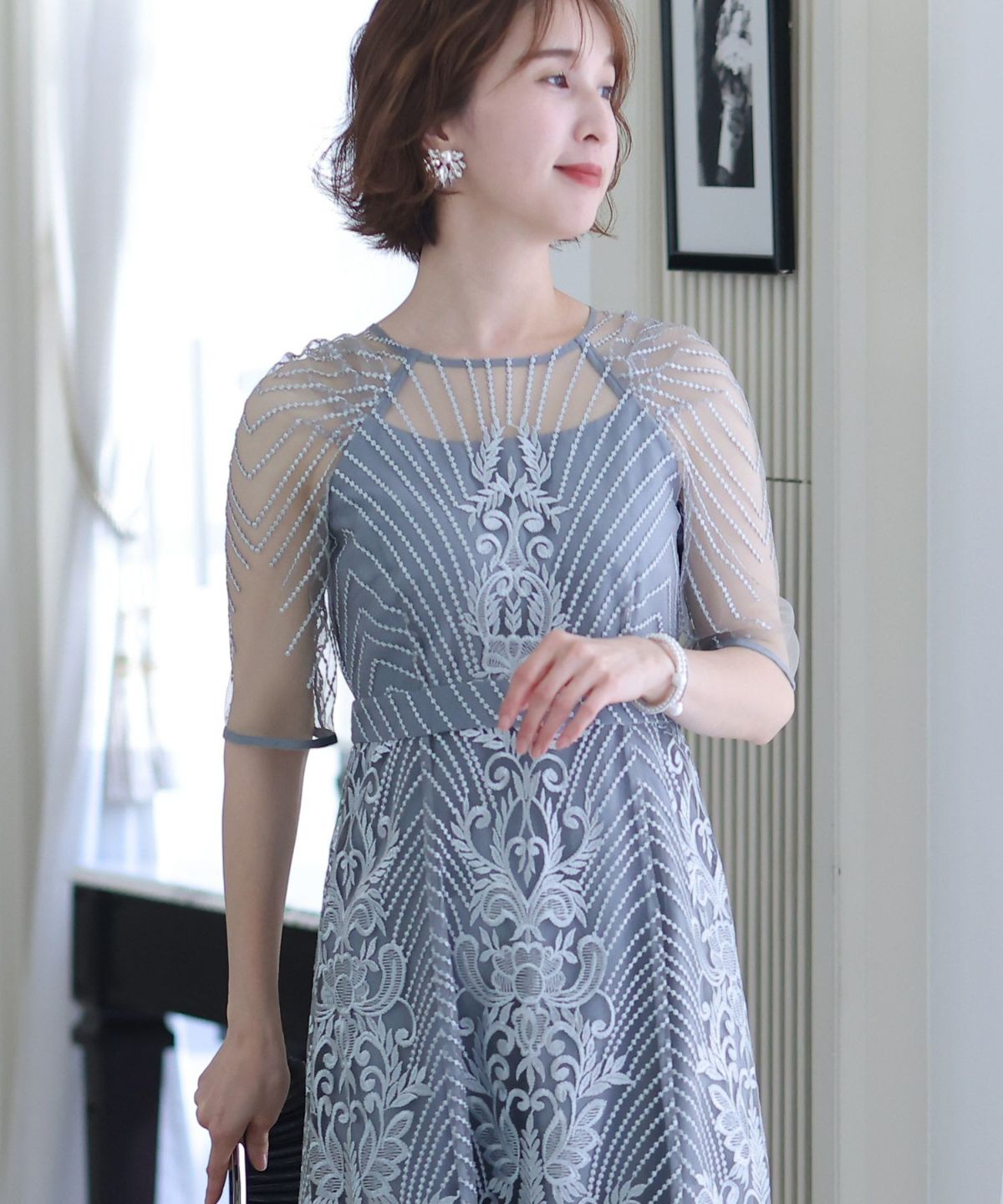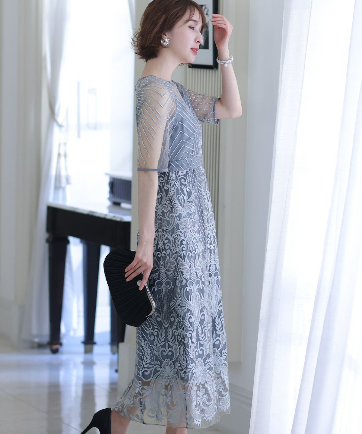 ■デコルテからスリーブにかけた透け感が上品高めのウエストラインで自然なスタイルアップが期待できます。