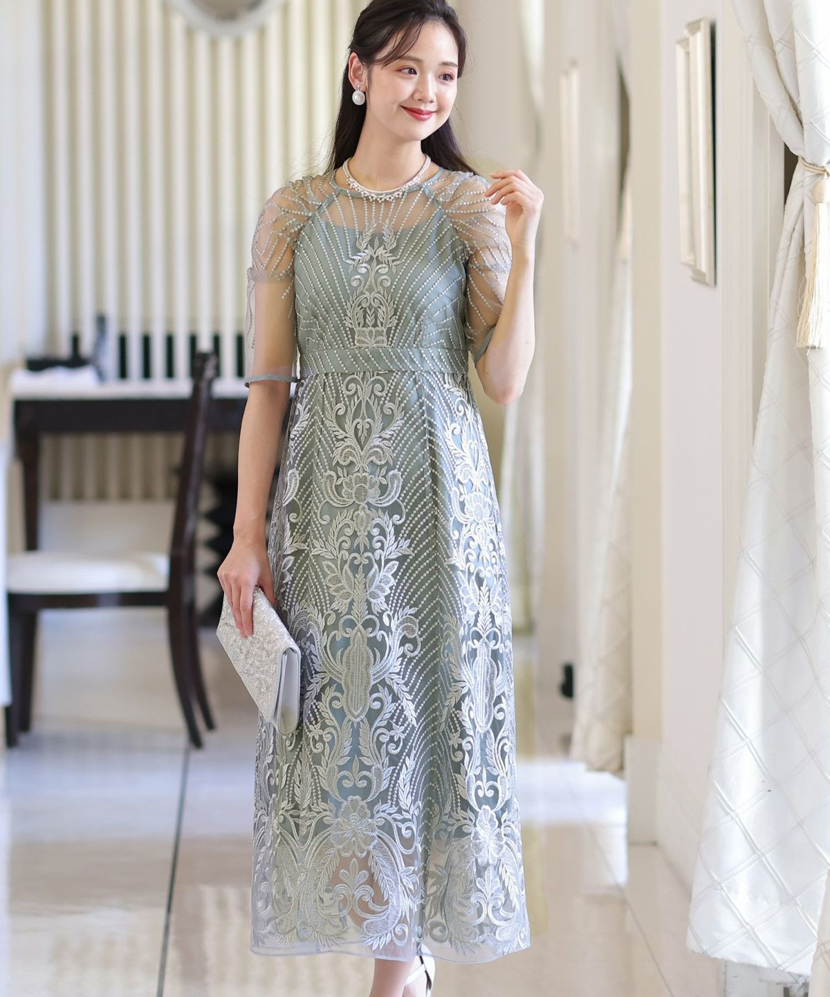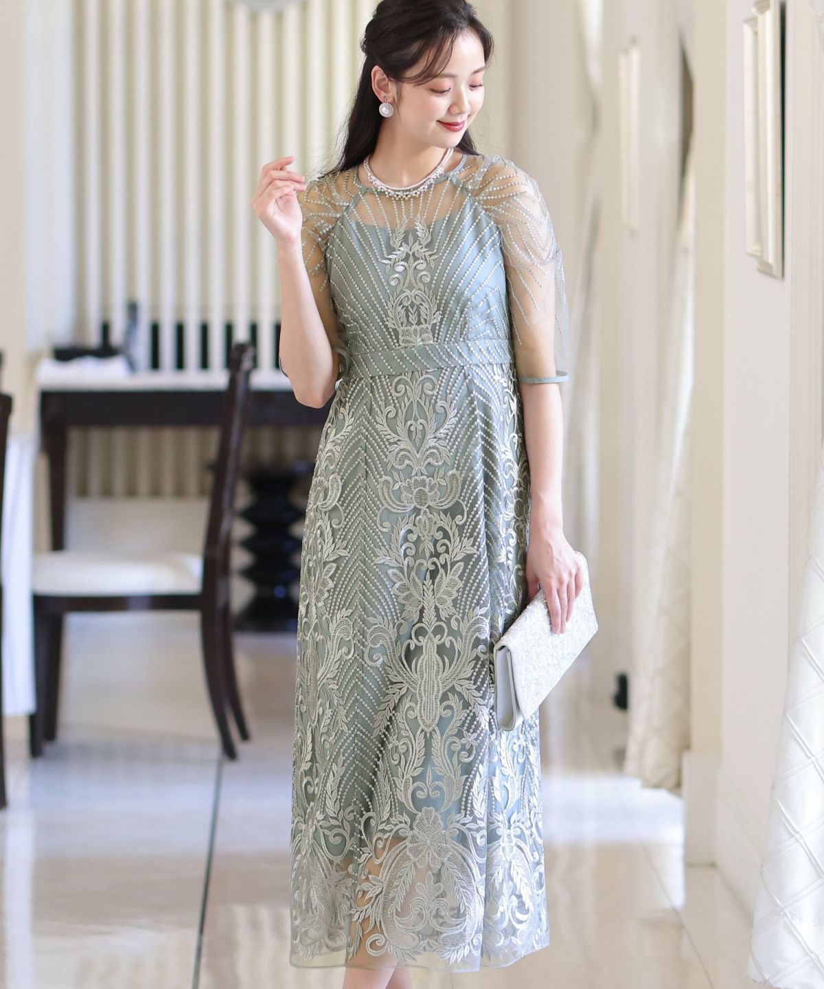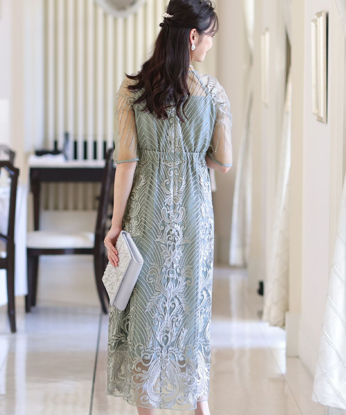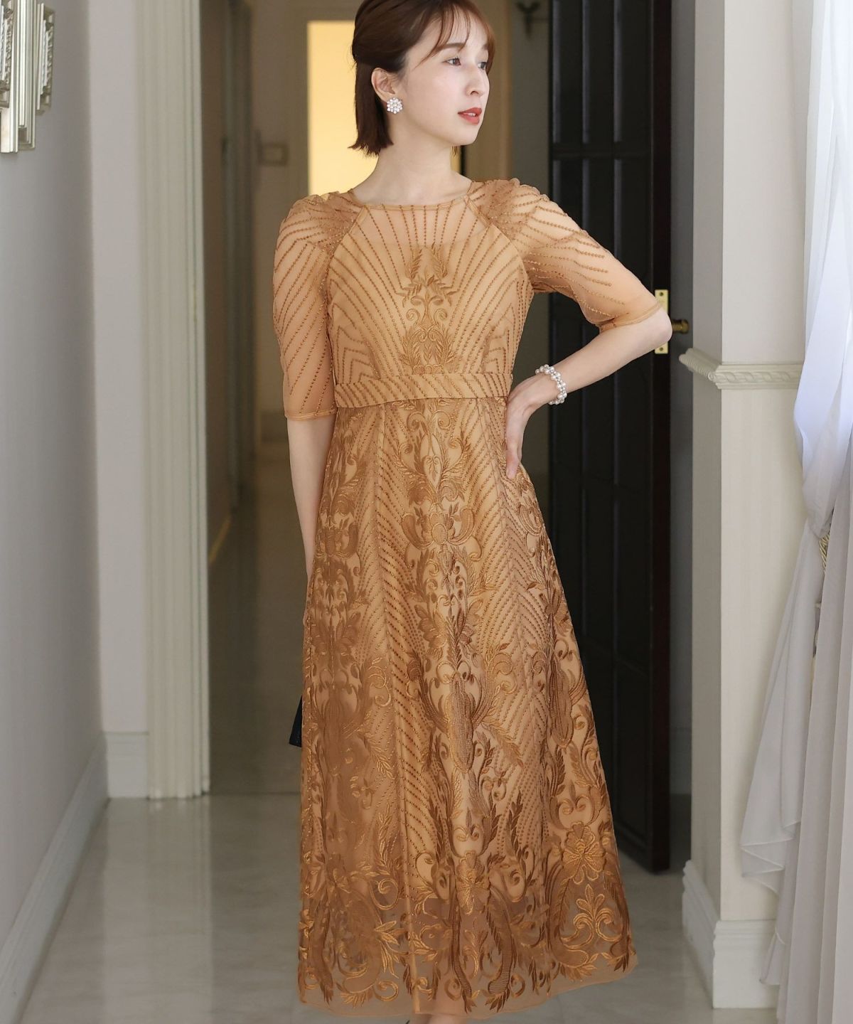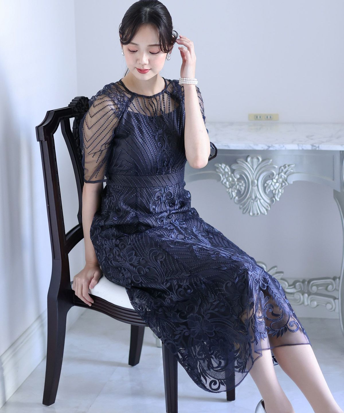■デコルテからスリーブにかけた透け感が上品高めのウエストラインで自然なスタイルアップが期待できます。