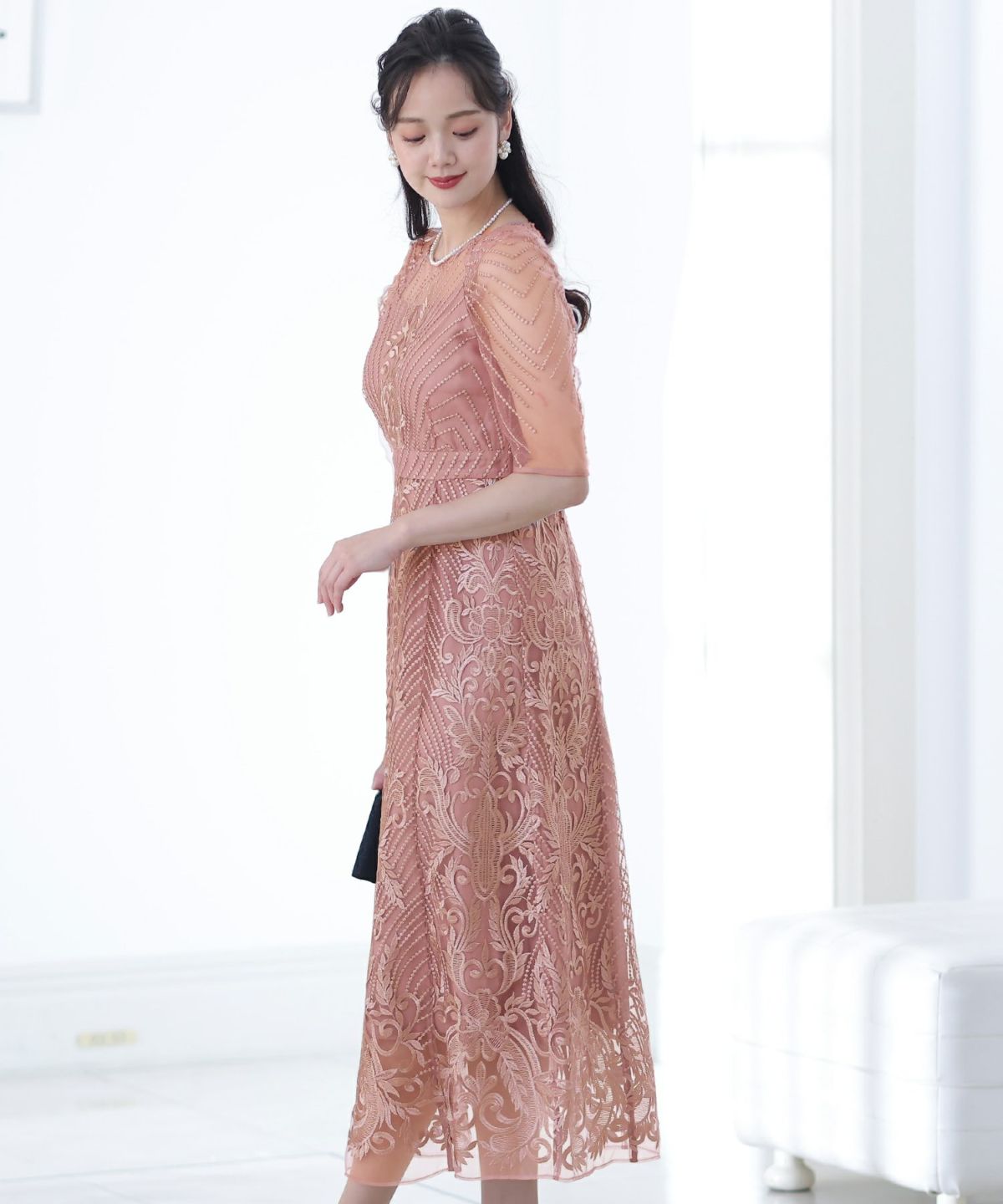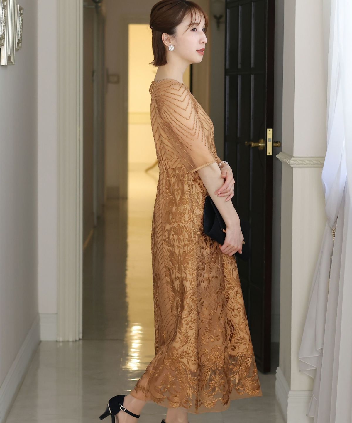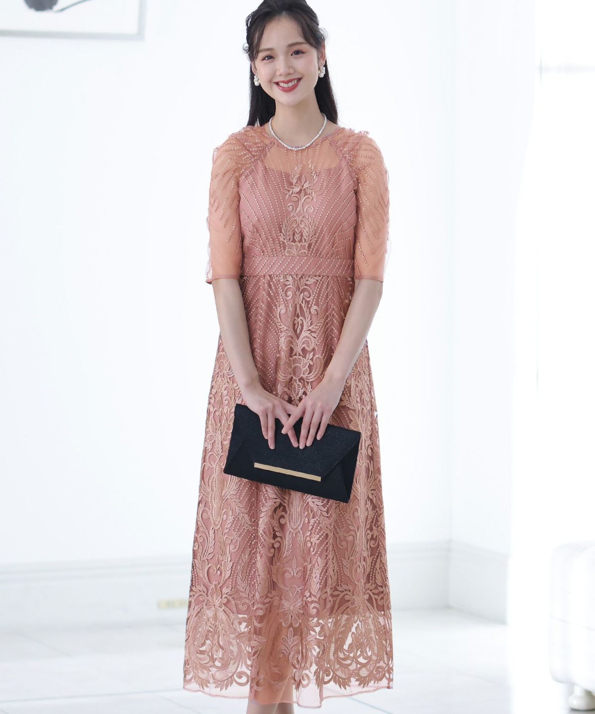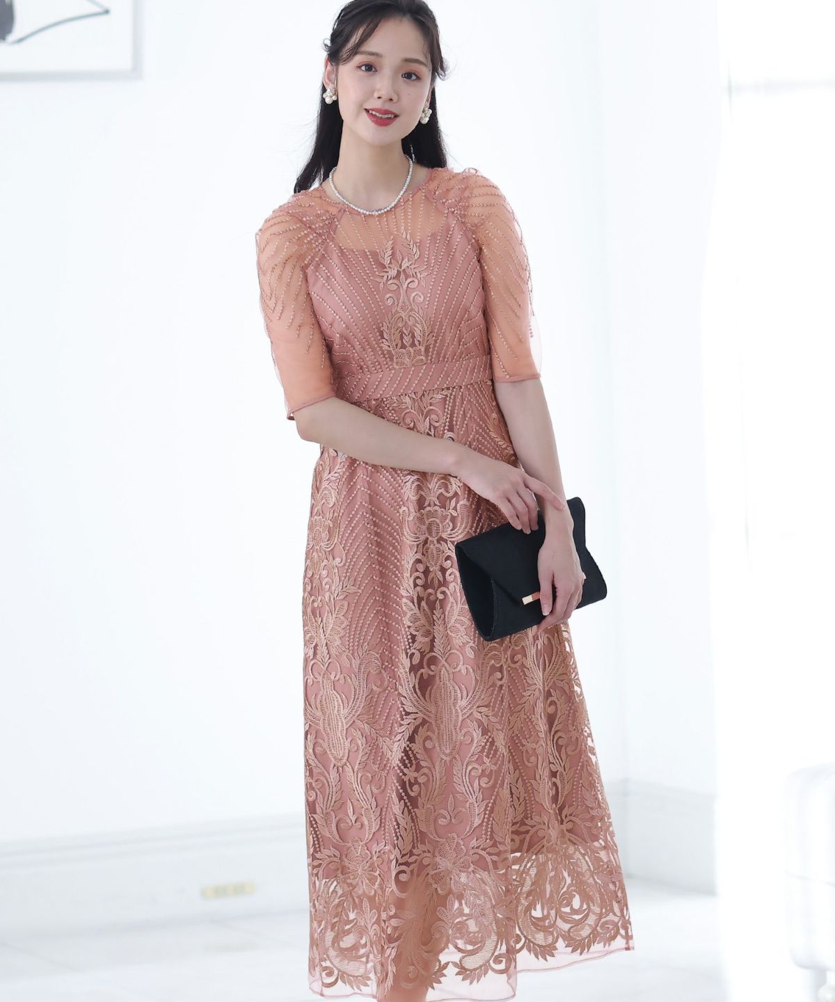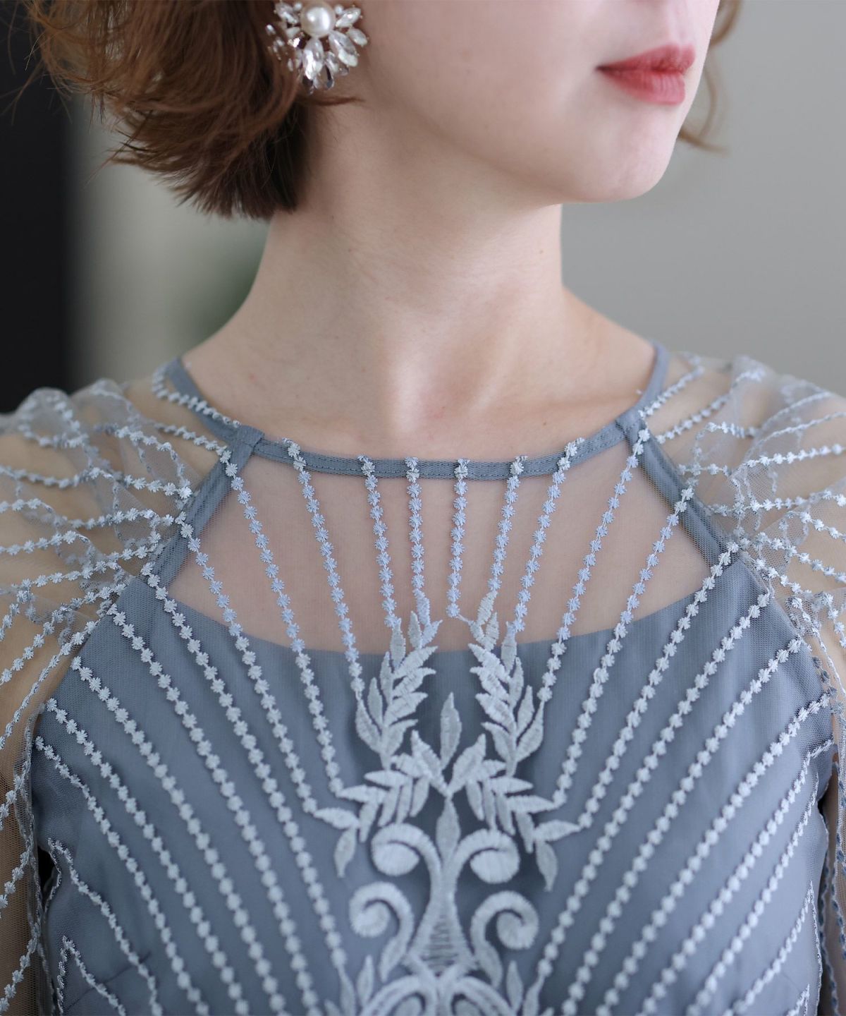 ■デコルテからスリーブにかけた透け感が上品高めのウエストラインで自然なスタイルアップが期待できます。