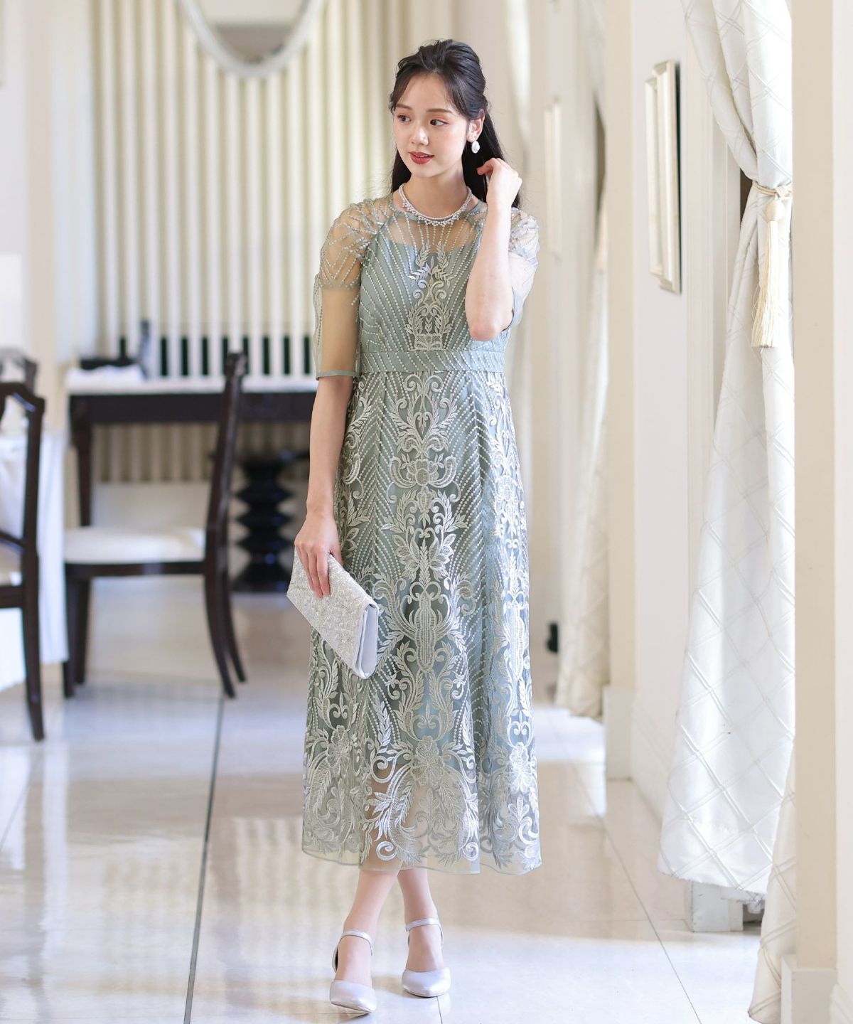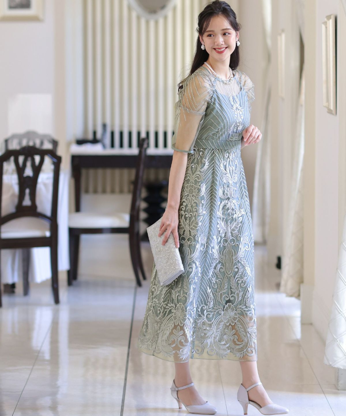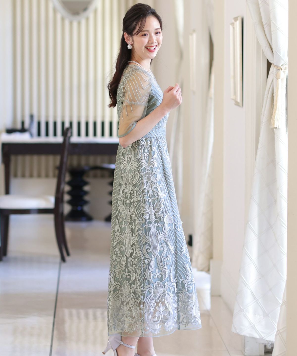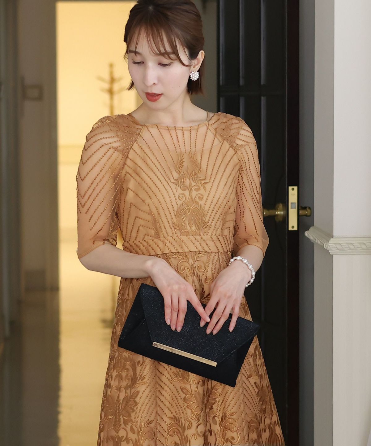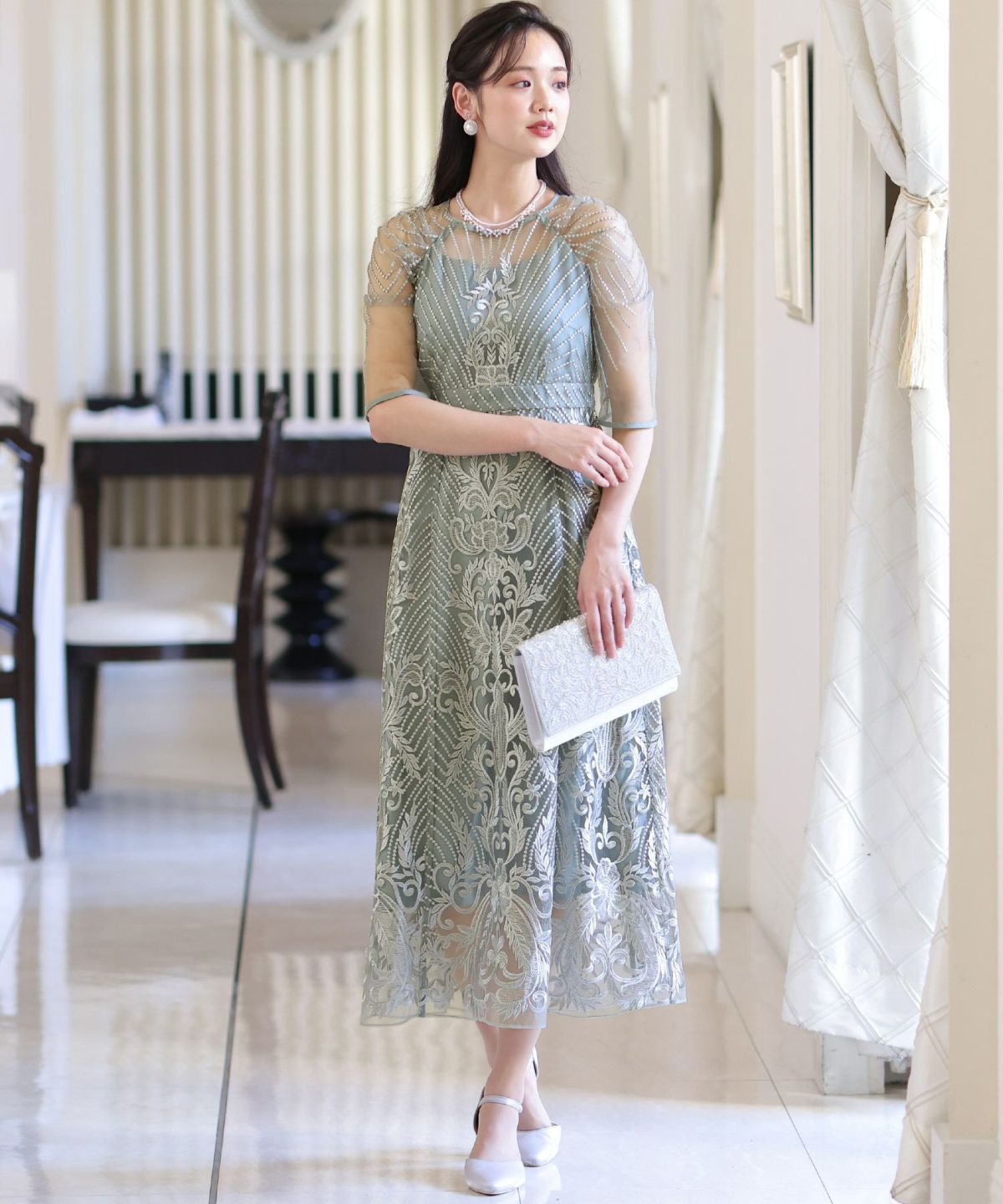 ■デコルテからスリーブにかけた透け感が上品高めのウエストラインで自然なスタイルアップが期待できます。