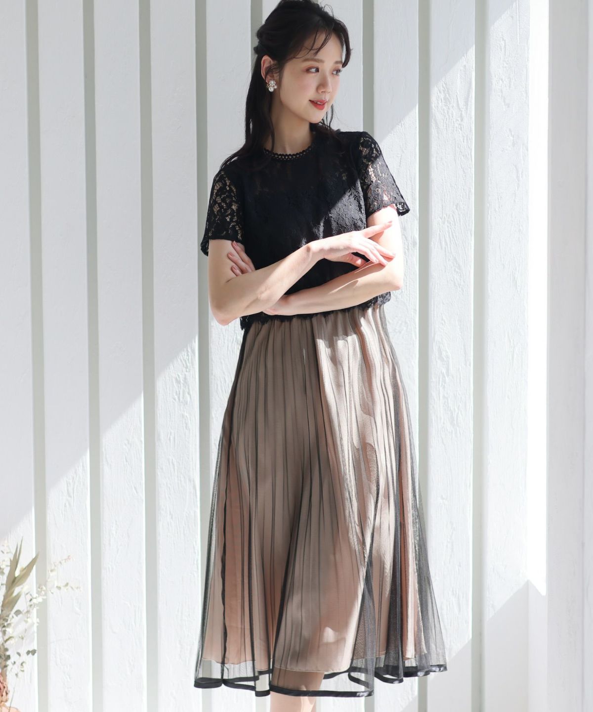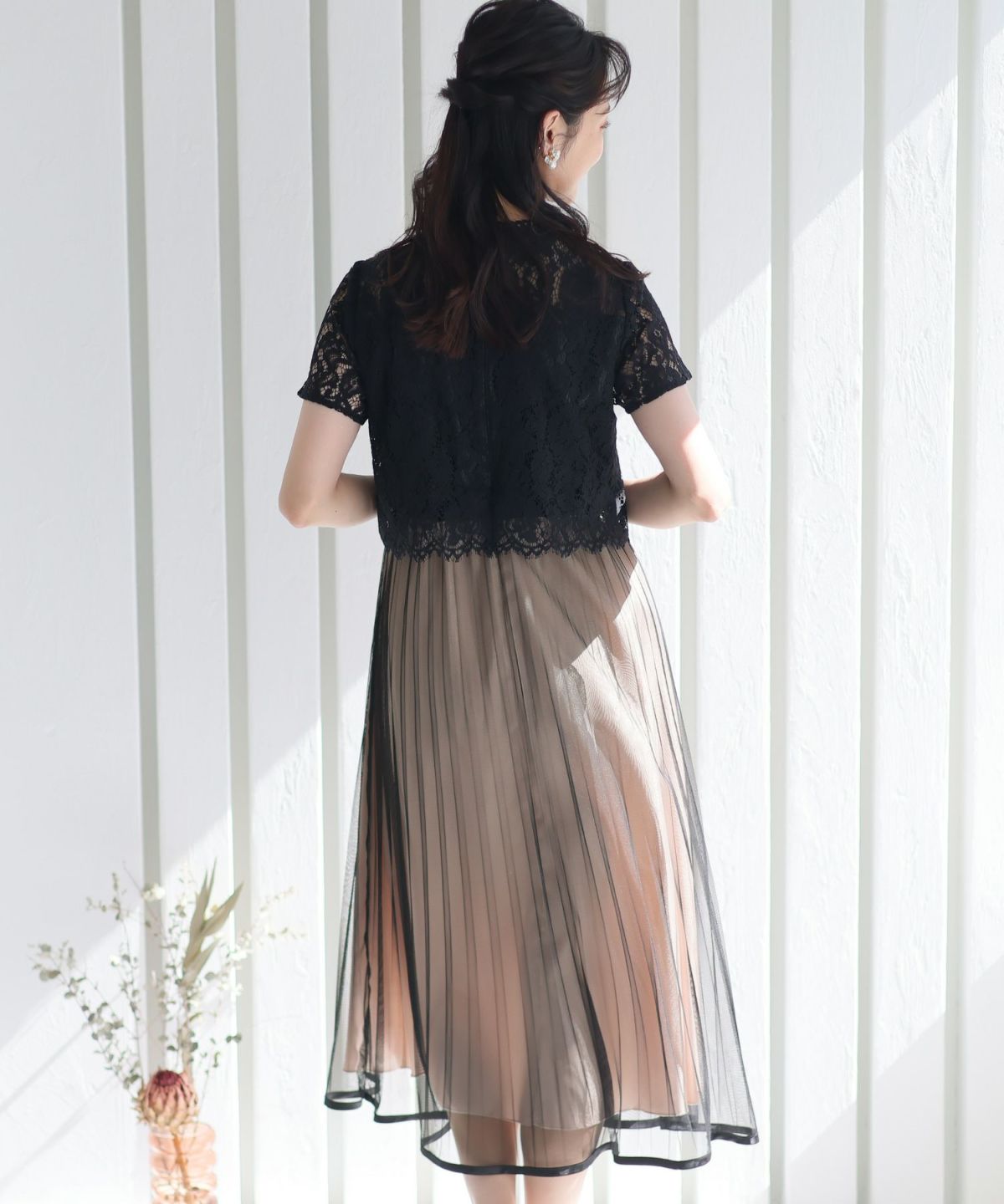 ■レース×チュールレースとチュールの切り替えが可愛いワンピースです。袖やデコルテの程よい透け感で上品な印象に。落ち着いたカラーのチュールスカートは甘すぎず大人女性にぴったり。オケージョンシーンや特別なお食事会にもおすすめ。