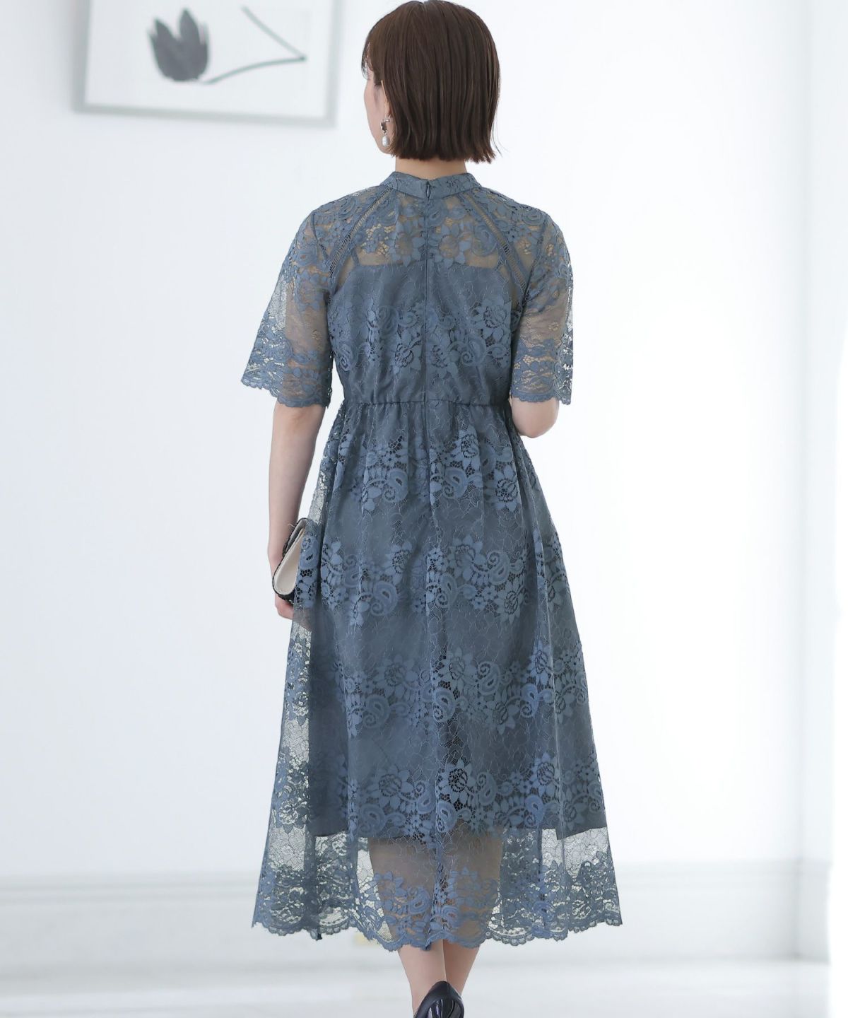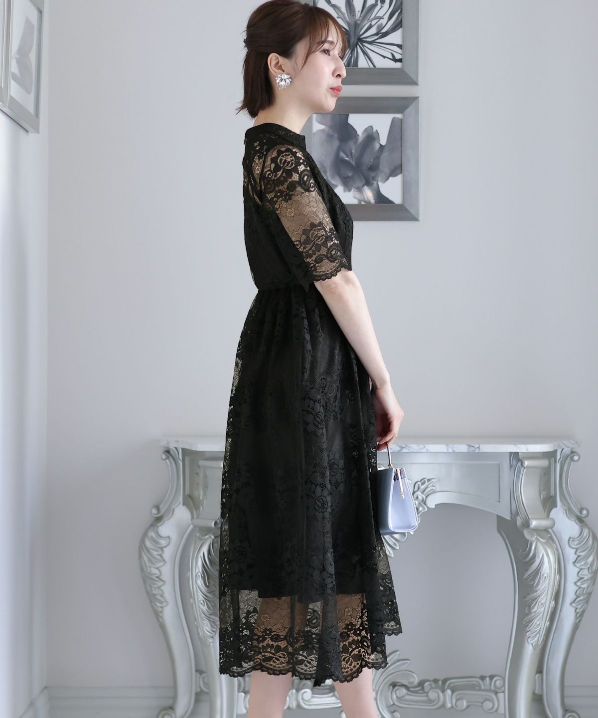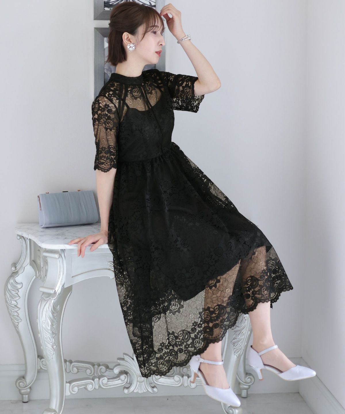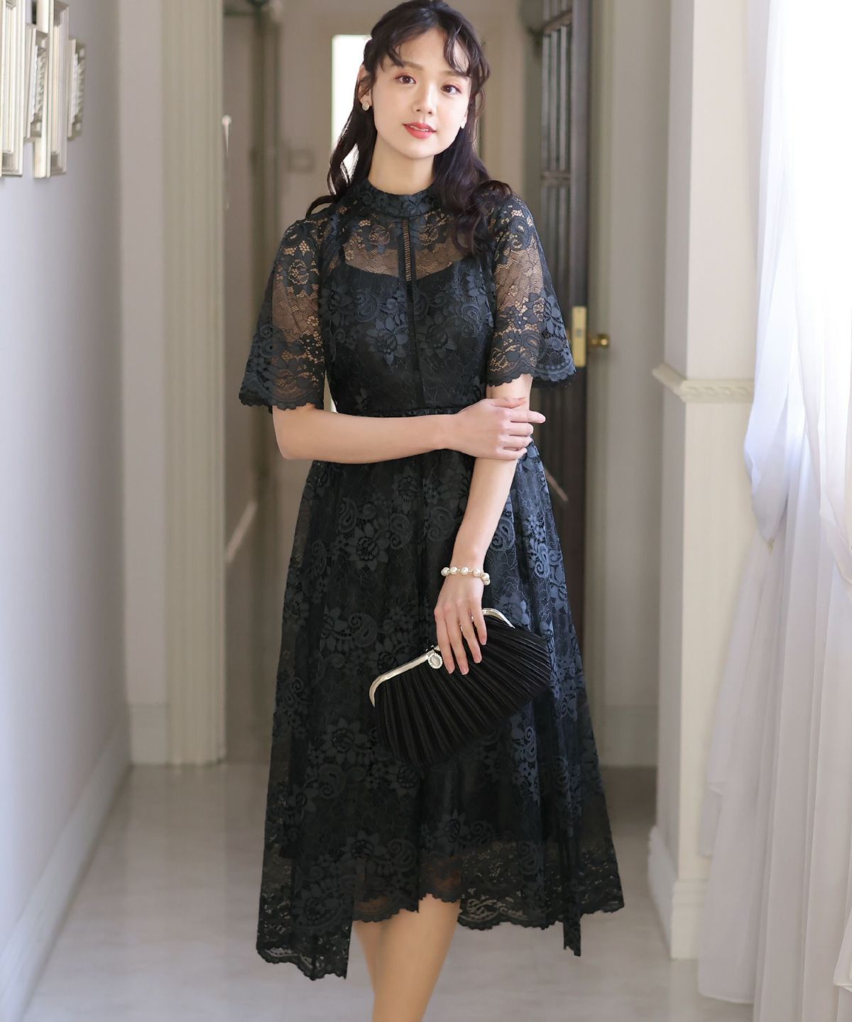 ■総レース×スカラップスカラップデザインが可愛い総レースワンピース。高めのウエストとふんわり広がるスカートで綺麗なAラインシルエットに。ウエスト背面がゴムになっているので着脱も楽ちん。オケージョンシーンはもちろん、特別なお食事会などにもピッタリです。