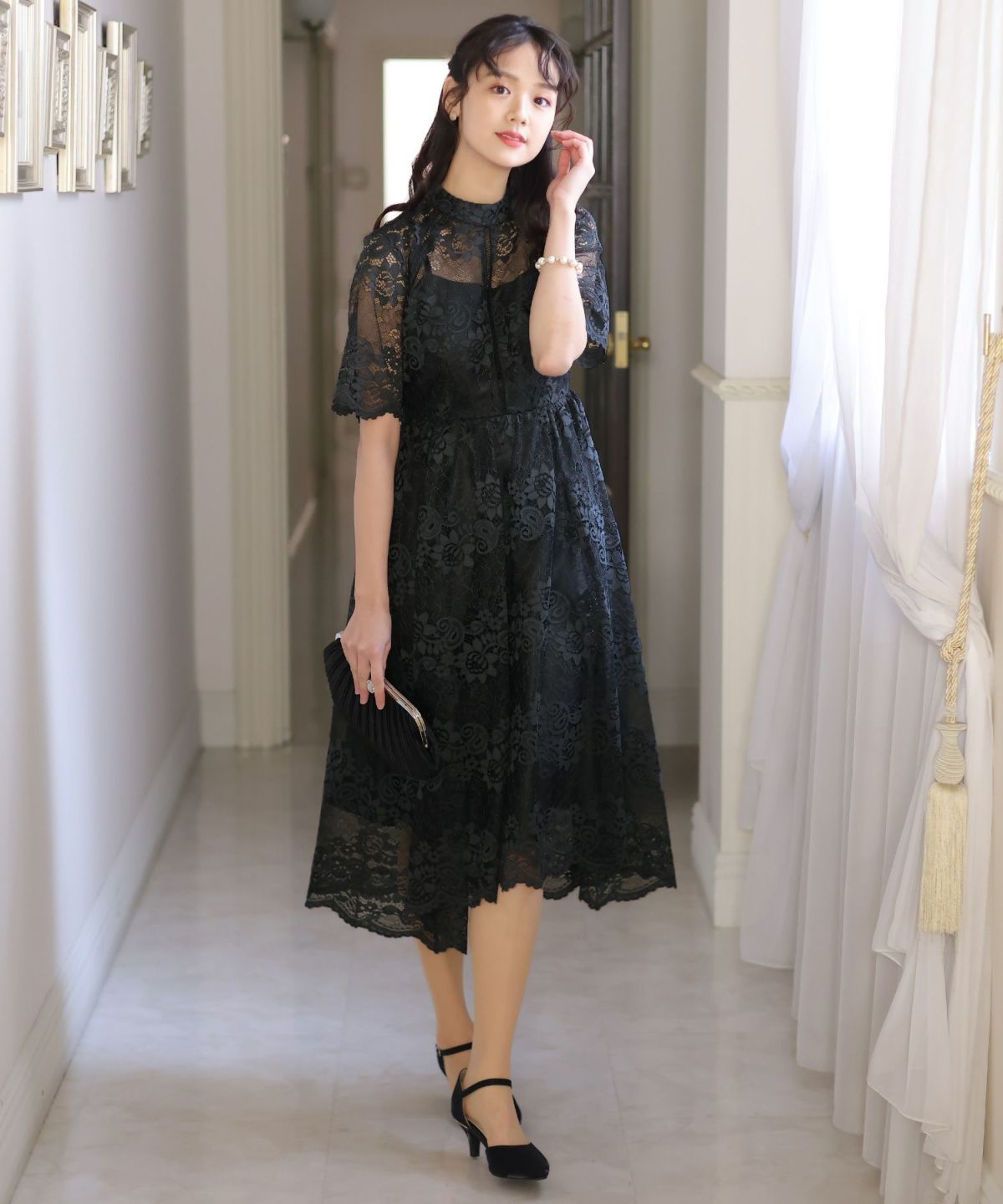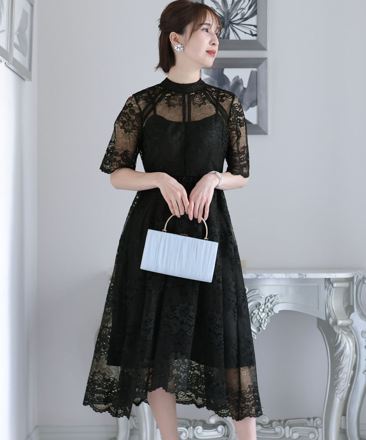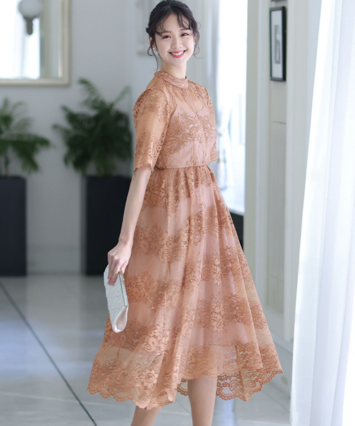 ■総レース×スカラップスカラップデザインが可愛い総レースワンピース。高めのウエストとふんわり広がるスカートで綺麗なAラインシルエットに。ウエスト背面がゴムになっているので着脱も楽ちん。オケージョンシーンはもちろん、特別なお食事会などにもピッタリです。