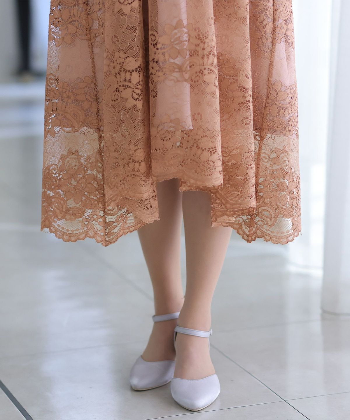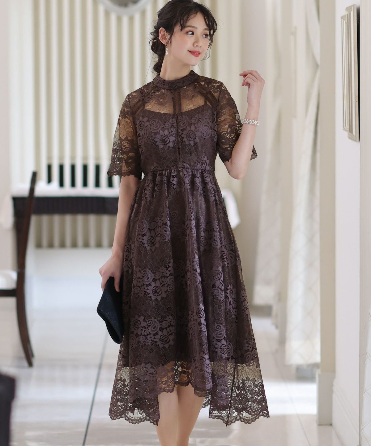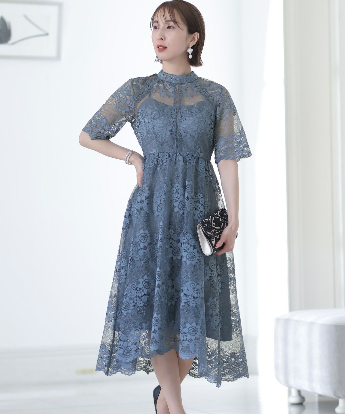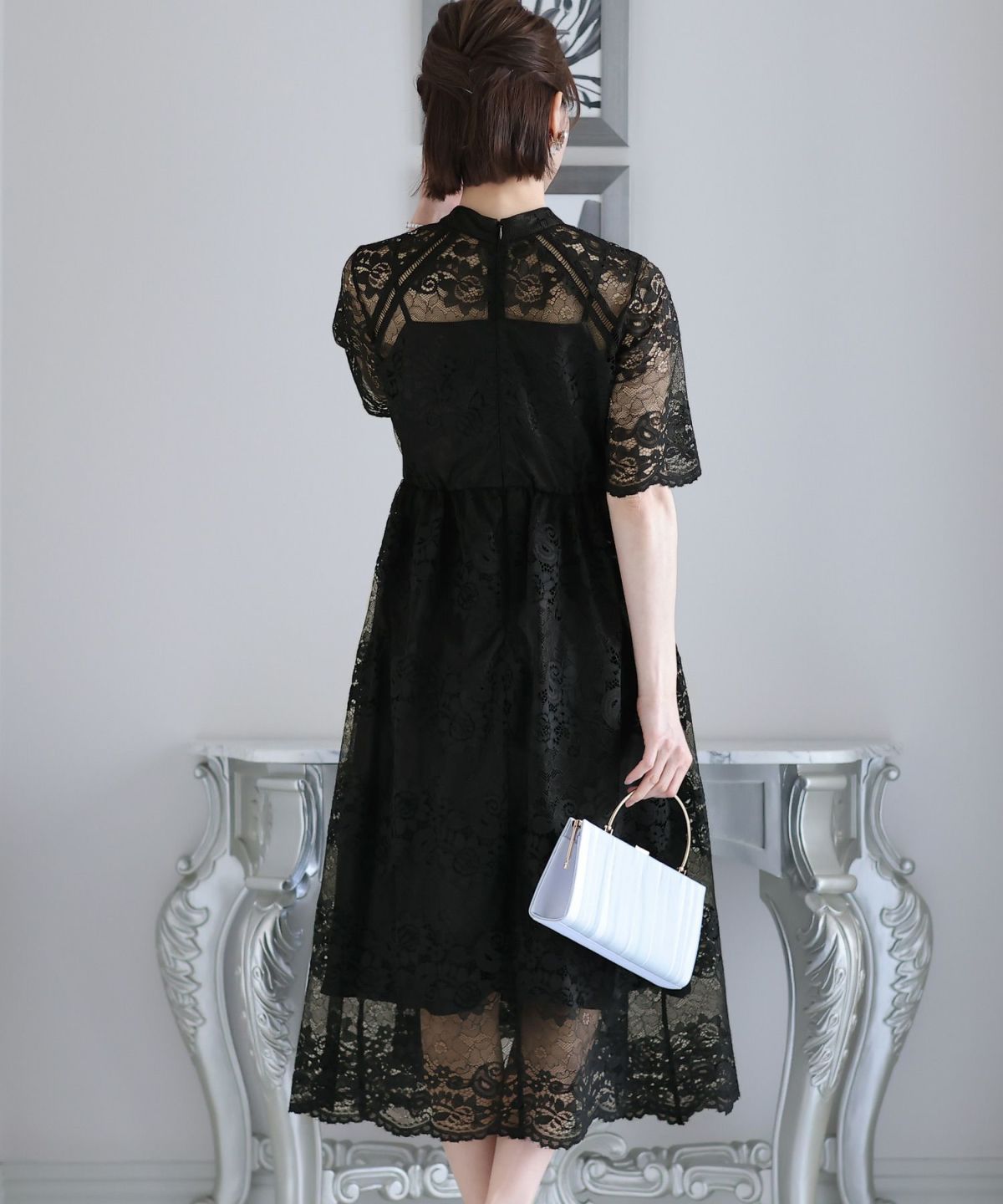 ■総レース×スカラップスカラップデザインが可愛い総レースワンピース。高めのウエストとふんわり広がるスカートで綺麗なAラインシルエットに。ウエスト背面がゴムになっているので着脱も楽ちん。オケージョンシーンはもちろん、特別なお食事会などにもピッタリです。