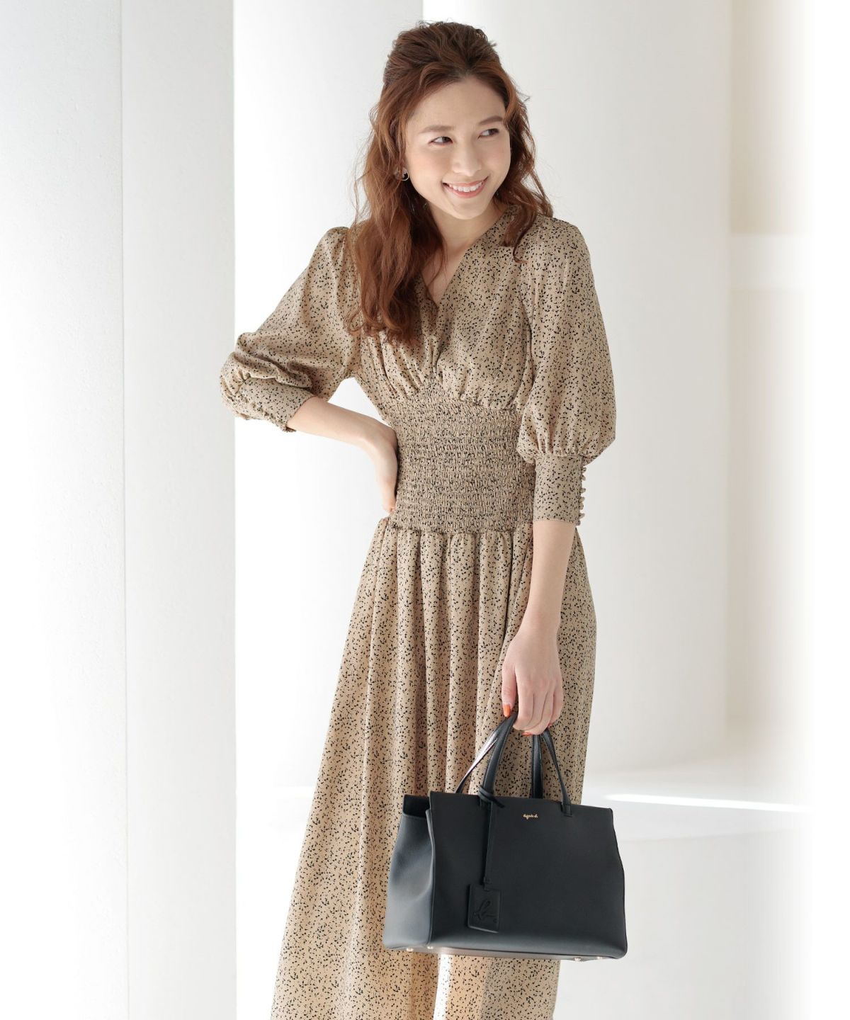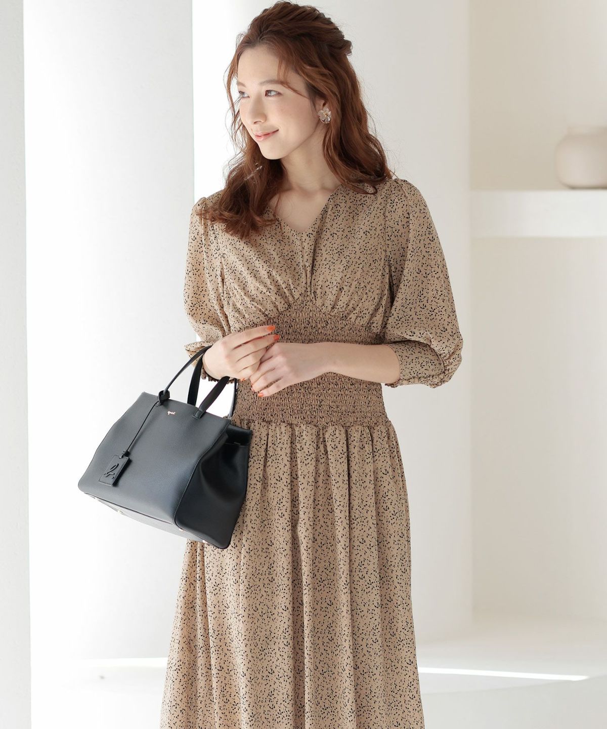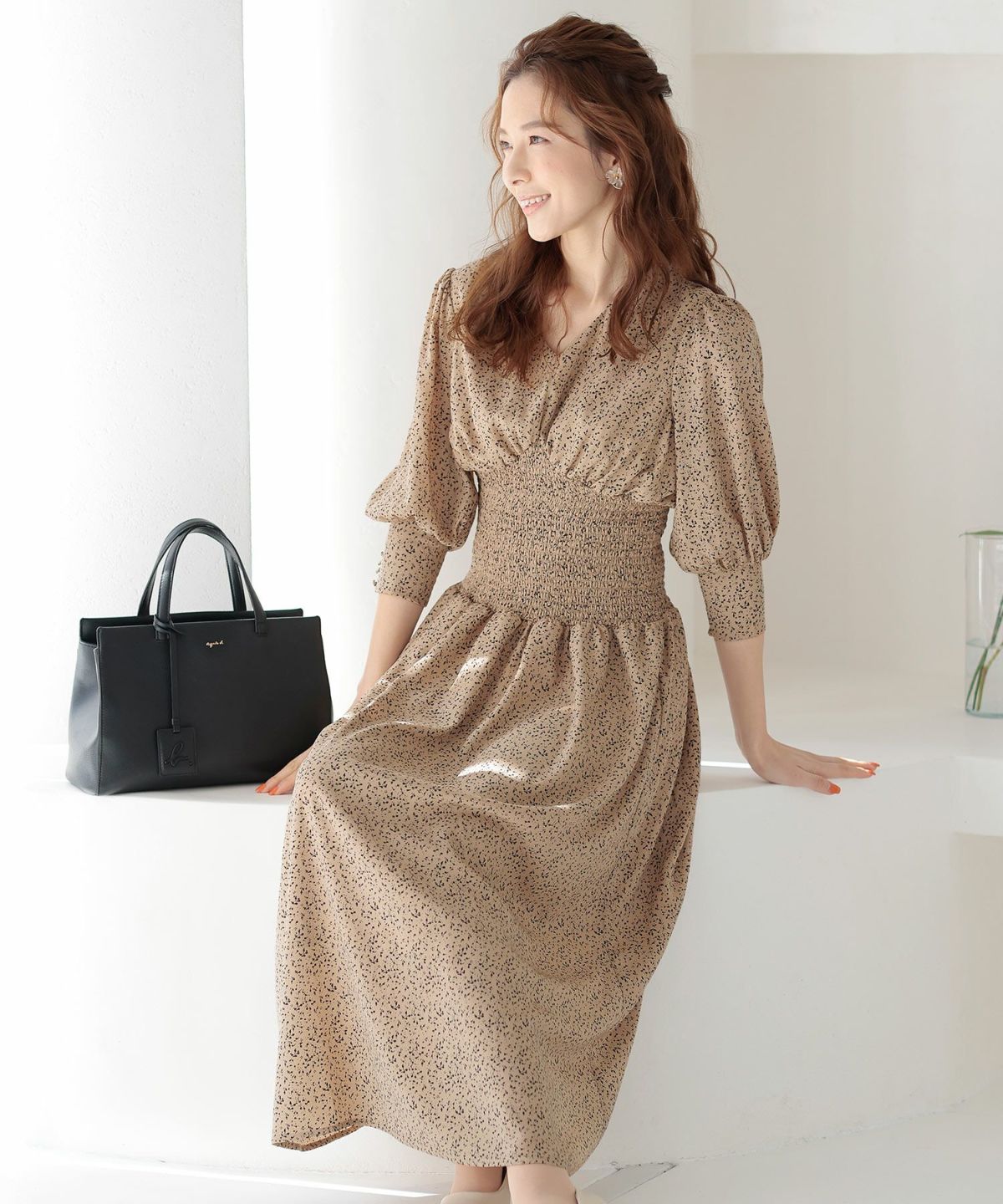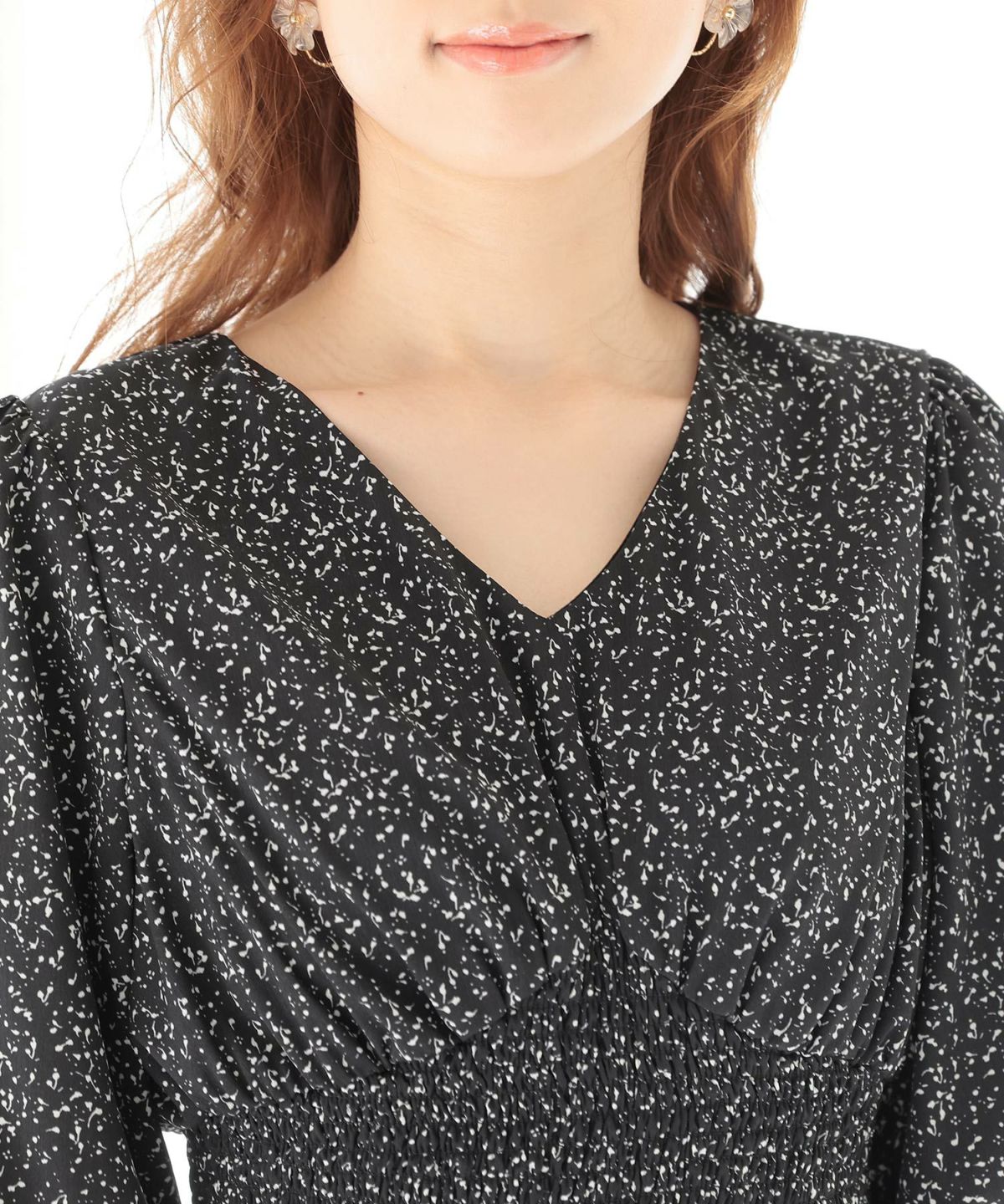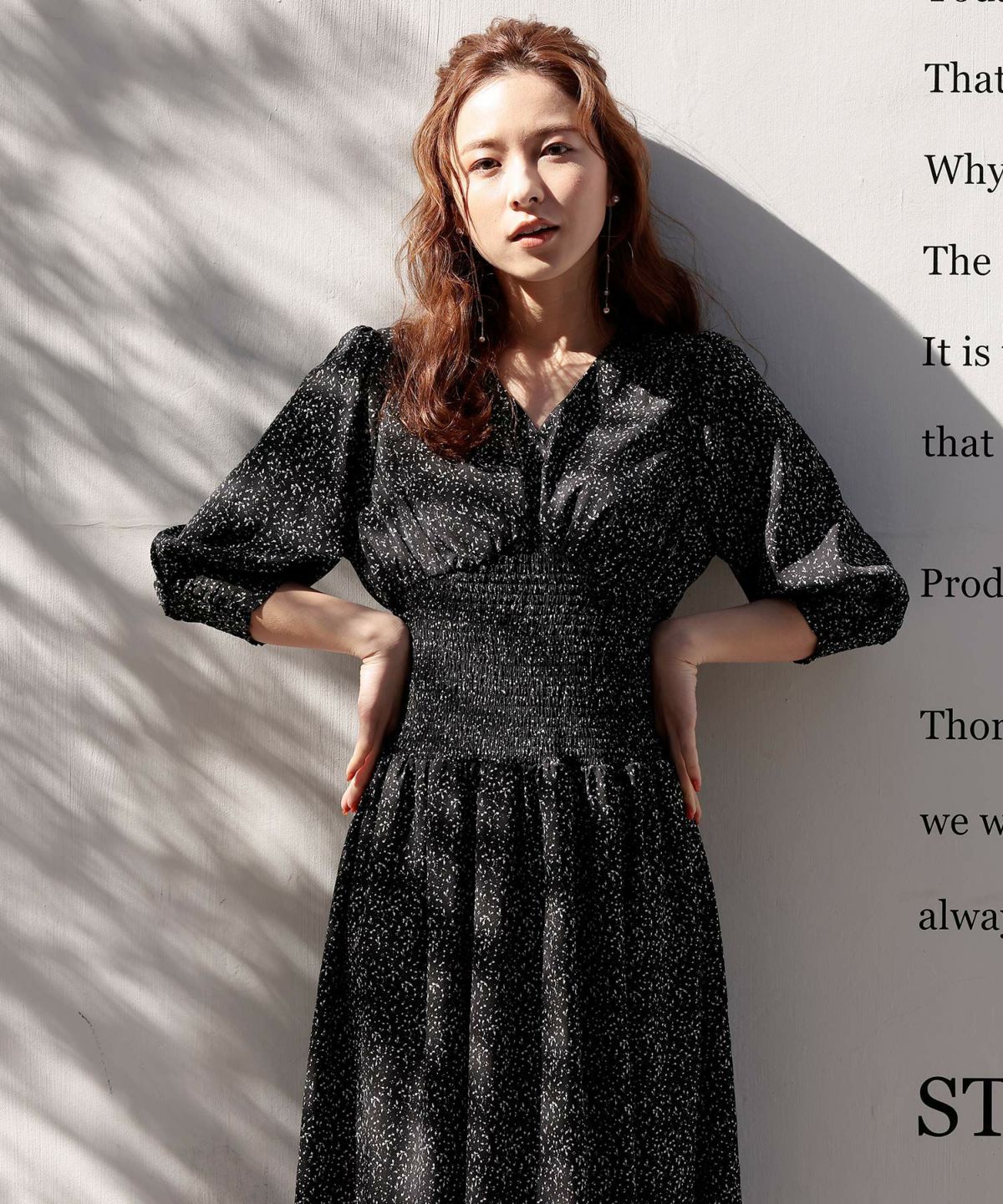 ブラウジング風の身頃とシャーリングが引き締まったウエストラインを演出してくれます。さらに小顔効果のあるVネックや、切り替え高めのデザインでバストラインも綺麗に見せてくれるのが嬉しい♪