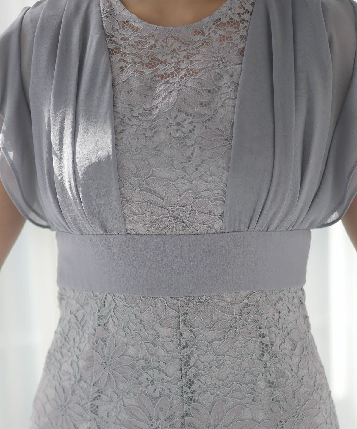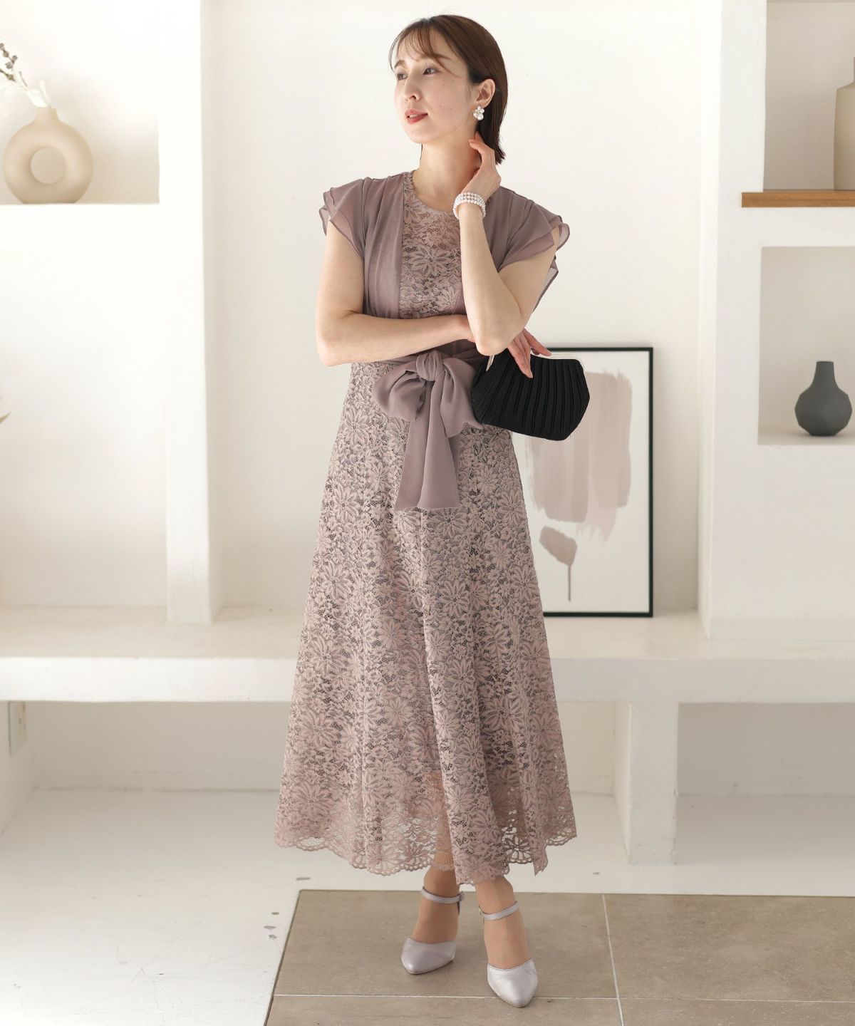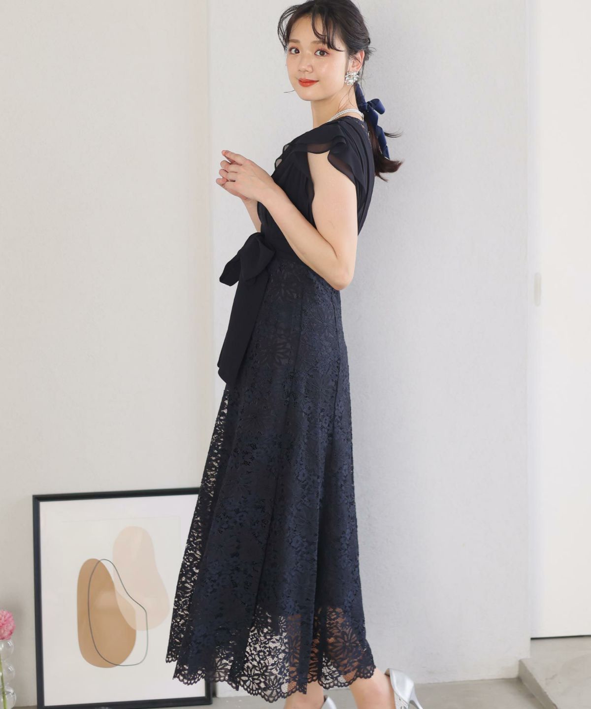 ■花柄レースが華やかで女性らしい体型カバーポイント:【脚】【ウエスト】【ヒップ】フレンチスリーブ丈ですがシフォンのふわっと感が気になる肩周りをカバー。太目のウエストマークでスタイルアップ効果も。