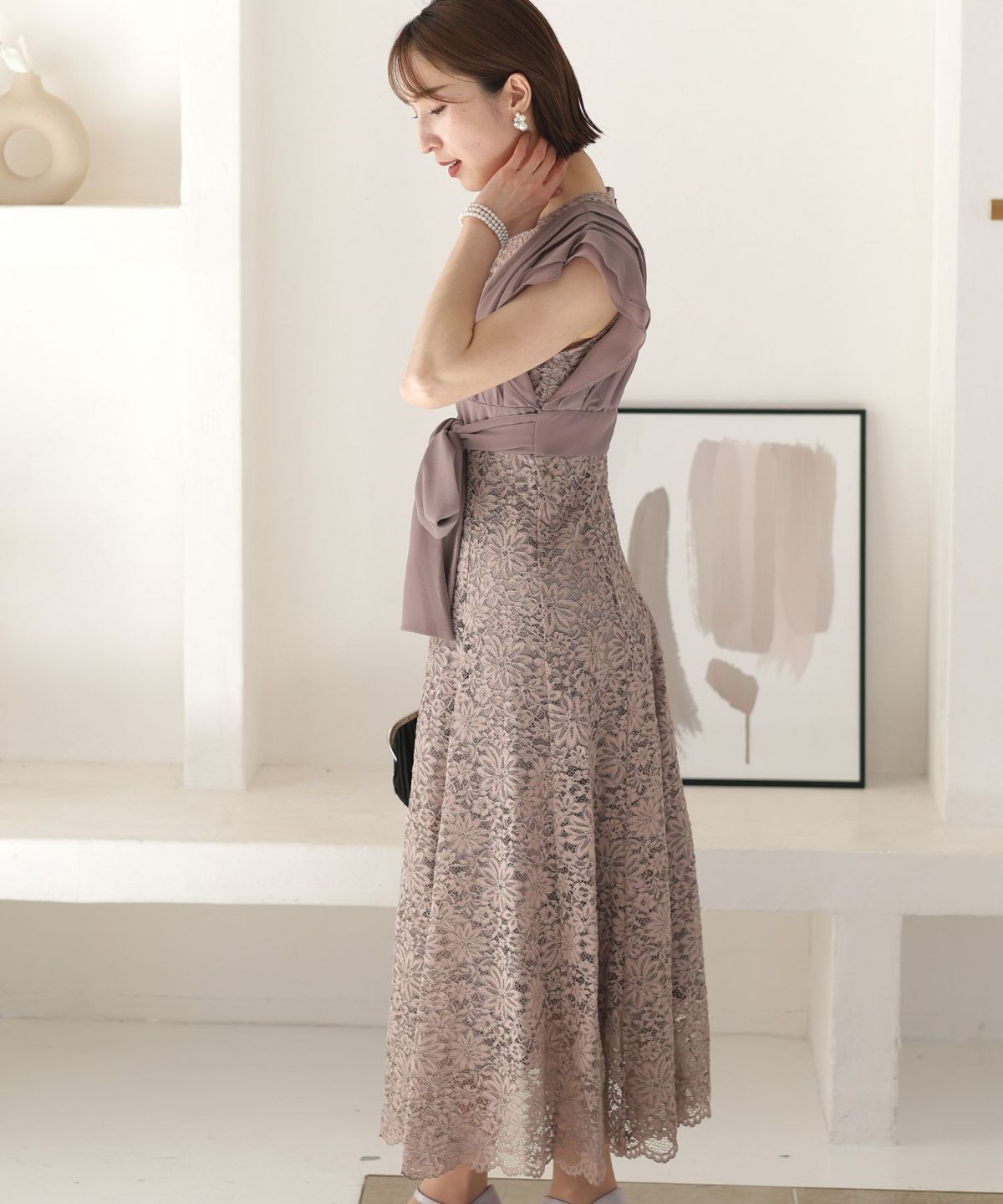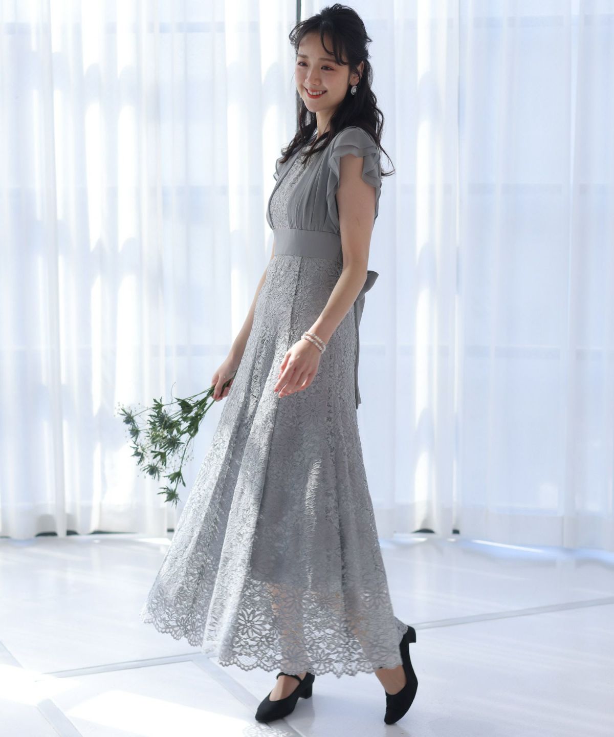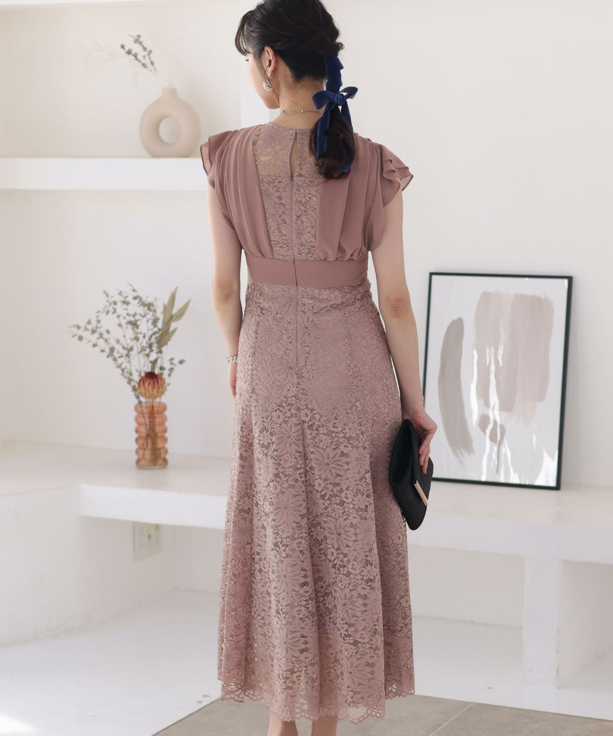 ■花柄レースが華やかで女性らしい体型カバーポイント:【脚】【ウエスト】【ヒップ】フレンチスリーブ丈ですがシフォンのふわっと感が気になる肩周りをカバー。太目のウエストマークでスタイルアップ効果も。