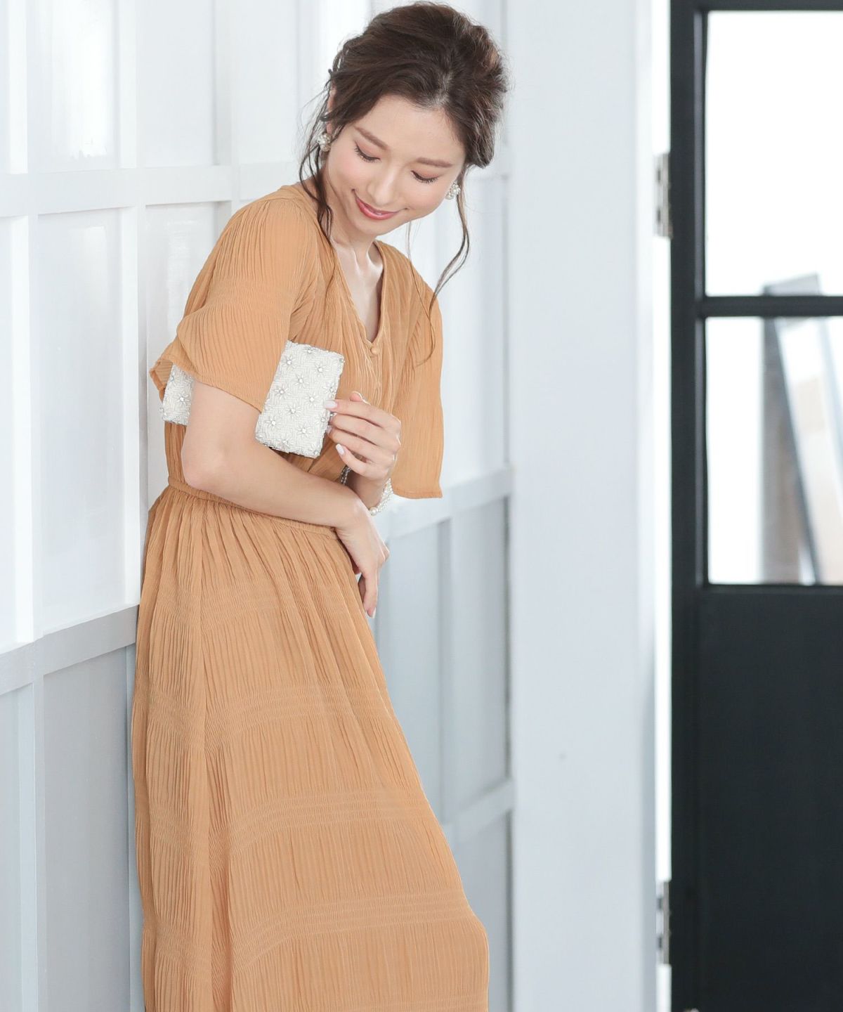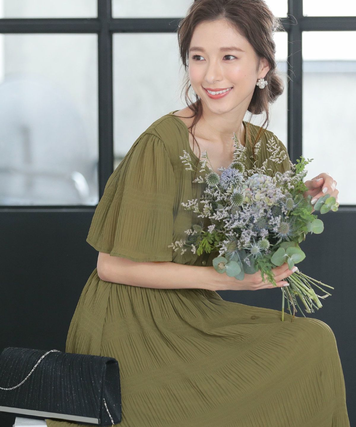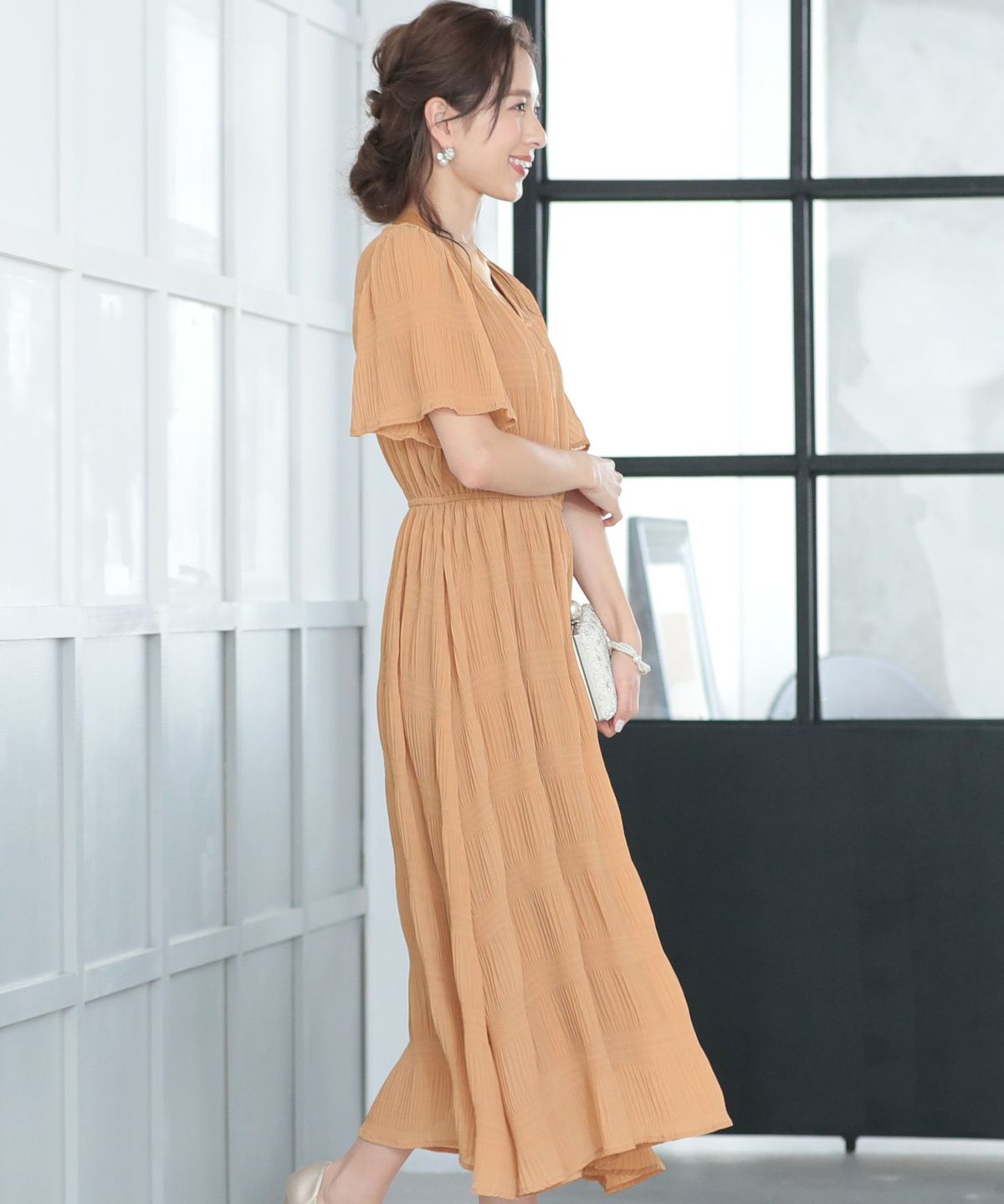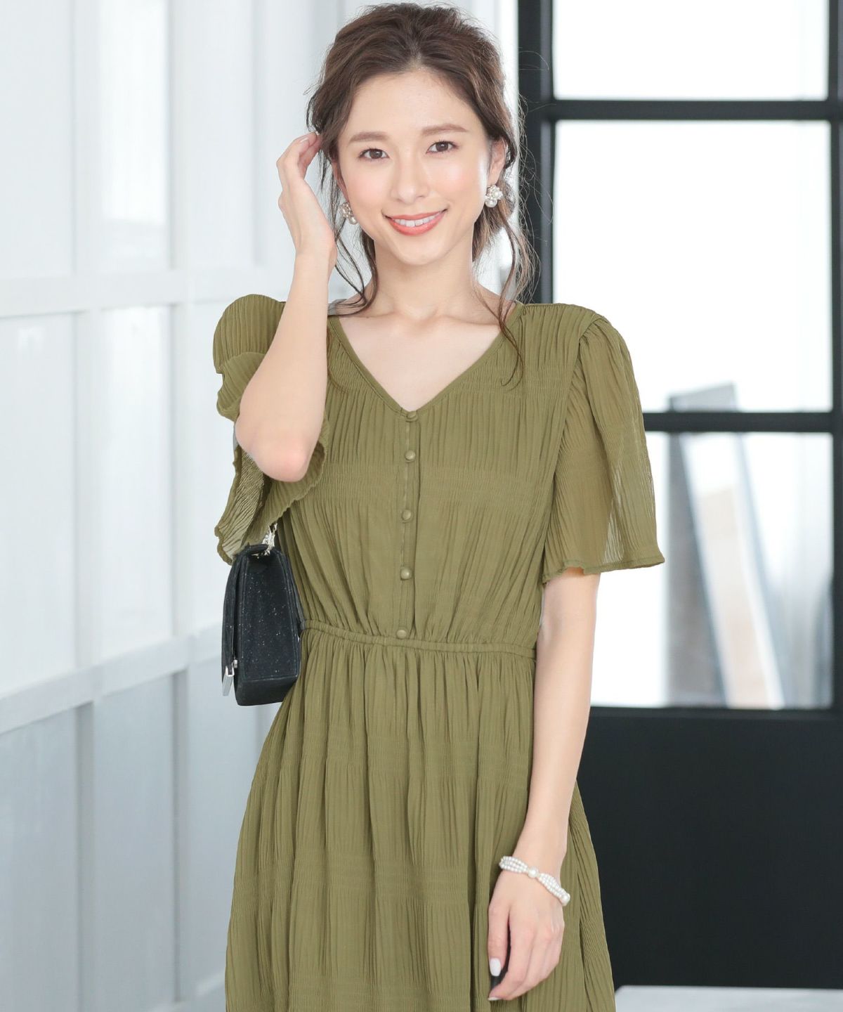 全体にティアード加工が施された華やかなシフォンワンピース。小顔効果のある深めのVネックがエレガントなレディ感を演出します♪