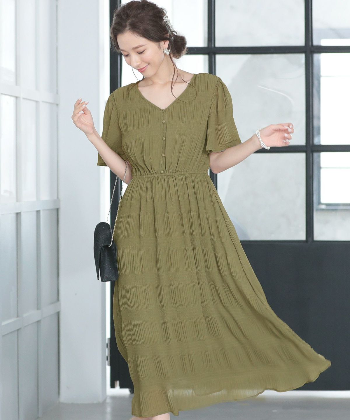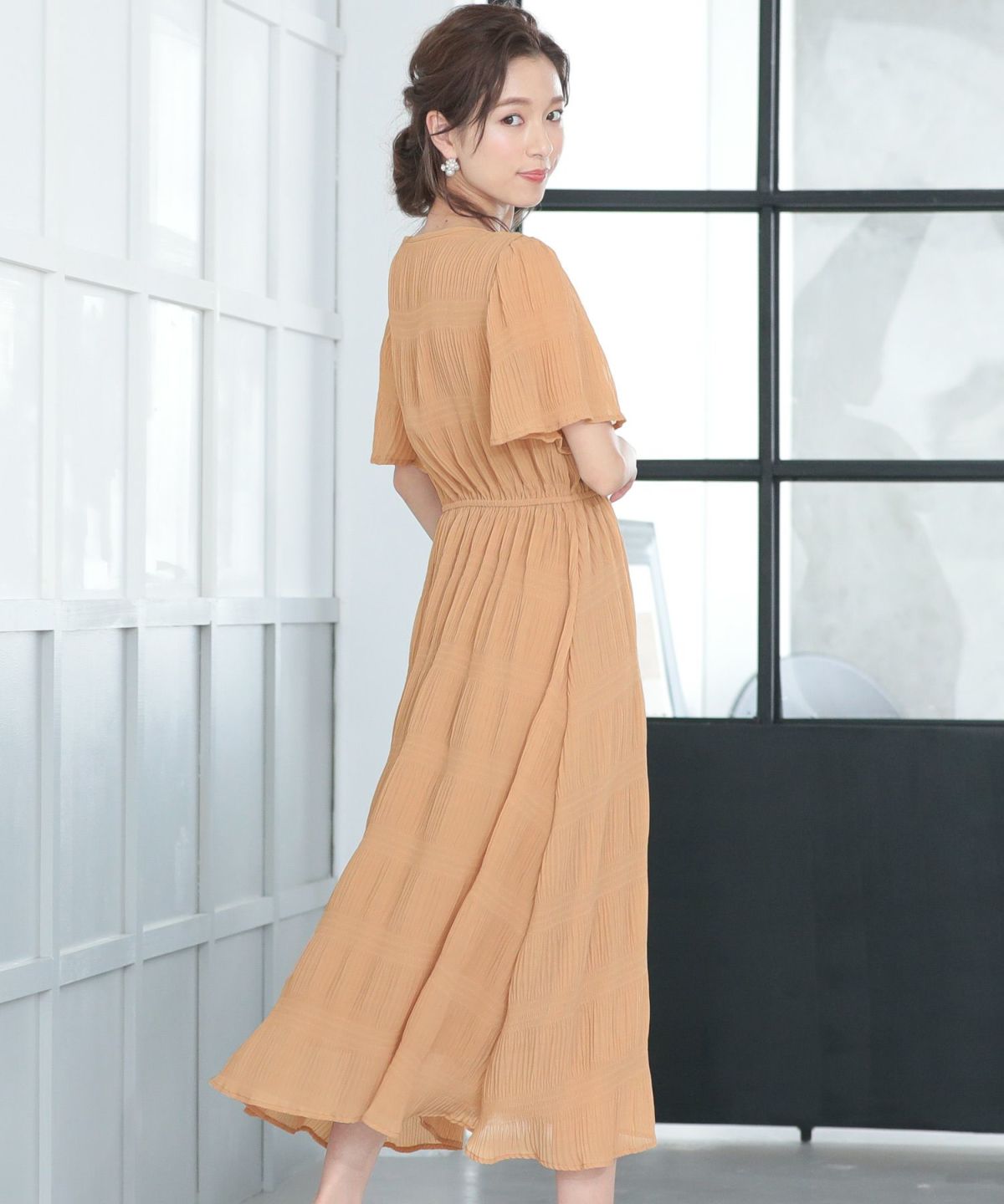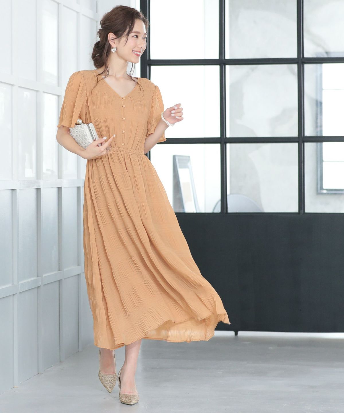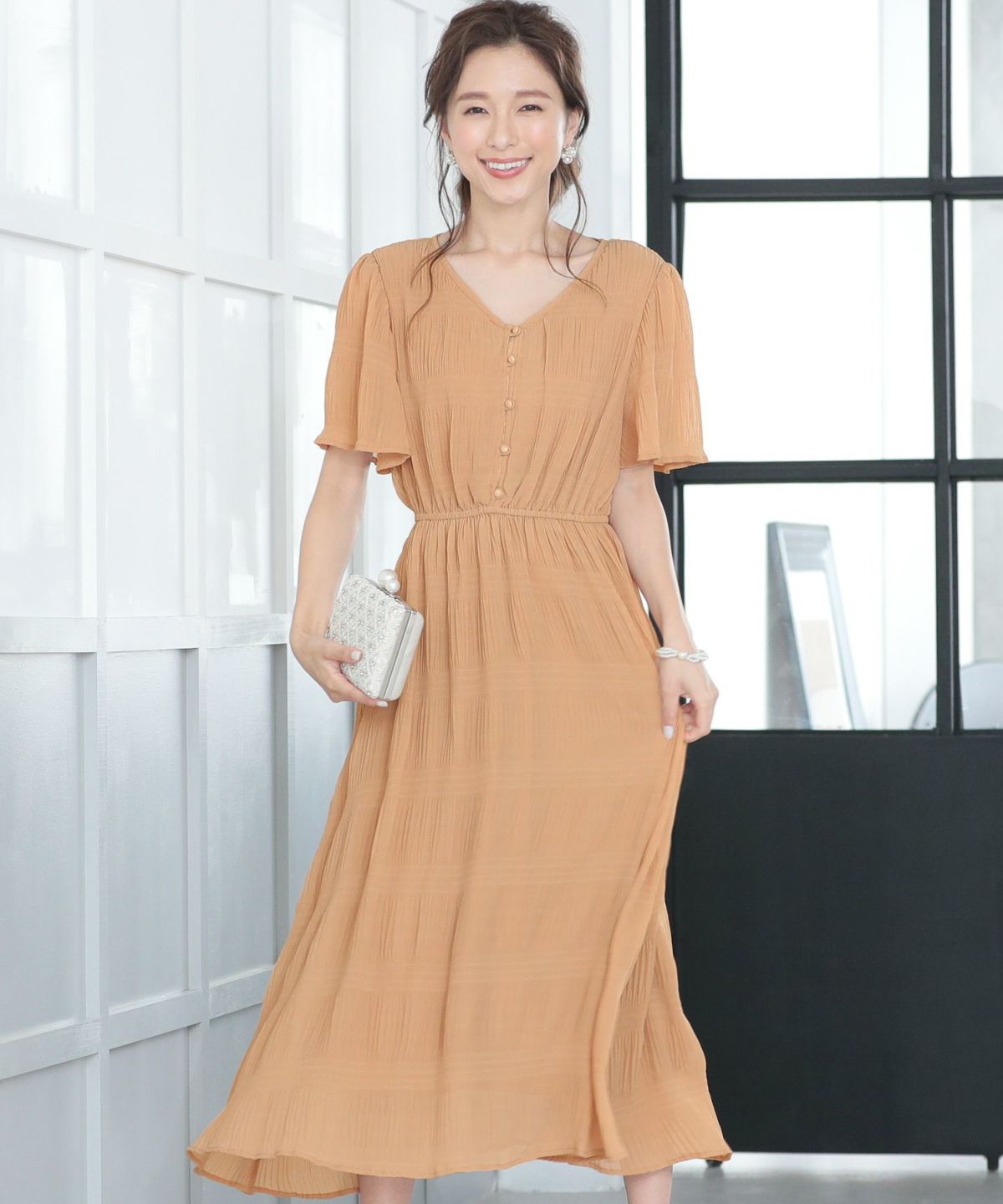 全体にティアード加工が施された華やかなシフォンワンピース。小顔効果のある深めのVネックがエレガントなレディ感を演出します♪