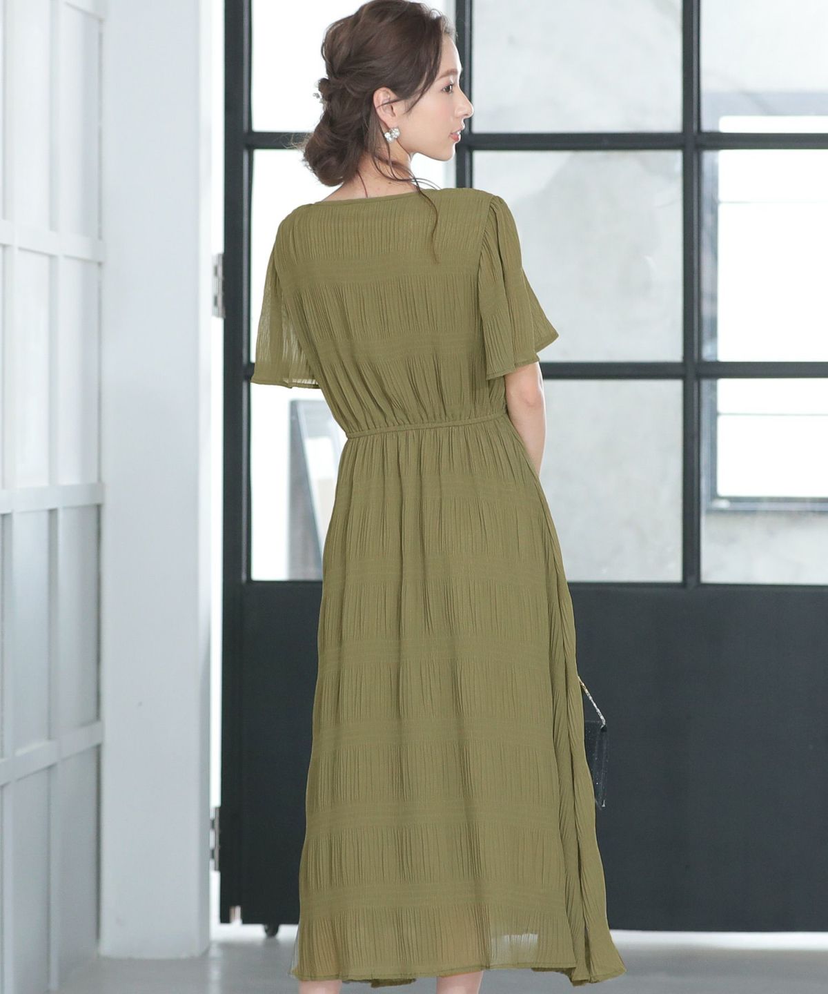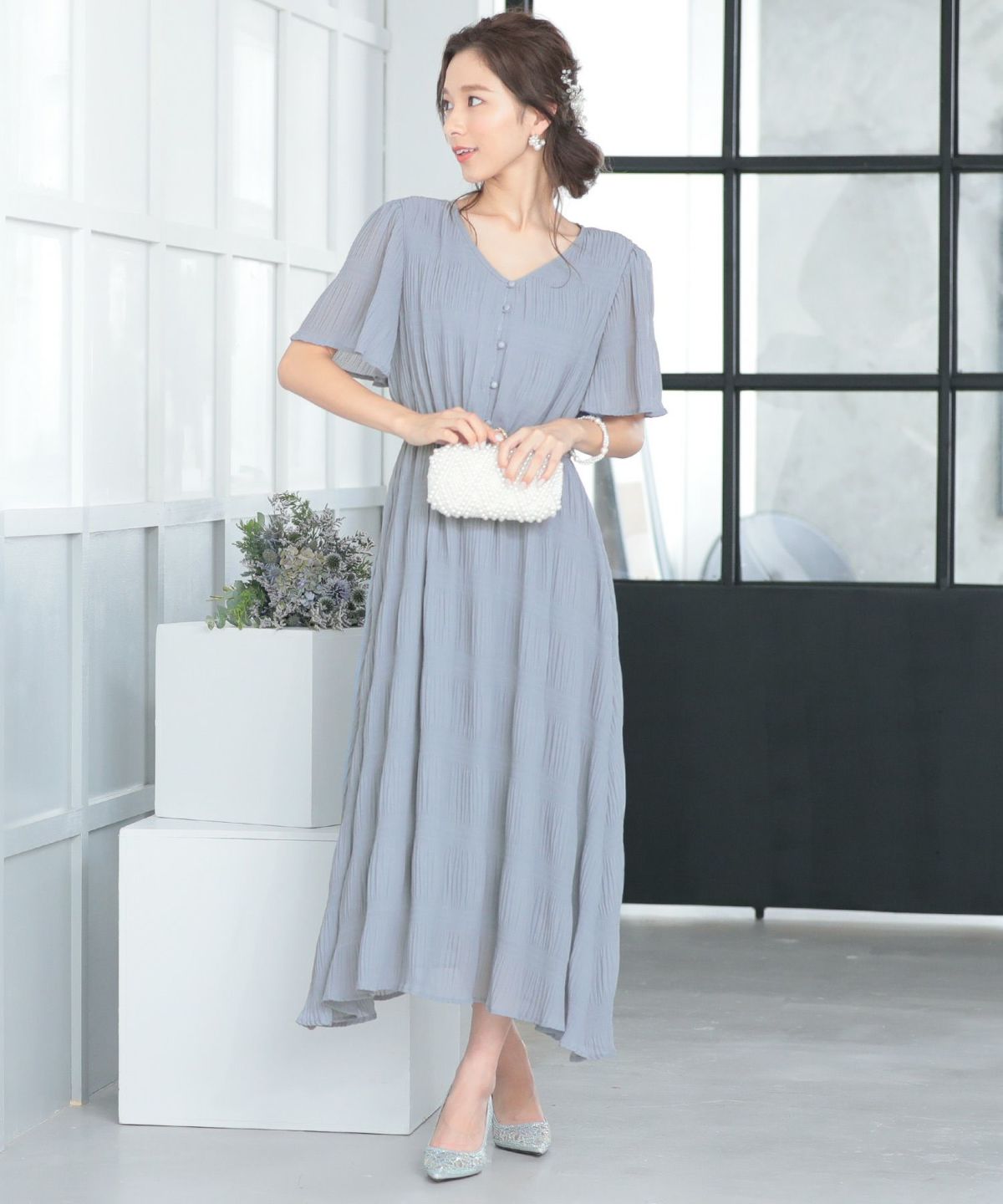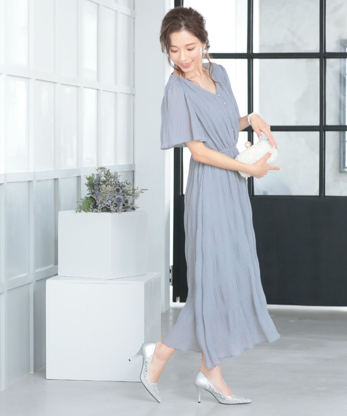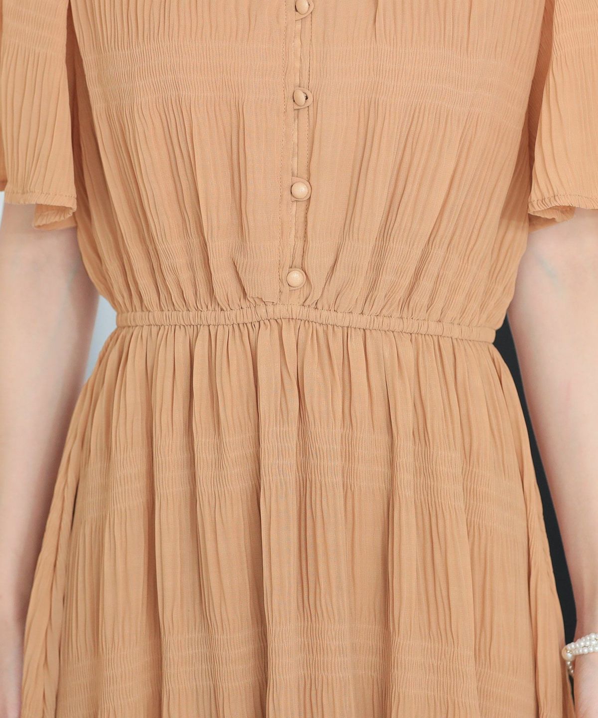 全体にティアード加工が施された華やかなシフォンワンピース。小顔効果のある深めのVネックがエレガントなレディ感を演出します♪
