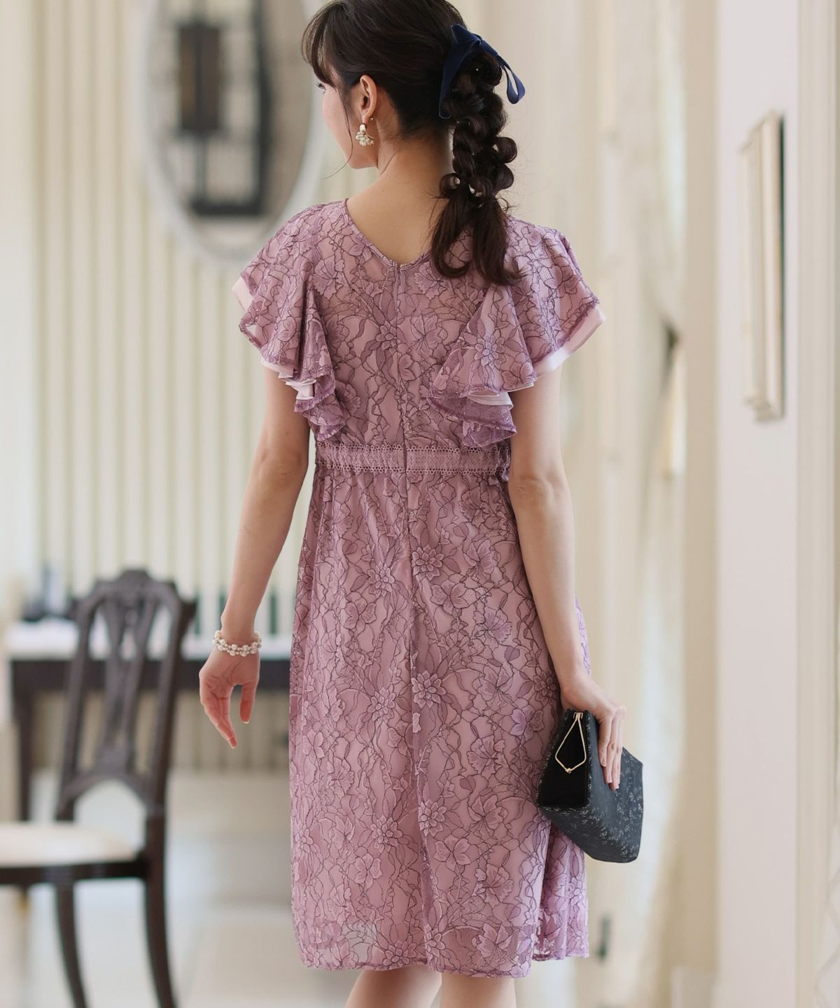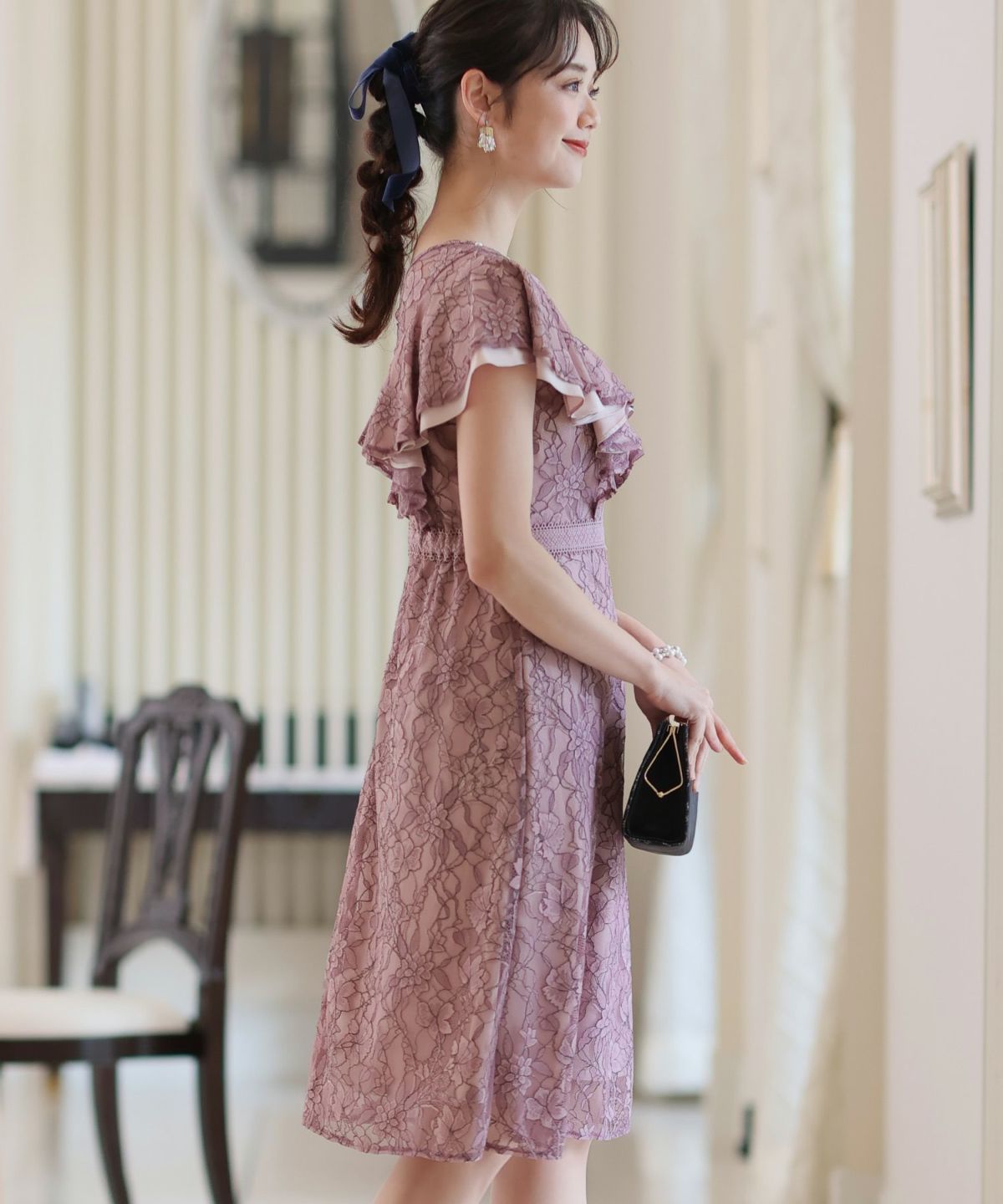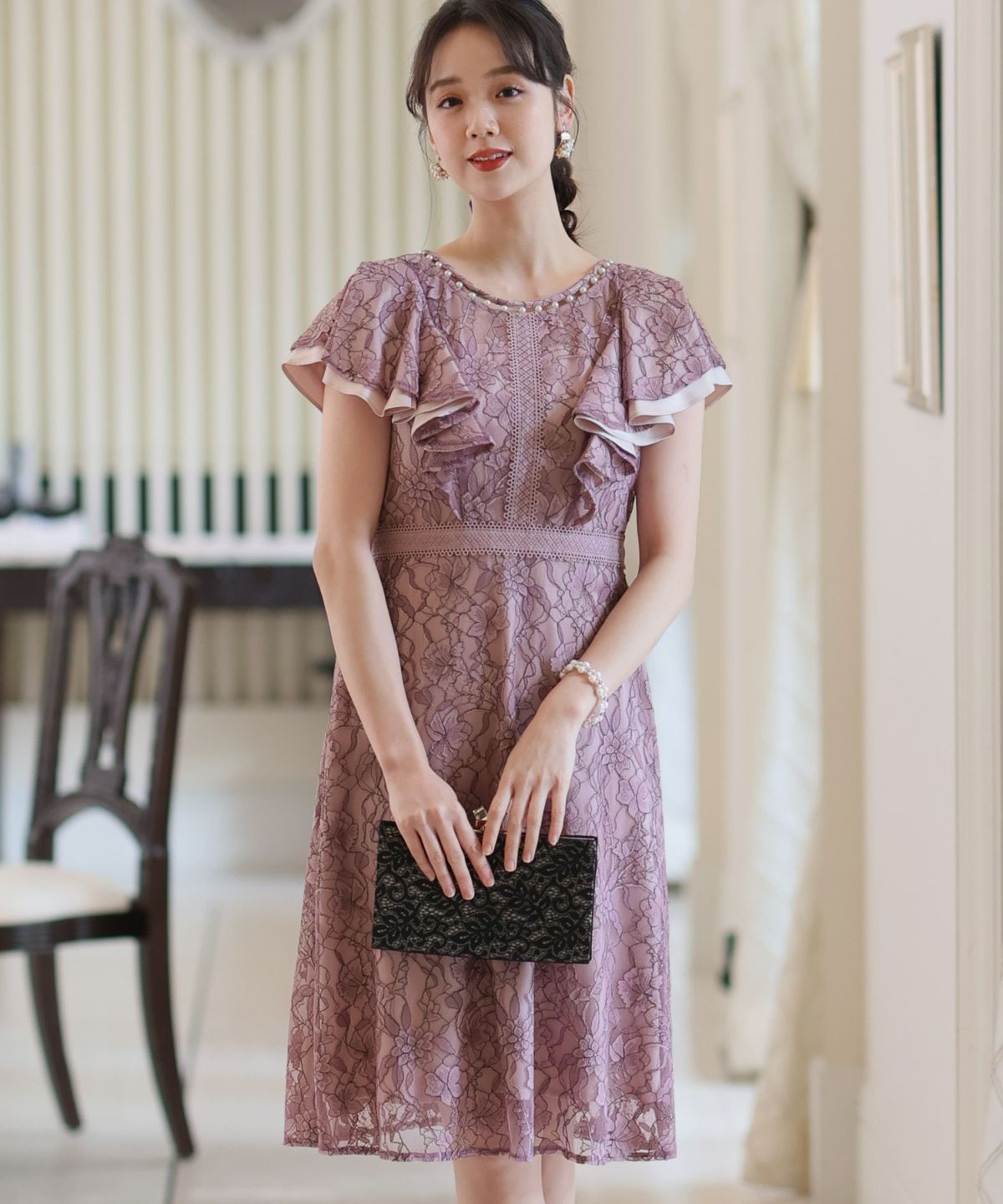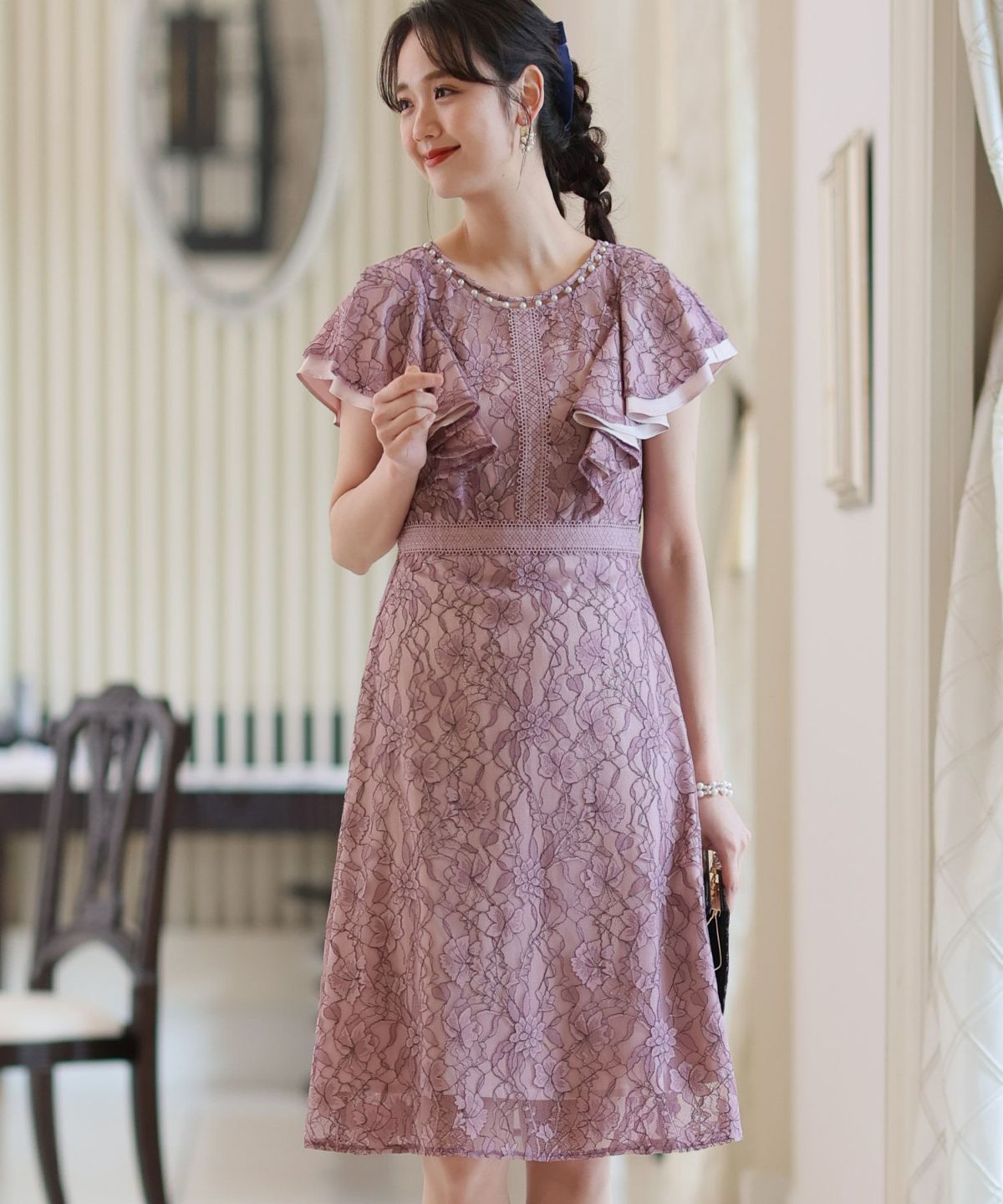 ■フリル×パールラッフルスリーブとネックラインのパールが可愛いワンピースです。配色レースとレーステープの組み合わせがおしゃれ。袖のフリルデザインが甘めでフェミニンな印象に。オケージョンはもちろん、特別な日のお出かけにもおすすめです。