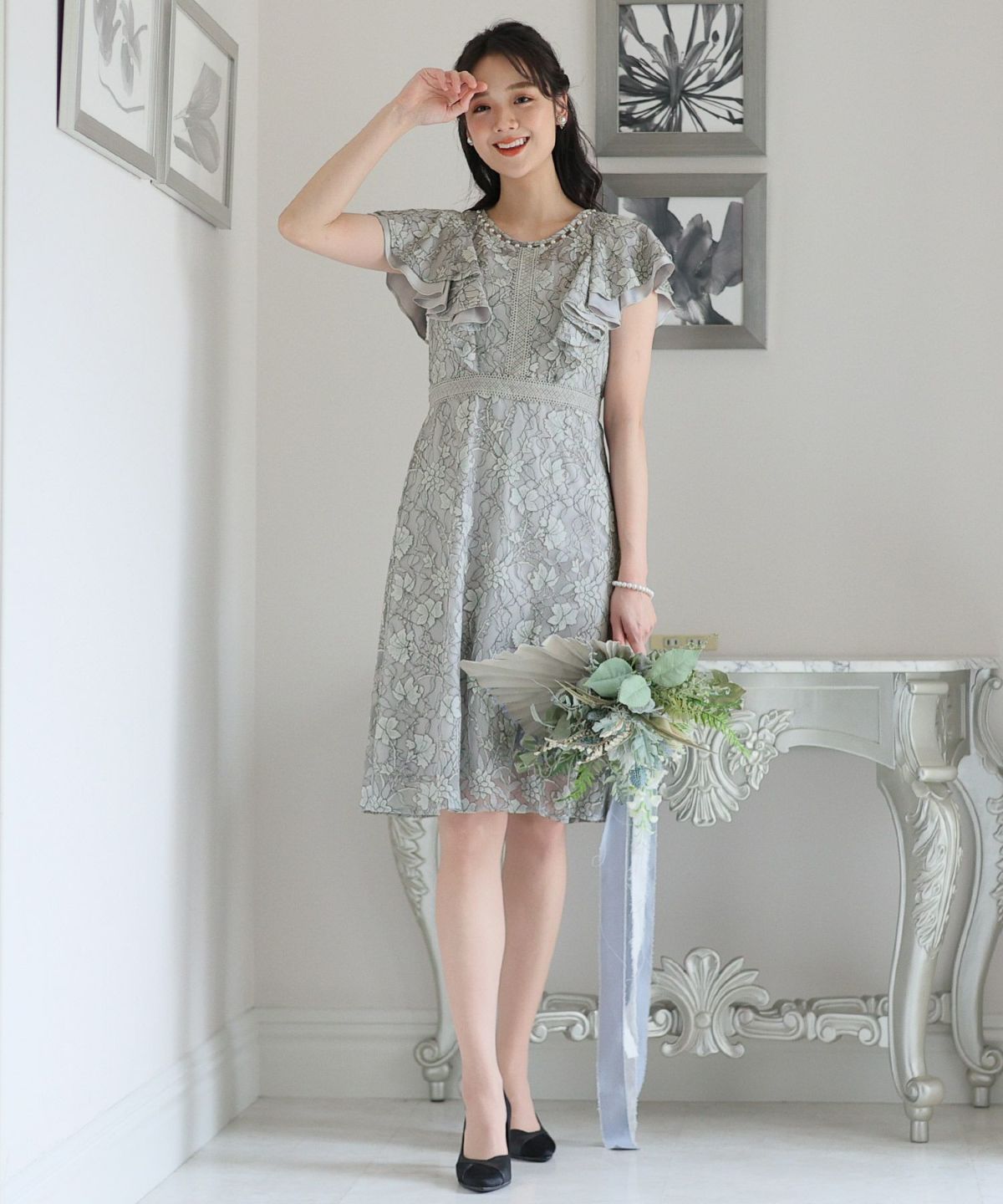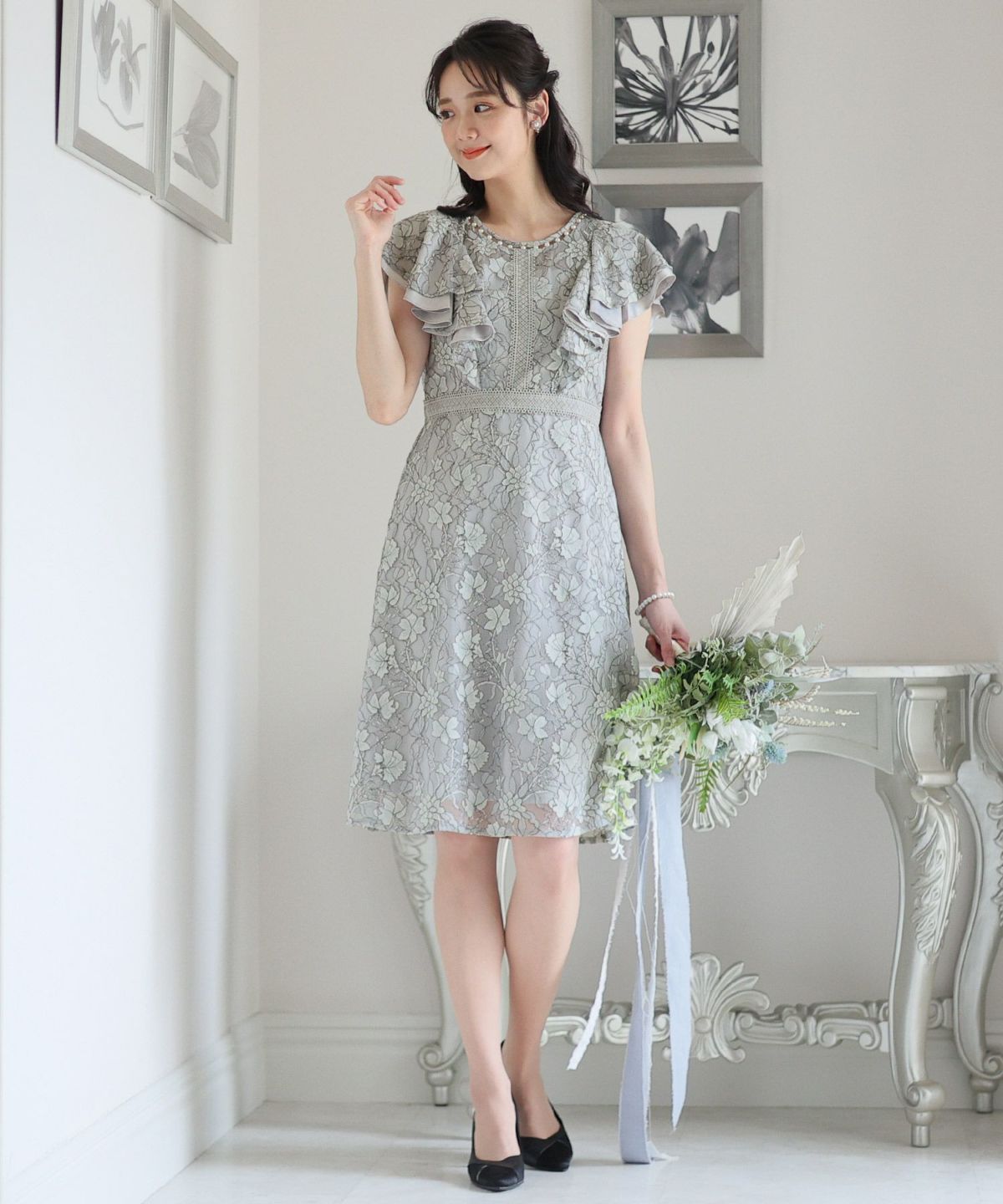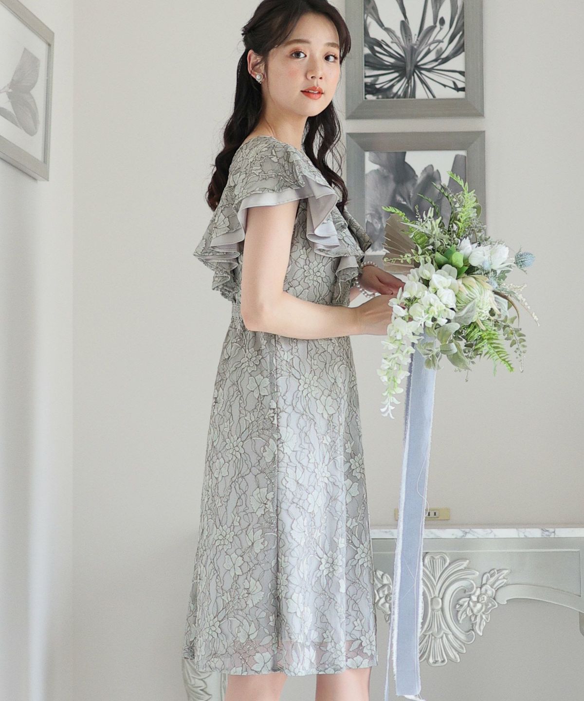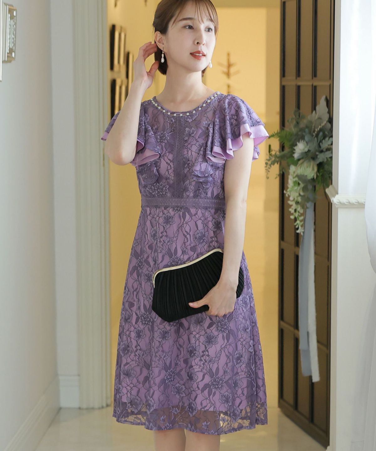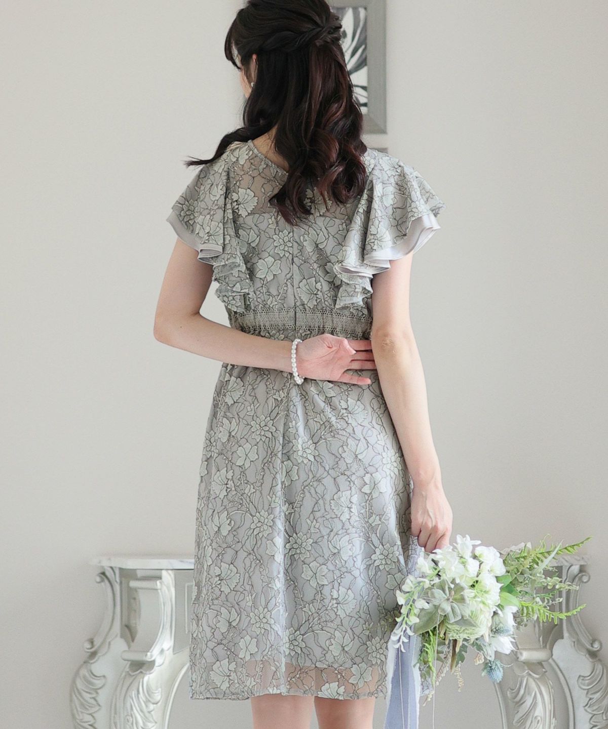 ■フリル×パールラッフルスリーブとネックラインのパールが可愛いワンピースです。配色レースとレーステープの組み合わせがおしゃれ。袖のフリルデザインが甘めでフェミニンな印象に。オケージョンはもちろん、特別な日のお出かけにもおすすめです。