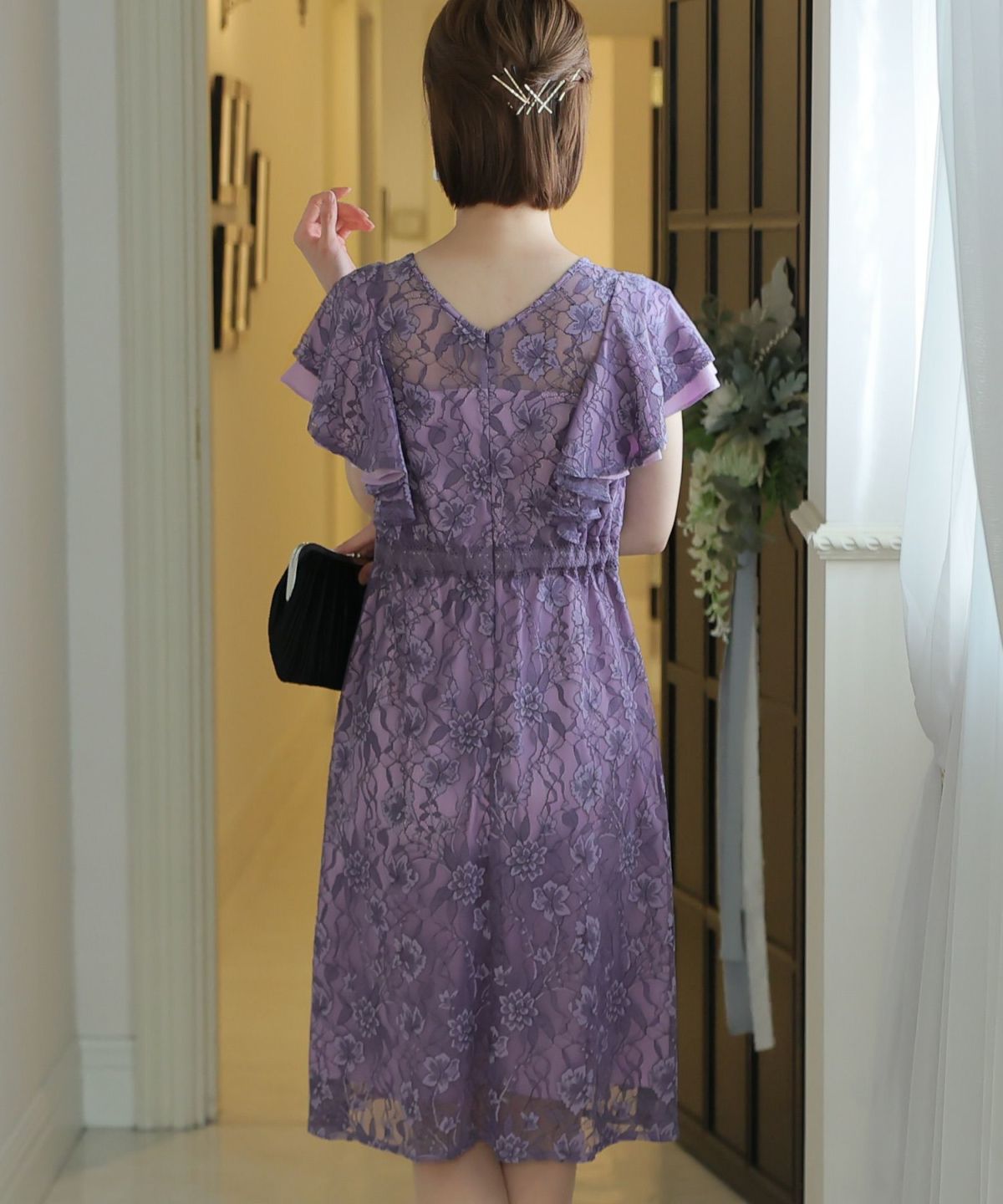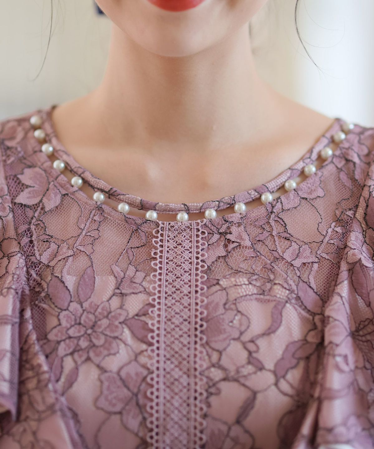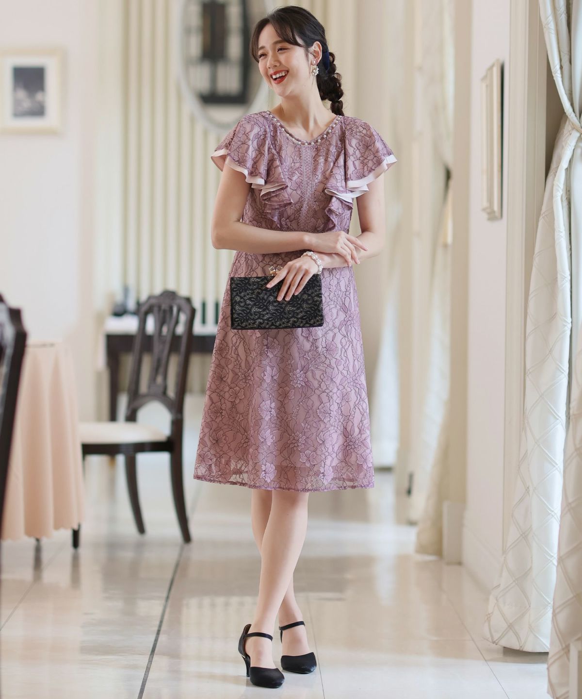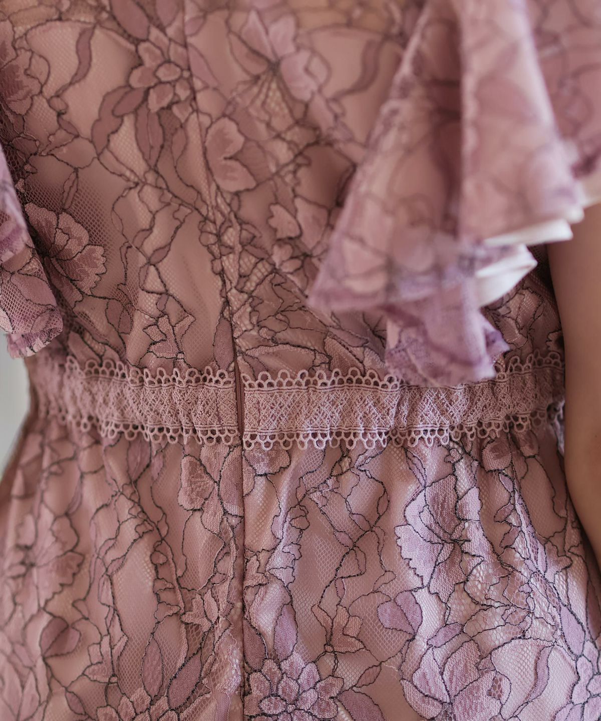 ■フリル×パールラッフルスリーブとネックラインのパールが可愛いワンピースです。配色レースとレーステープの組み合わせがおしゃれ。袖のフリルデザインが甘めでフェミニンな印象に。オケージョンはもちろん、特別な日のお出かけにもおすすめです。