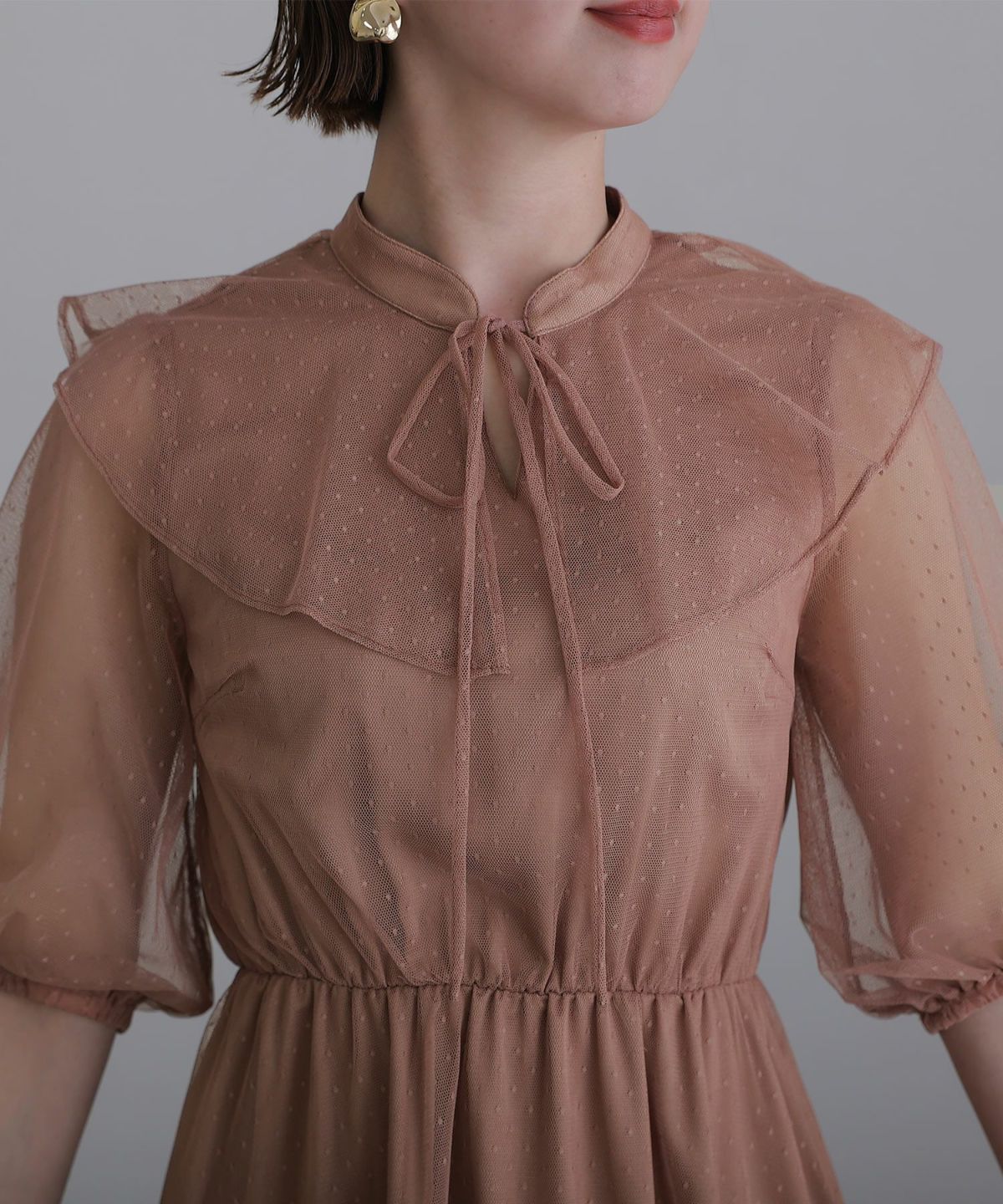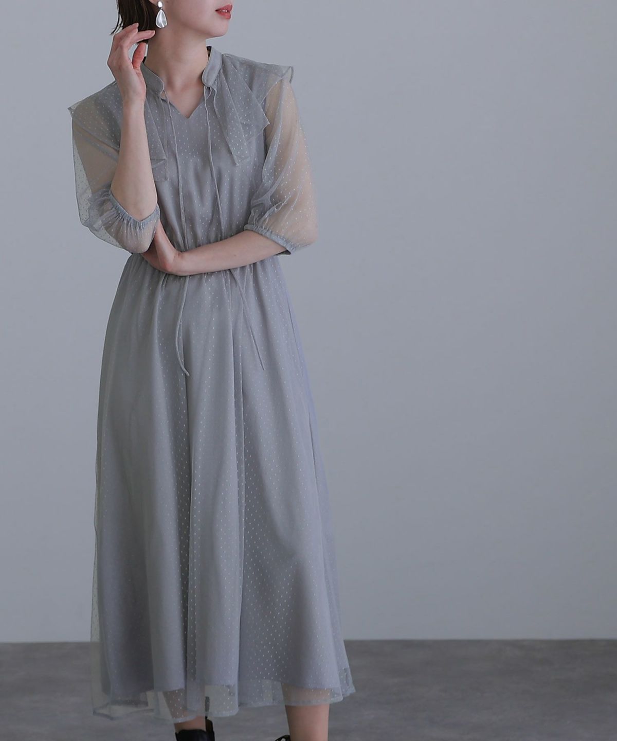 ■ドット柄×ビッグカラードット柄のチュールが可愛いワンピースです。トレンドのビッグカラーがおしゃれなデザイン。フロントのリボンでさらに可愛さアップ◎デートや女子会など様々なシーンで使いやすいアイテムです。