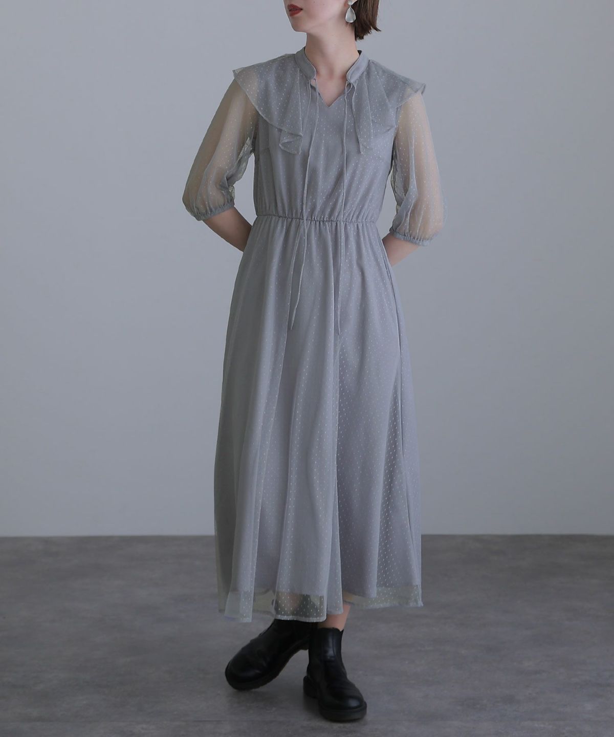 ■大きな襟のデザインで小顔効果も◎体型カバーポイント:【二の腕】【脚】【ウエスト】【ヒップ】Aラインシルエットなので気になる下半身も隠してくれます。高めのウエスト切り替えでスタイルアップ効果も期待できます。