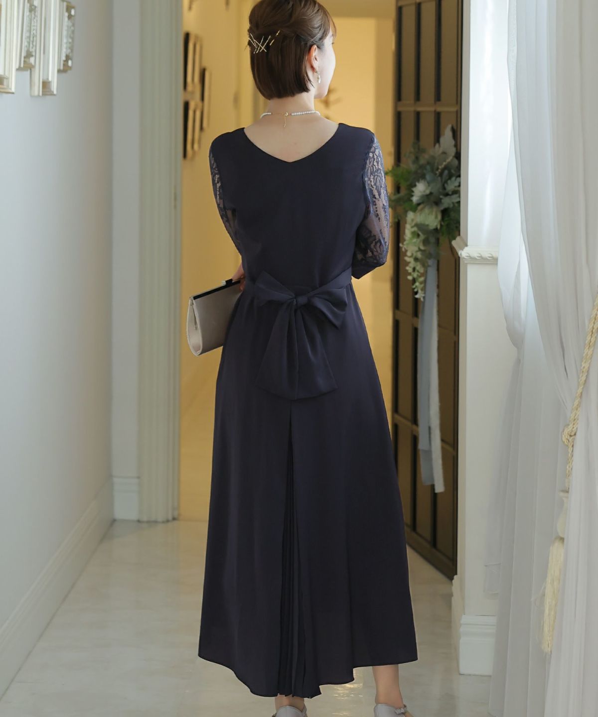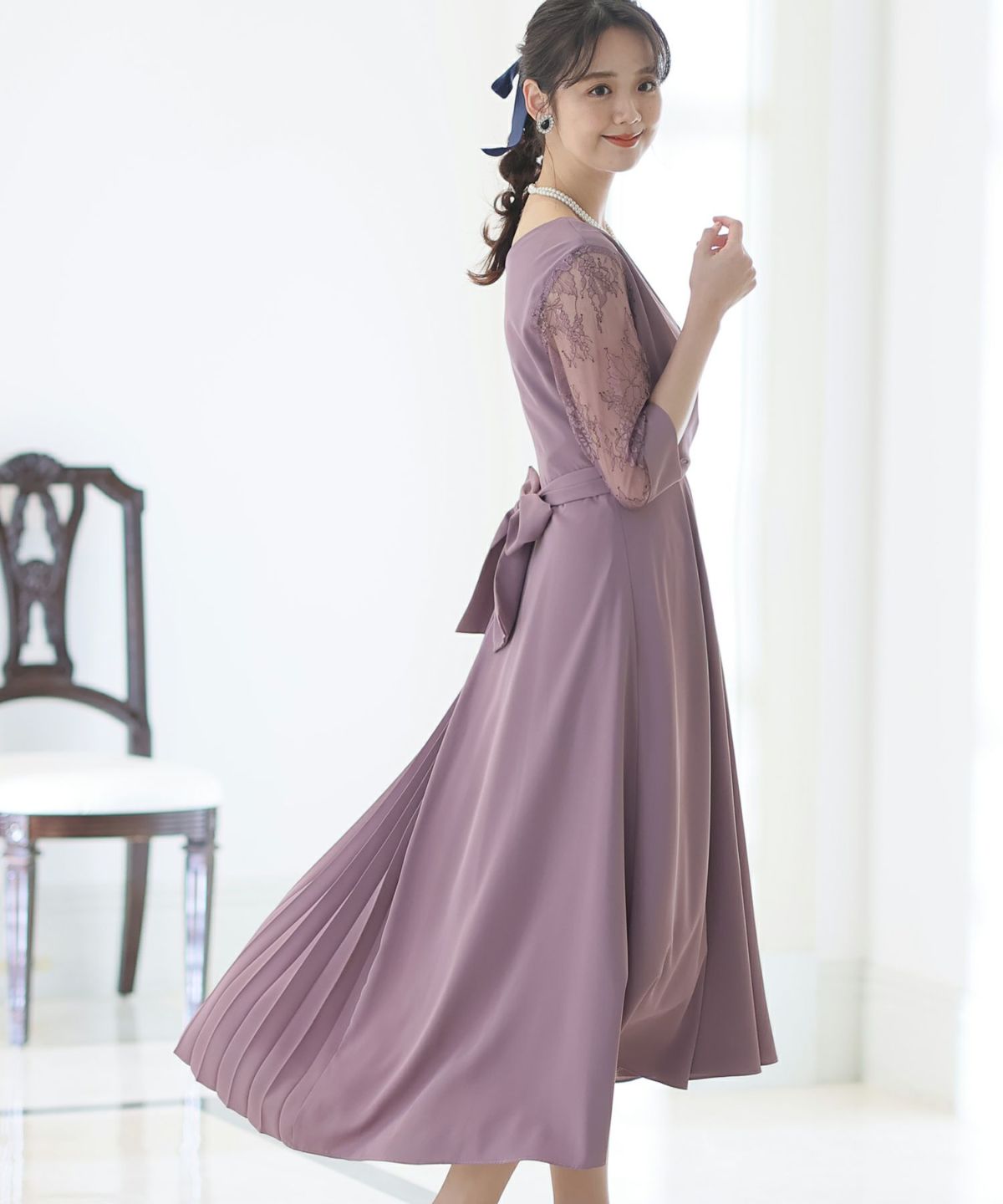■リボン×プリーツバックセンターに入ったプリーツデザインが可愛いワンピースです。コードレースに切り替えられたスリーブ部分の透け感が可愛い。ウエスト部分のリボンは前後ろどちらで結んでも◎オケージョンはもちろん、特別な日のお出かけにもおすすめです。