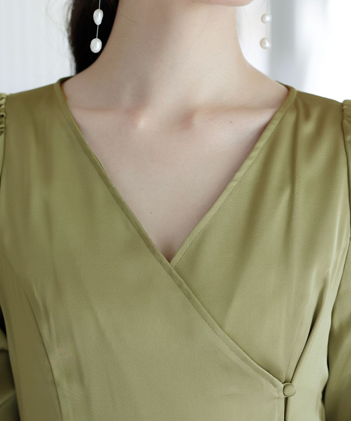 深めのVネックは小顔効果も◎アクセサリーを付けていろんな印象に♪サイドのくるみボタンがオシャレなポイント。