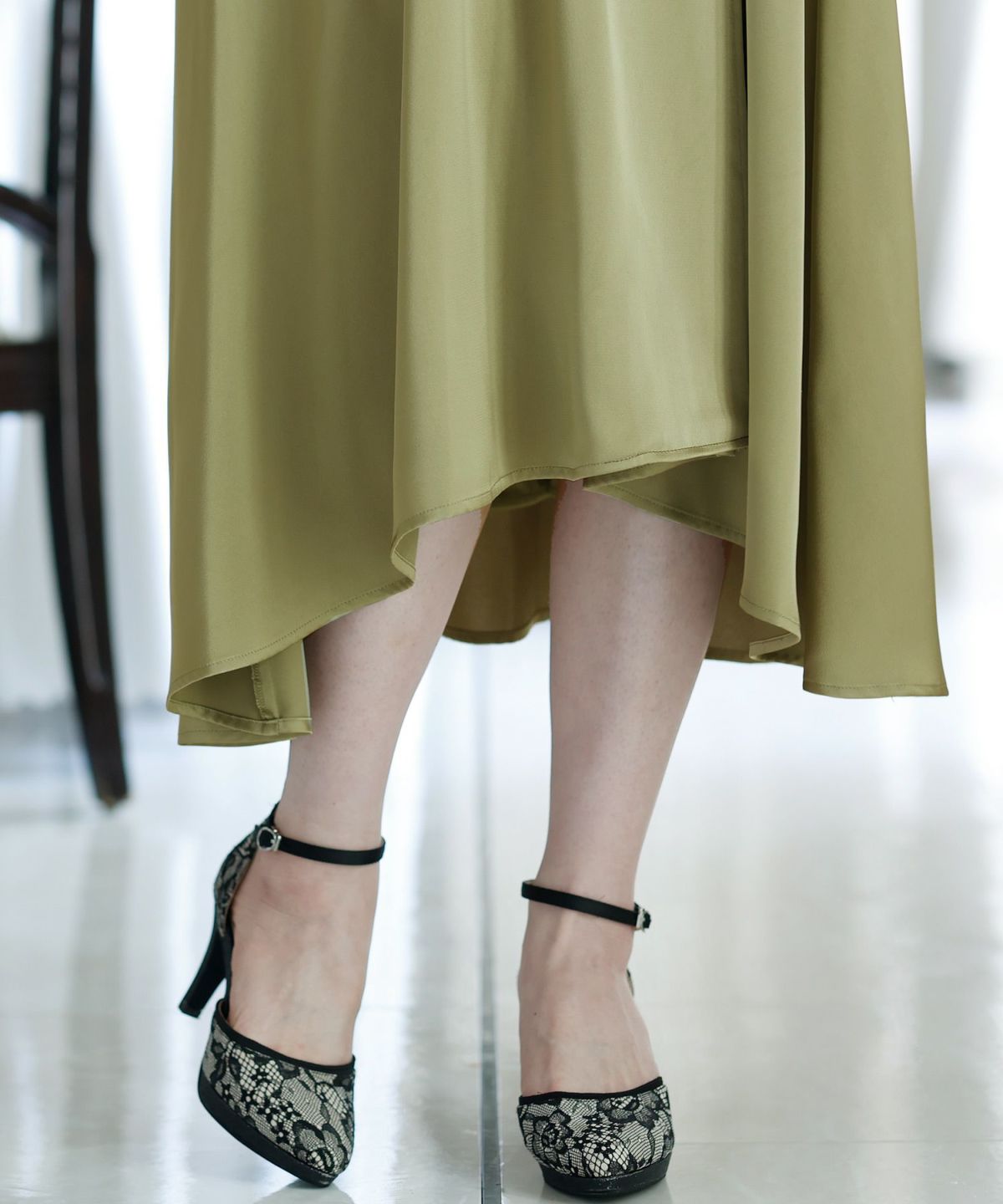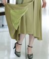 後ろウエストはゴム仕様なので楽ちん。スカートのアシメヘムラインは動くたびに上品なシルエットを作り出します。オケージョンシーンはもちろんデイリーにも活躍します。