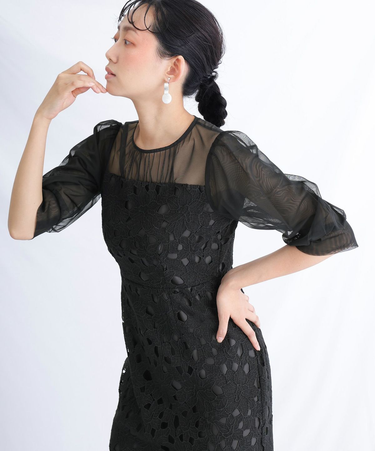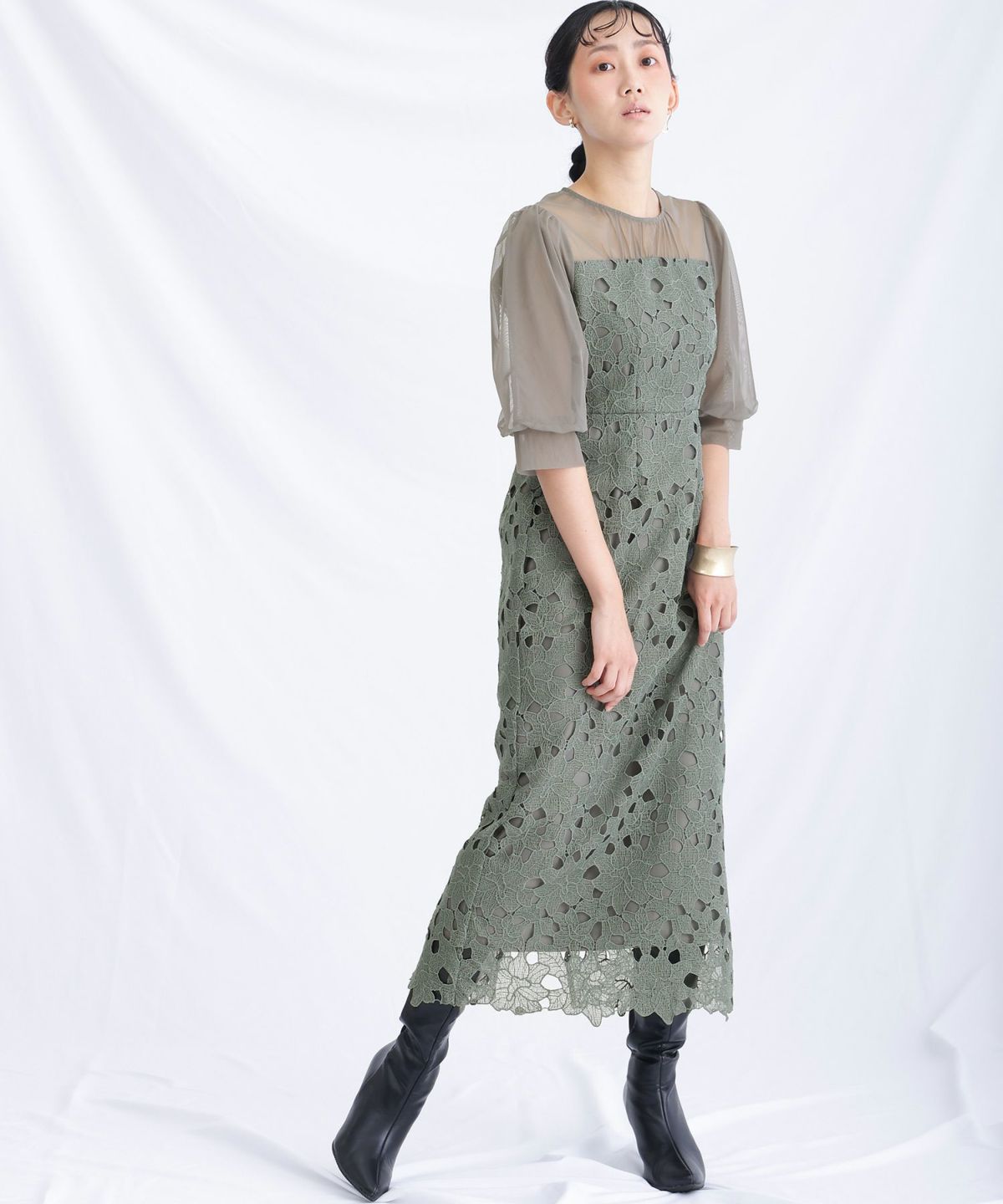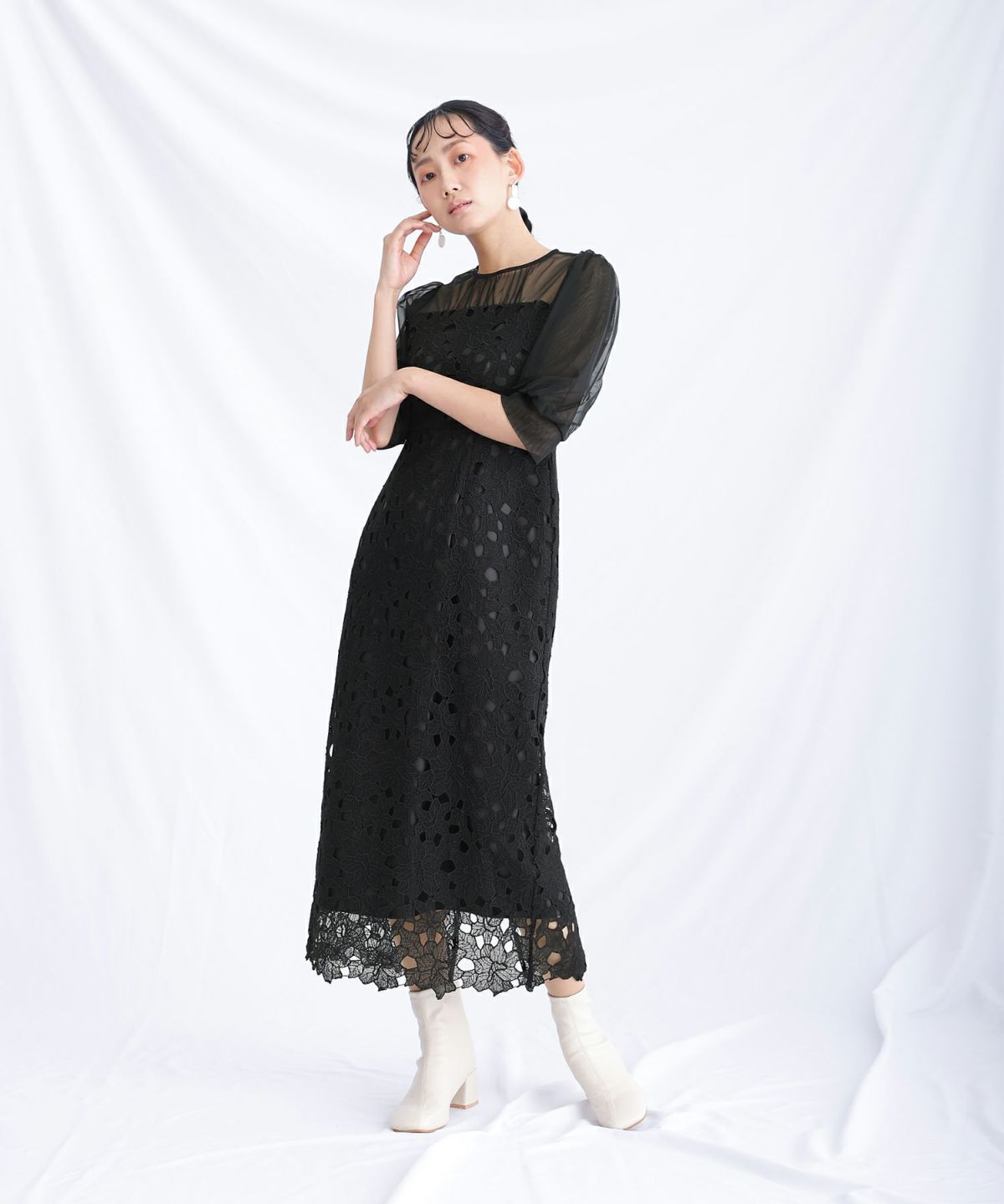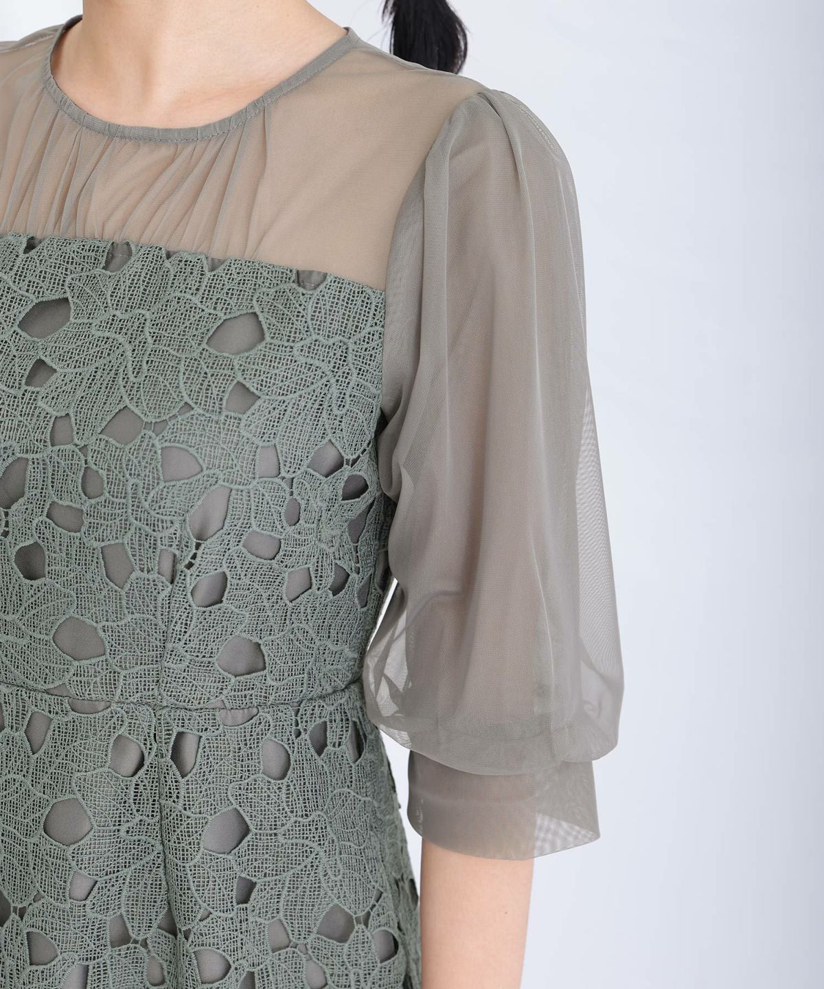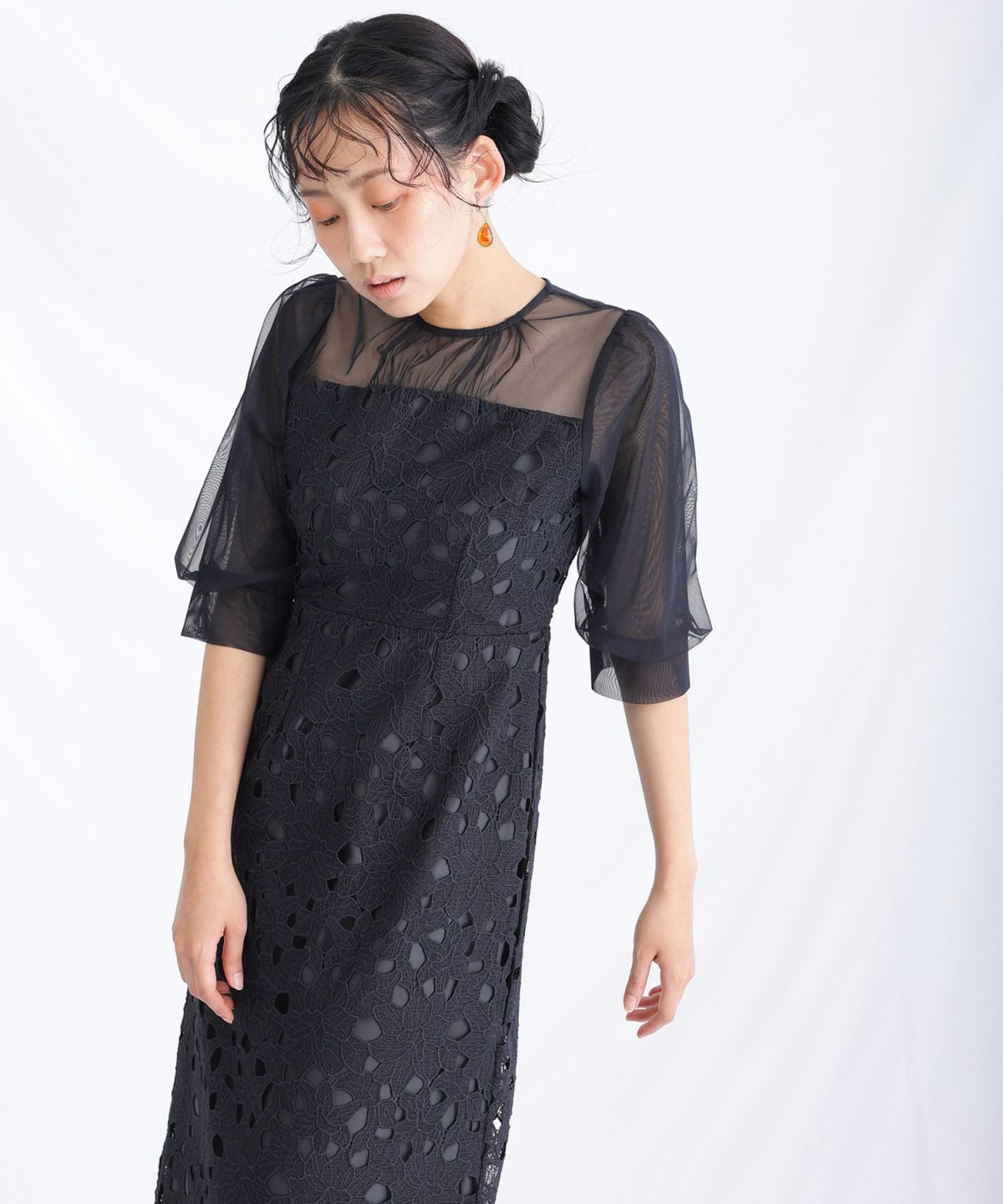 立体感があるケミカルレースとチュールが切り替えがお洒落なワンピース