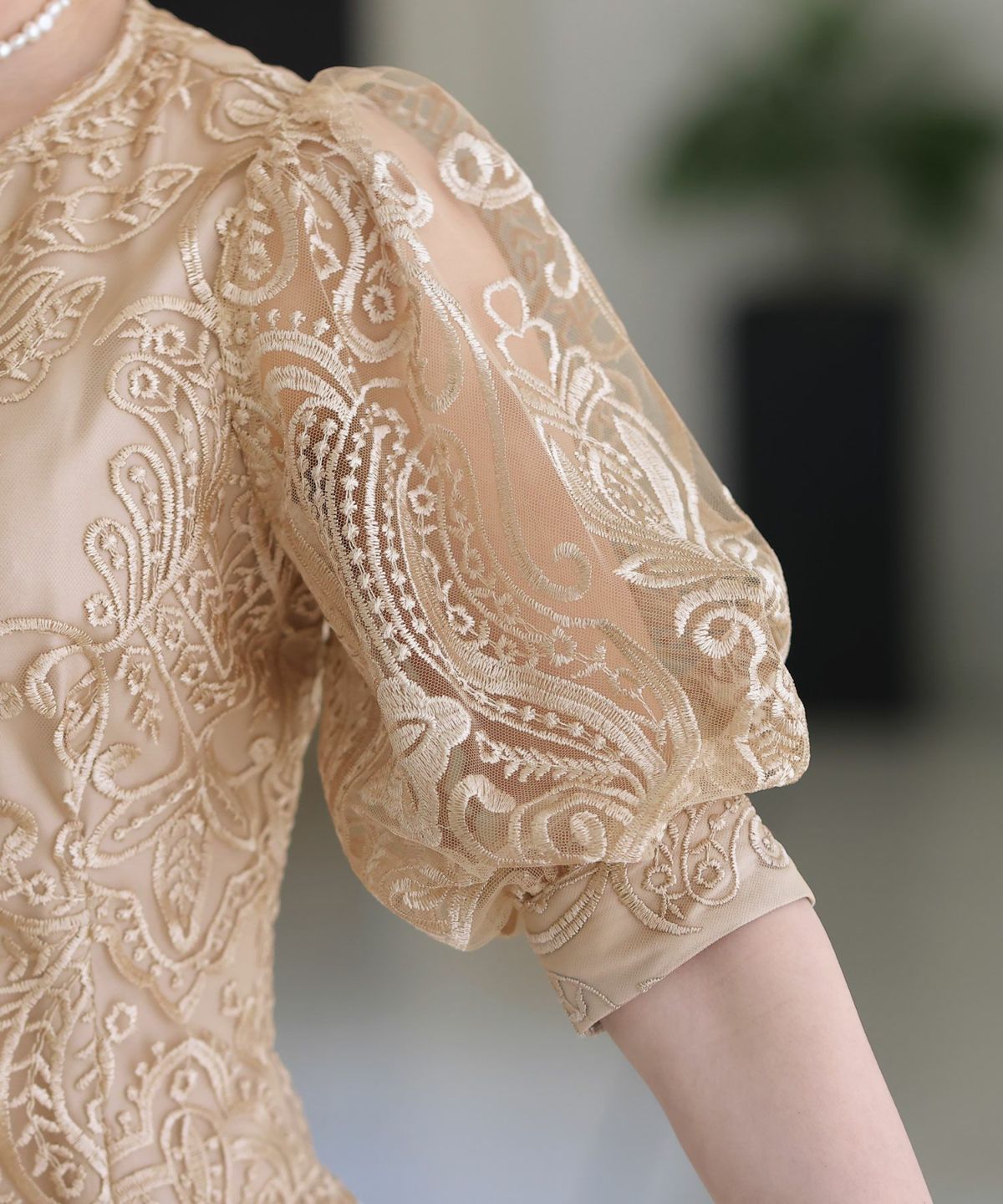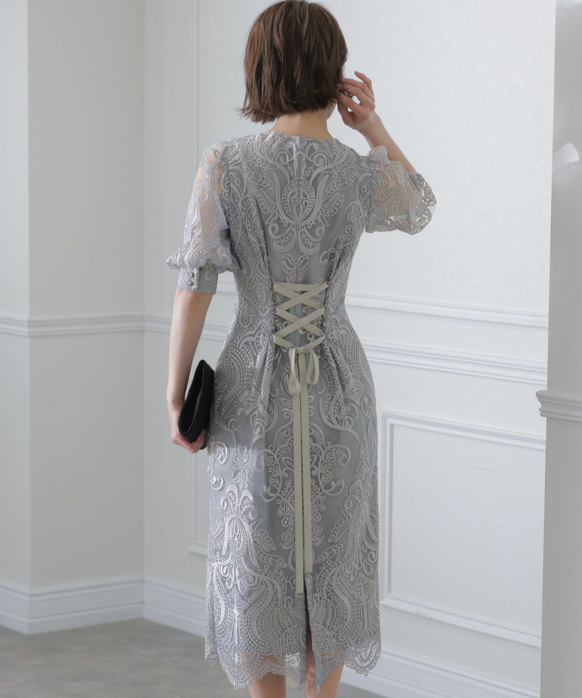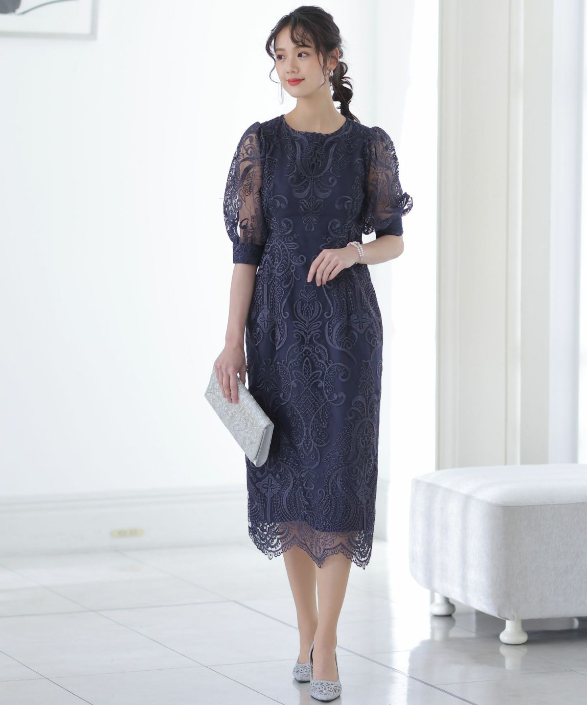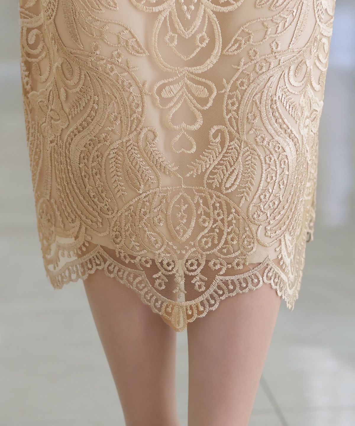 エキゾチックな刺繍がさり気なく目を惹くこだわりのドレス。裾のスカラップが繊細さをプラスし、大胆ながらキレイめな印象に。
