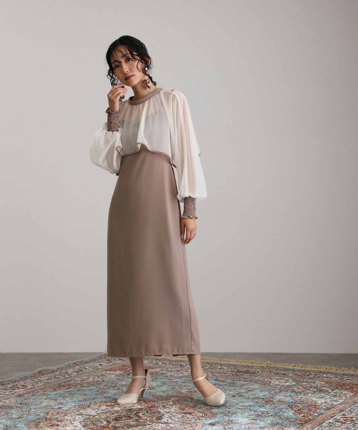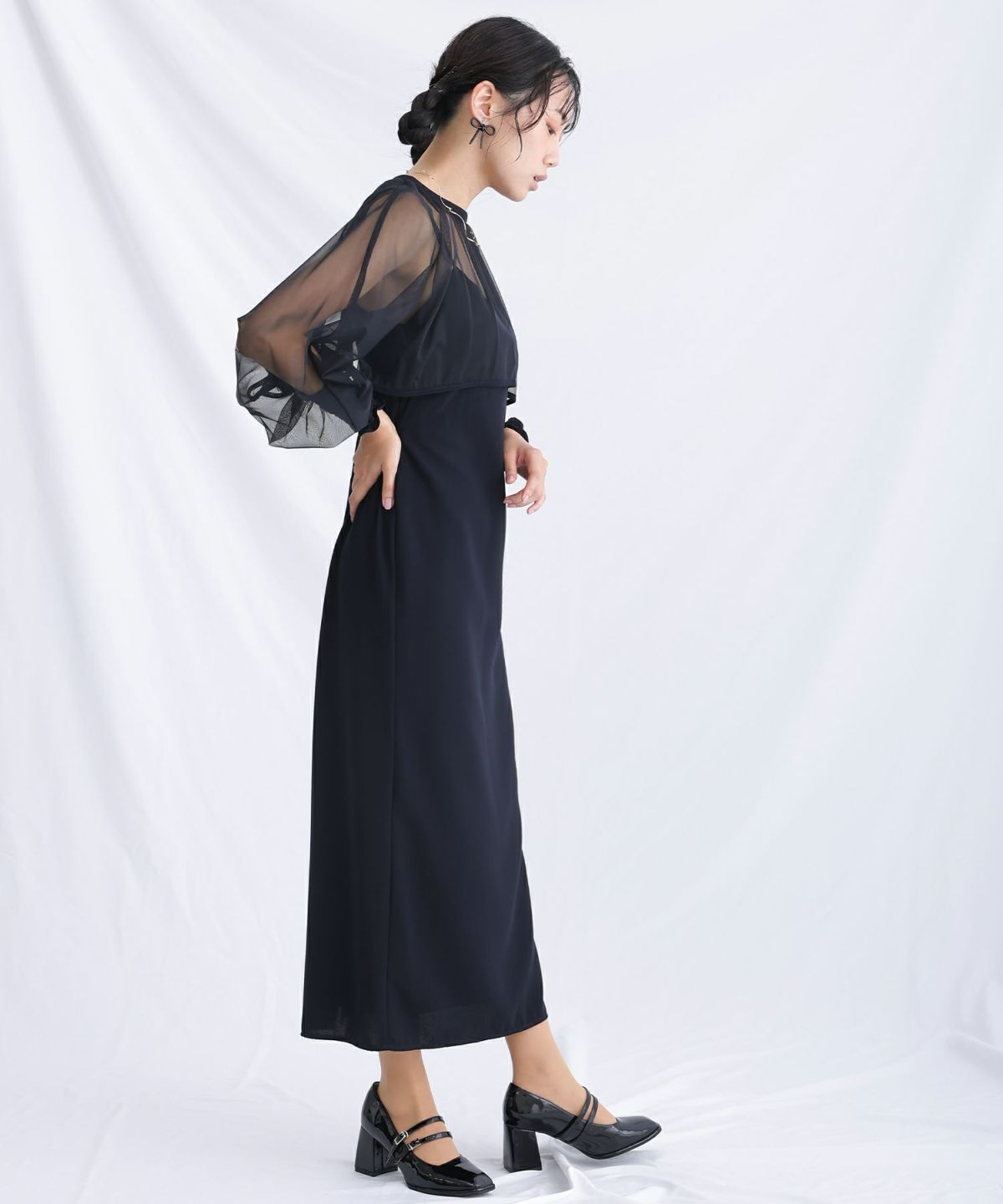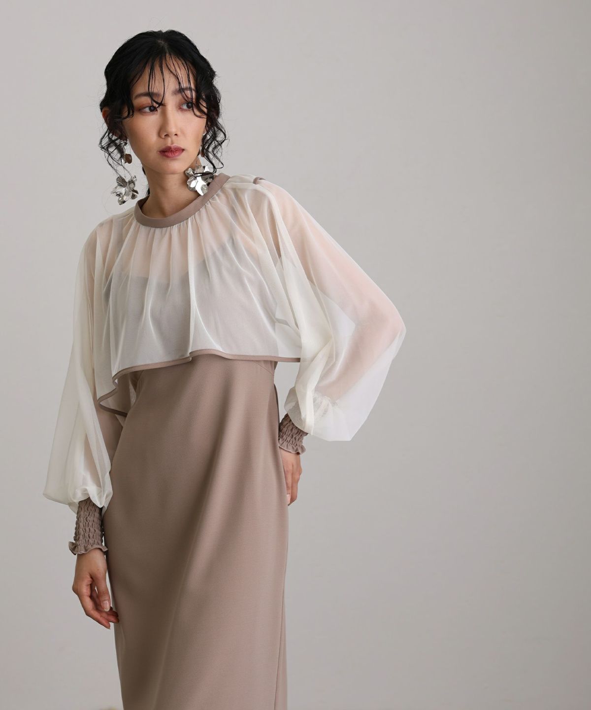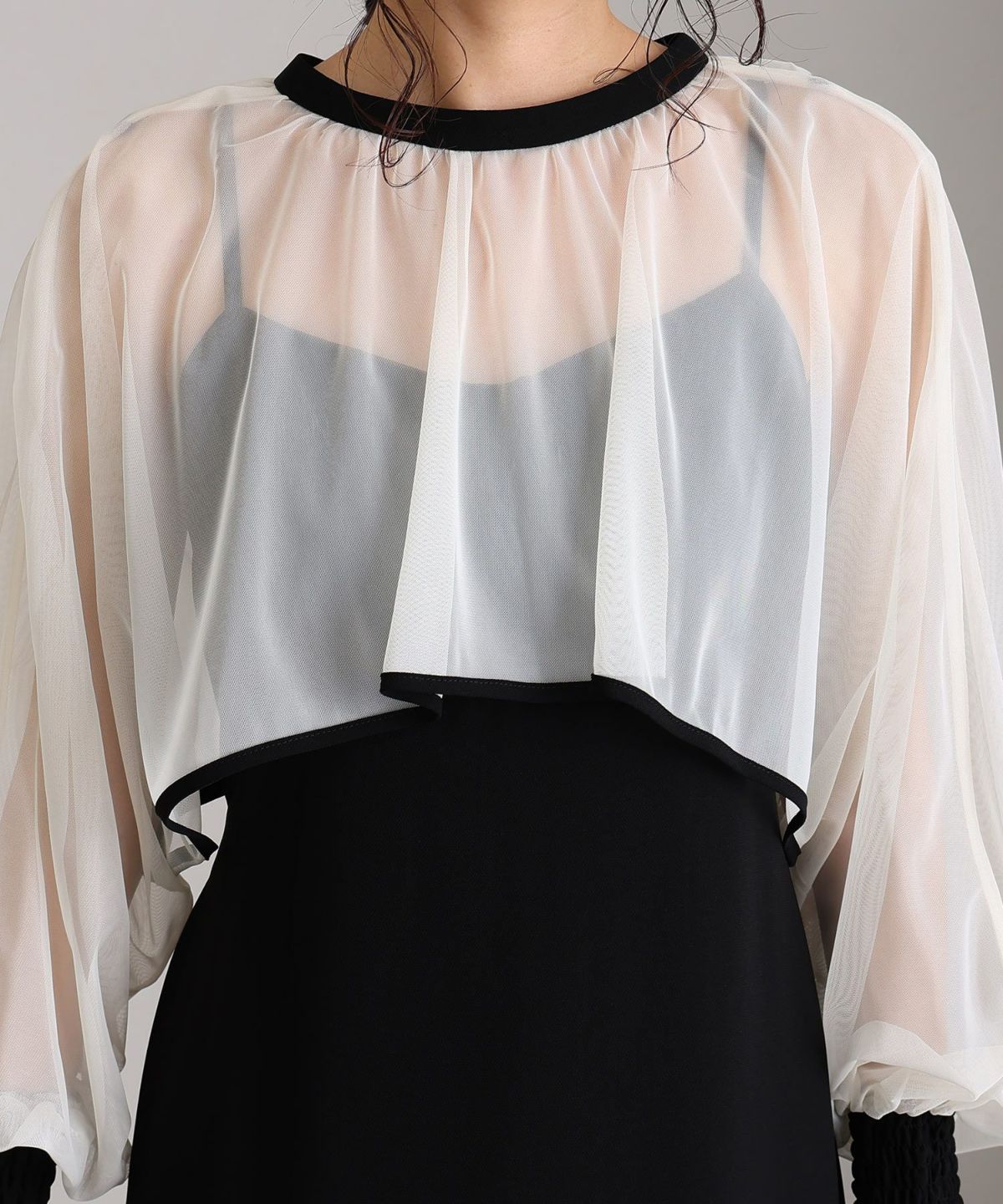 マイクロチュールのショート丈トップスが可愛い一着。