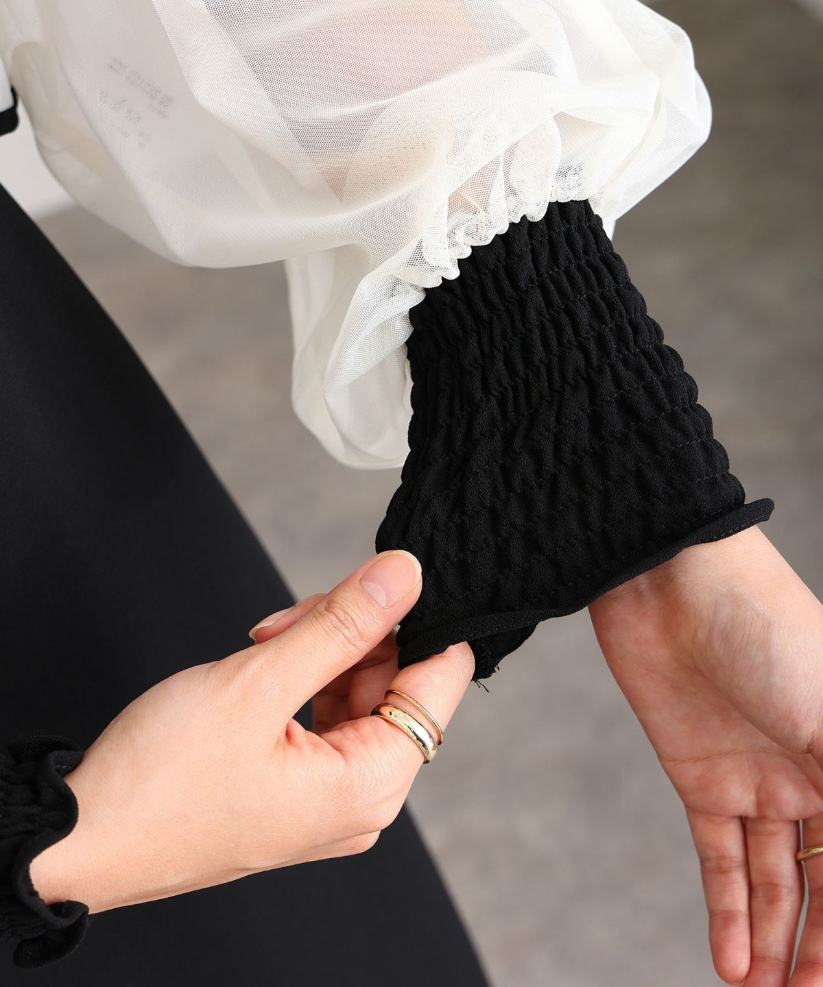 トップスの程よい透け感が女性らしい。
