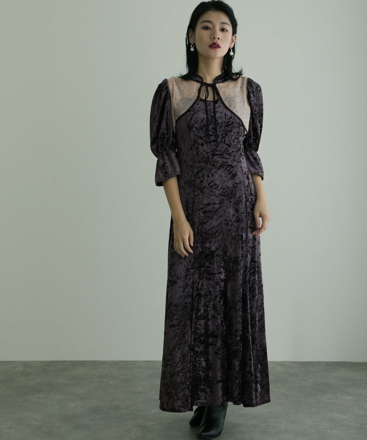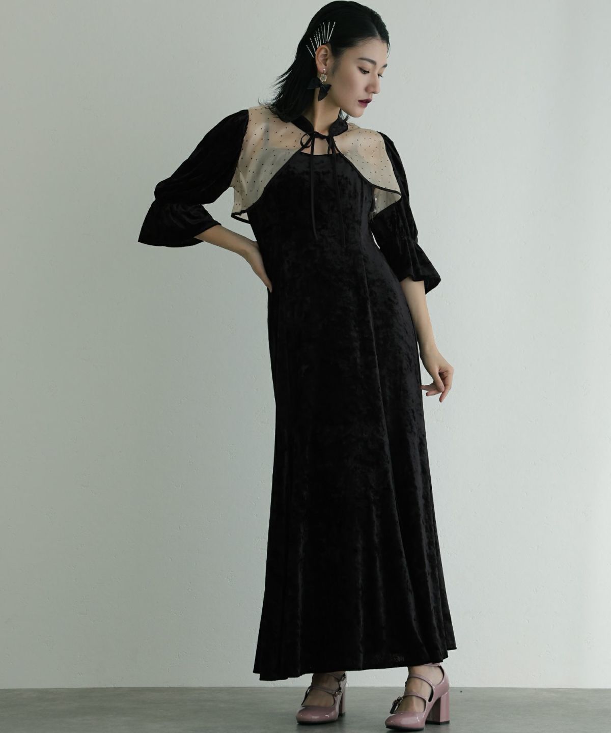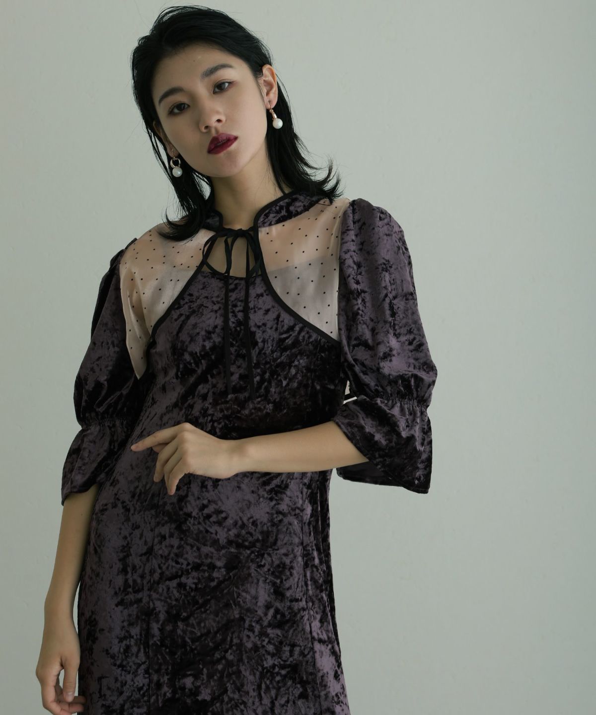 滑らかなベロア生地がラグジュアリーで品のある着こなしを演出。どこかクラシカルな雰囲気を感じさせてくれるデザイン性のあるドレスです。