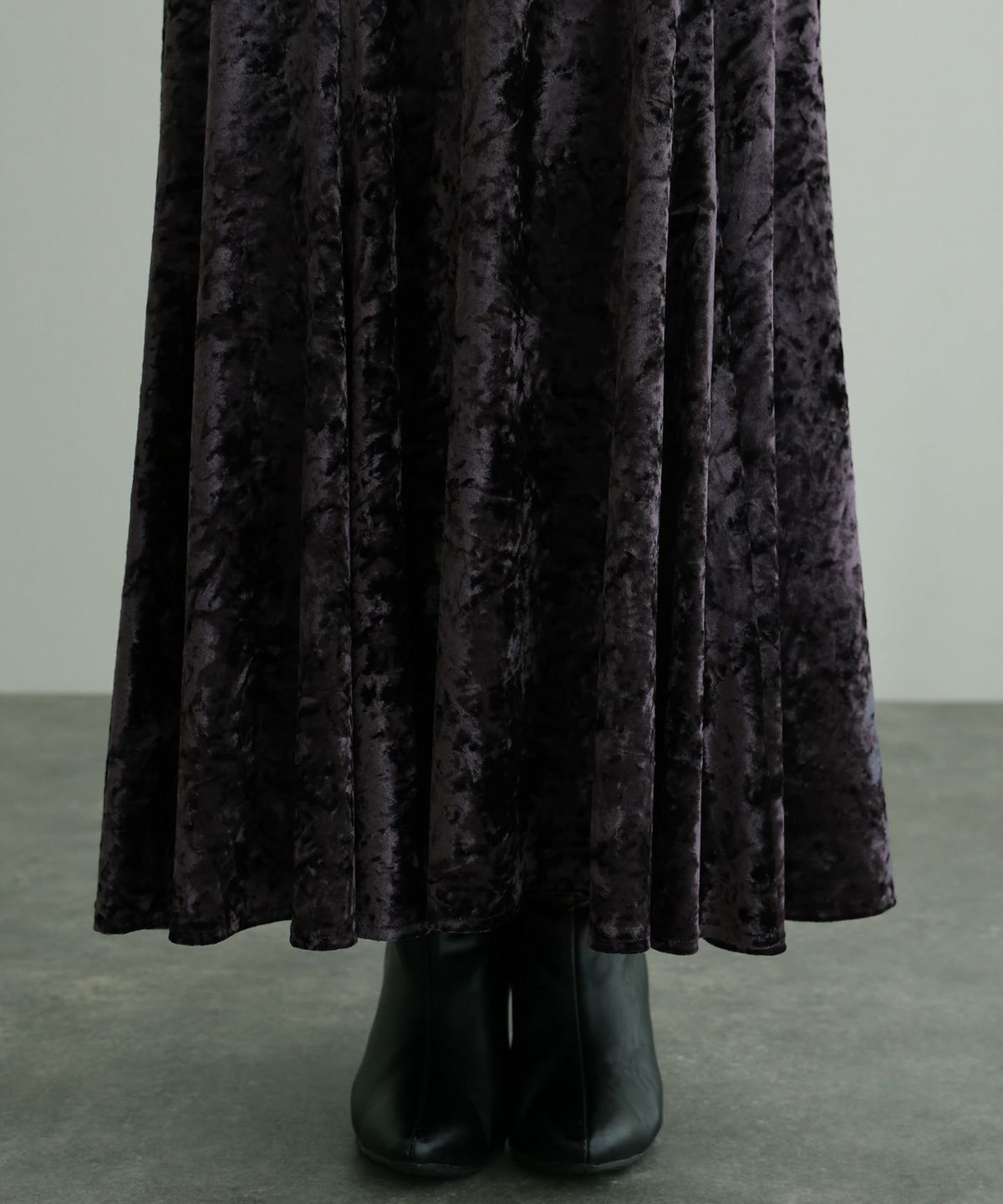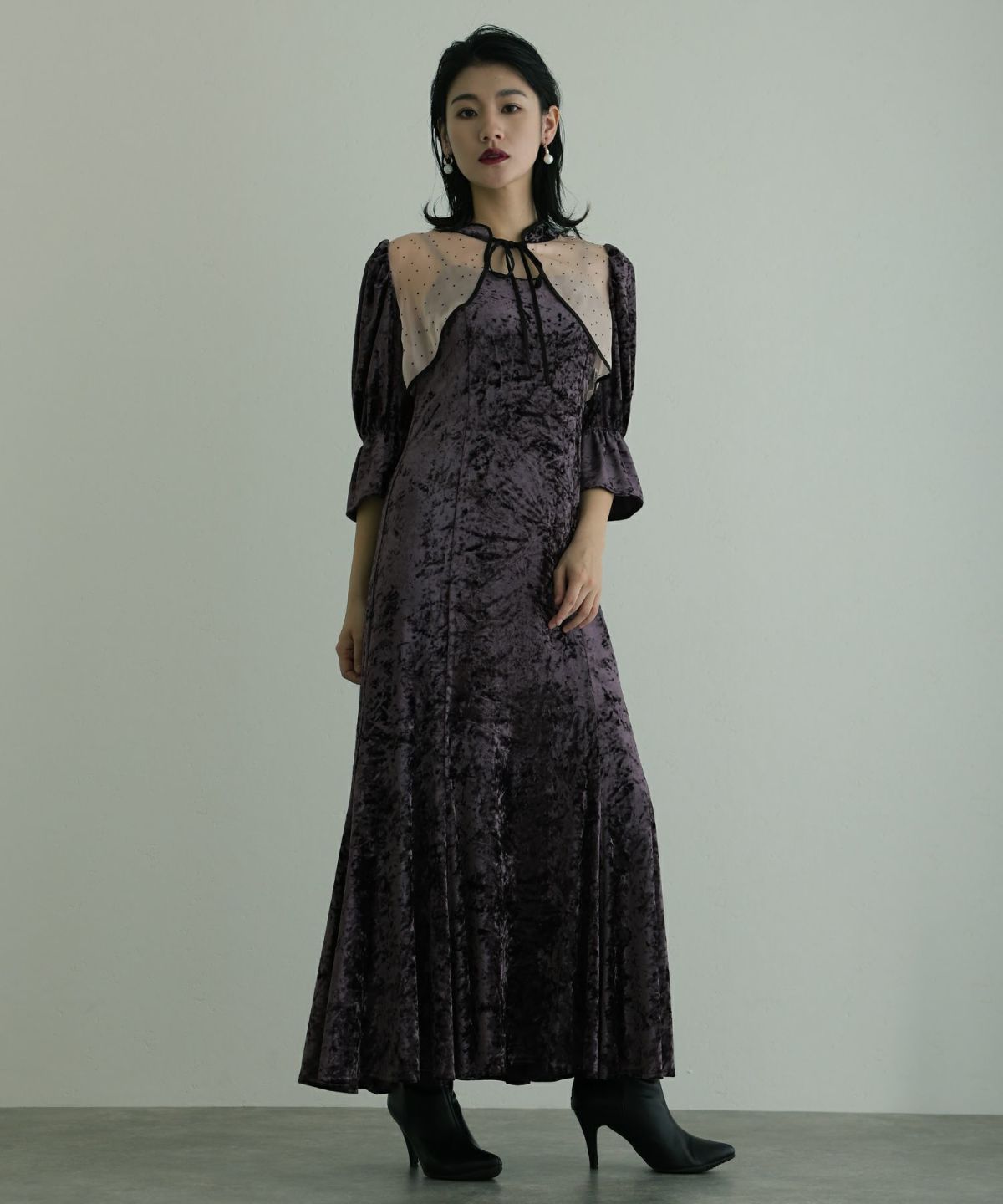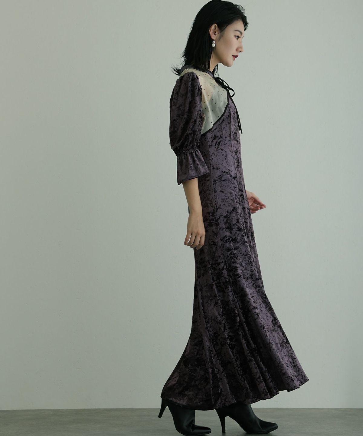 滑らかなベロア生地がラグジュアリーで品のある着こなしを演出。どこかクラシカルな雰囲気を感じさせてくれるデザイン性のあるドレスです。