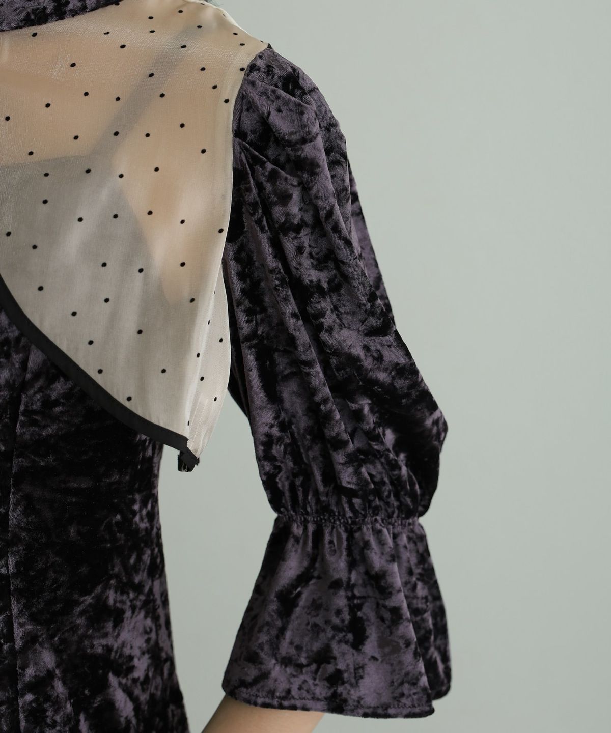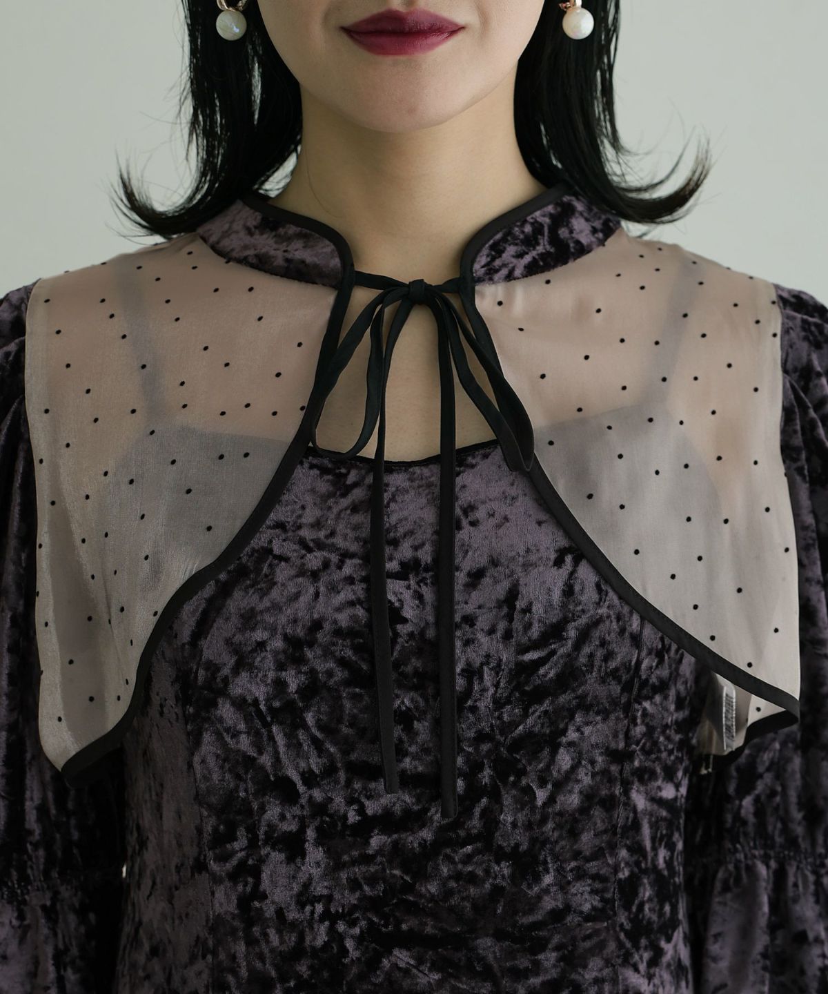 ベロア素材をドット柄と組み合わせた珍しいデザインのドレス。クラッシュベロア特融の風合いが、温かみとラグジュアリーな雰囲気を演出します。ボレロはワンピースの上に着用する事も、インして着用する事も可能です。