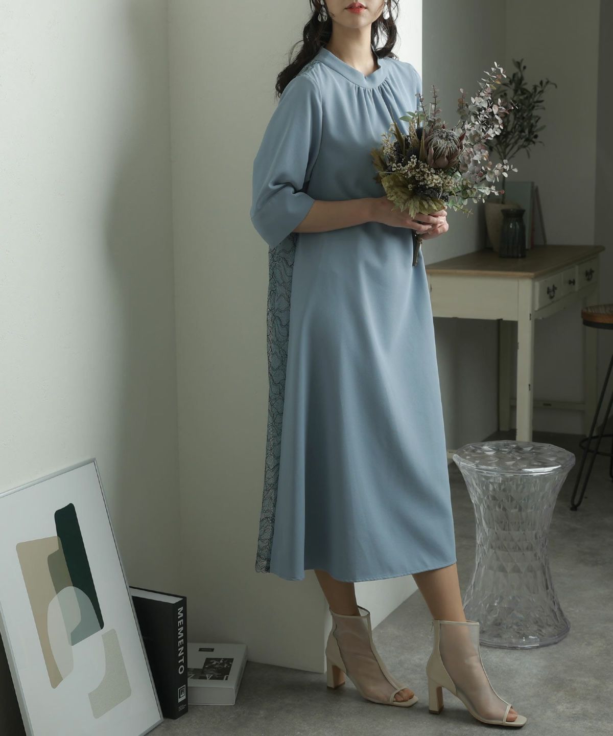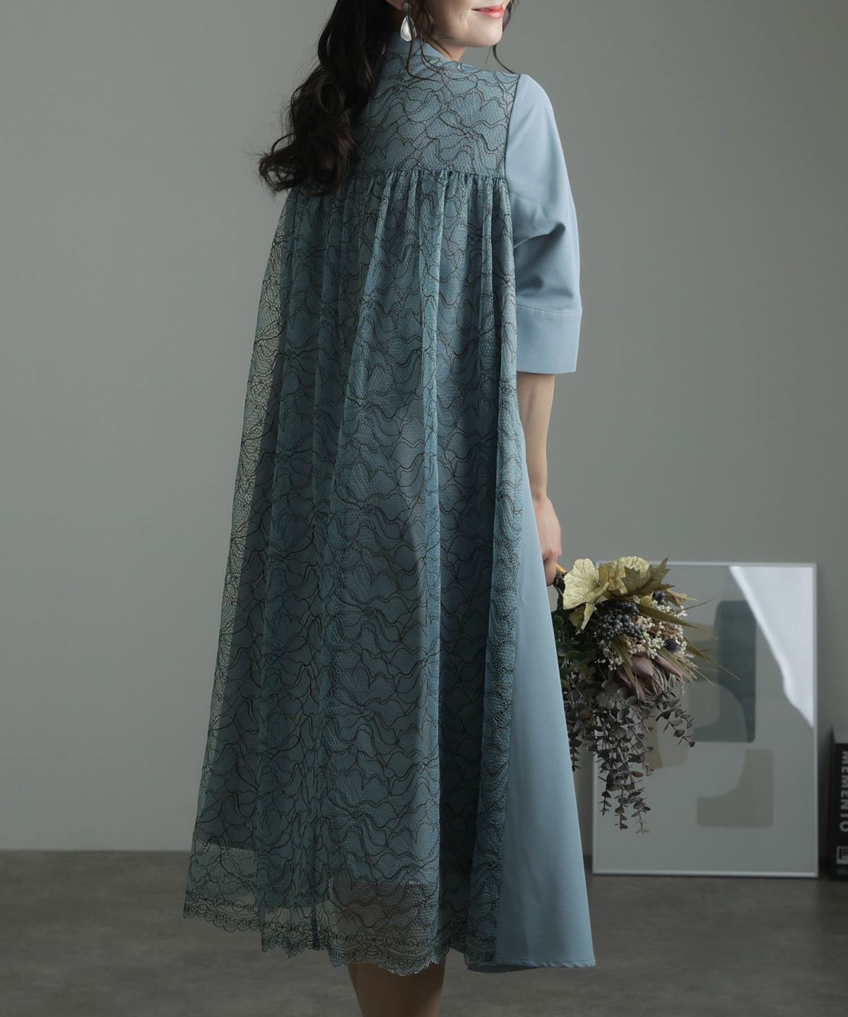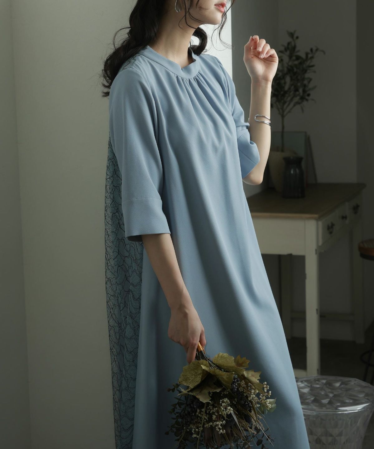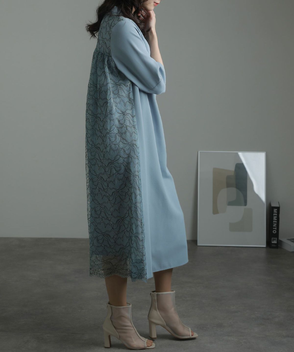 ■背面のレースが上品前から見るとシンプルですが後ろには大胆にレースがあしらわれています。セレモニー・オケージョンから女子会やお食事会などの普段使いまで幅広く対応できます。ワンピースのふんわりとしたシルエットが美しく、袖もしっかりあるので全身体型カバー出来ちゃう!お手持ちのベルトやアウター等でアレンジして楽しめます♪