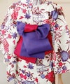 浴衣のカラーに合わせたチェリーピンク×紫色の帯が全体を引き締めます。