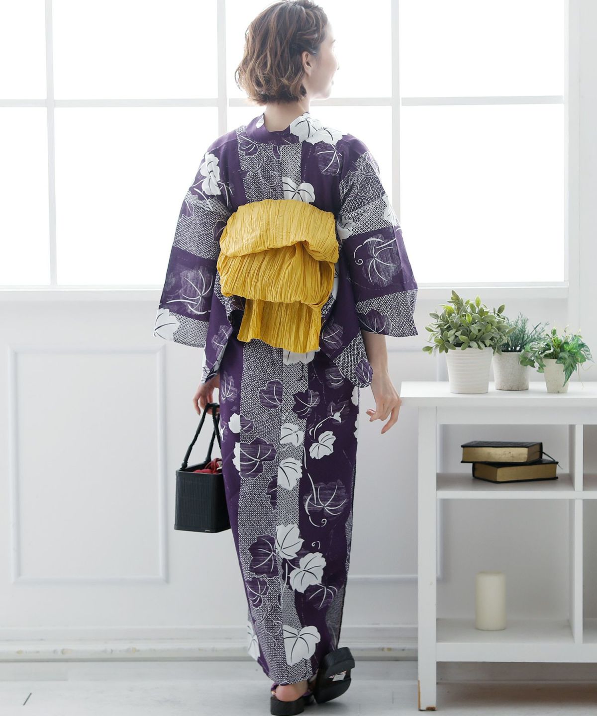 マスタードイエローの兵児帯が、紫の浴衣に映えます。大胆な色合わせがオシャレ!