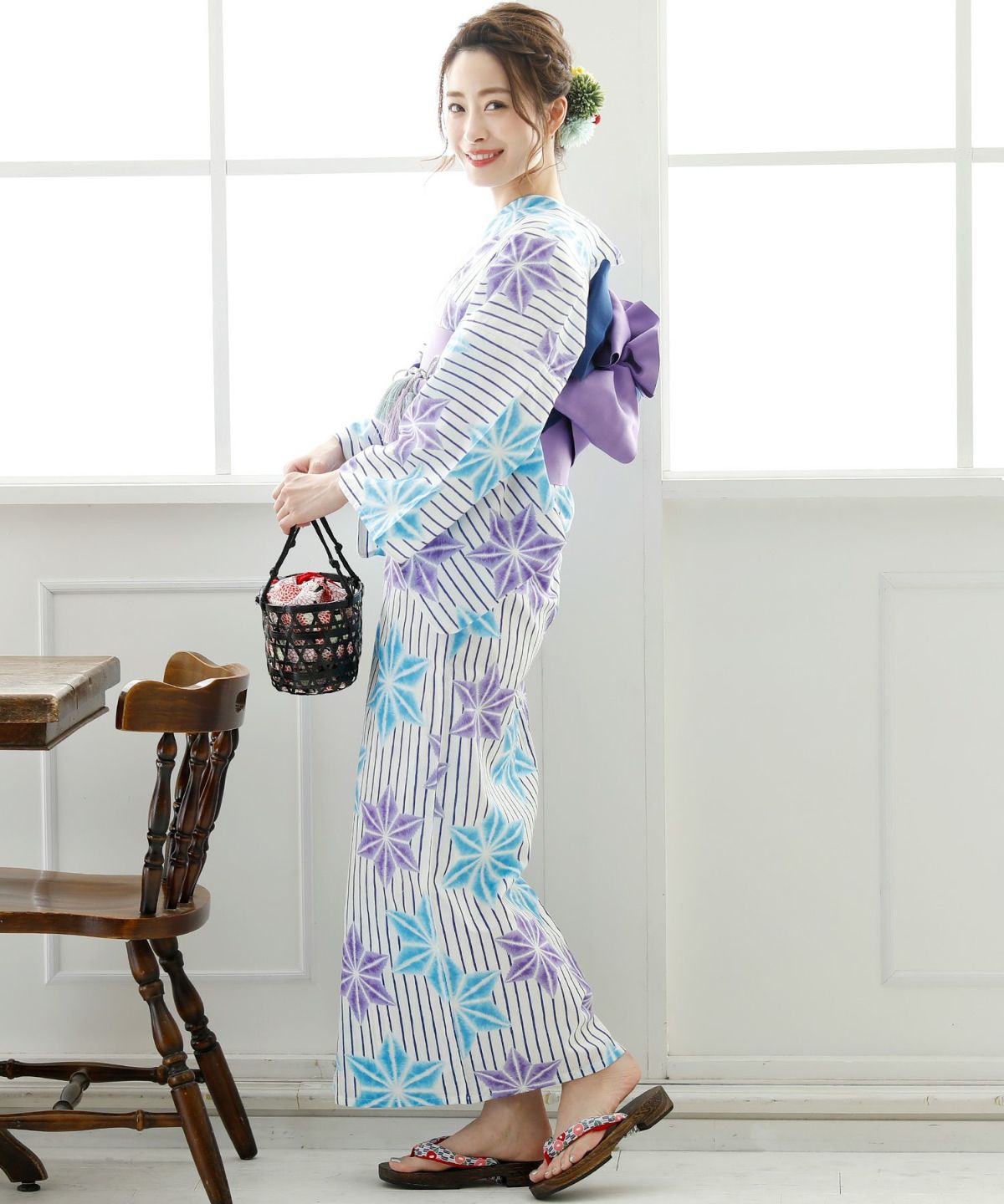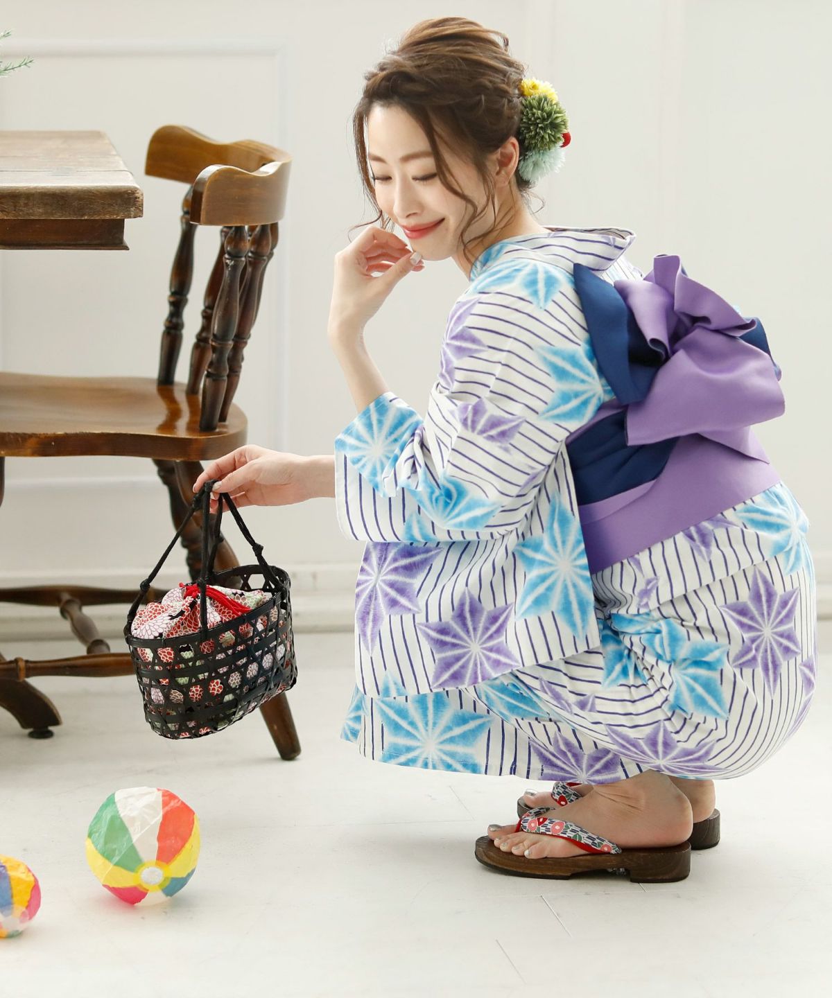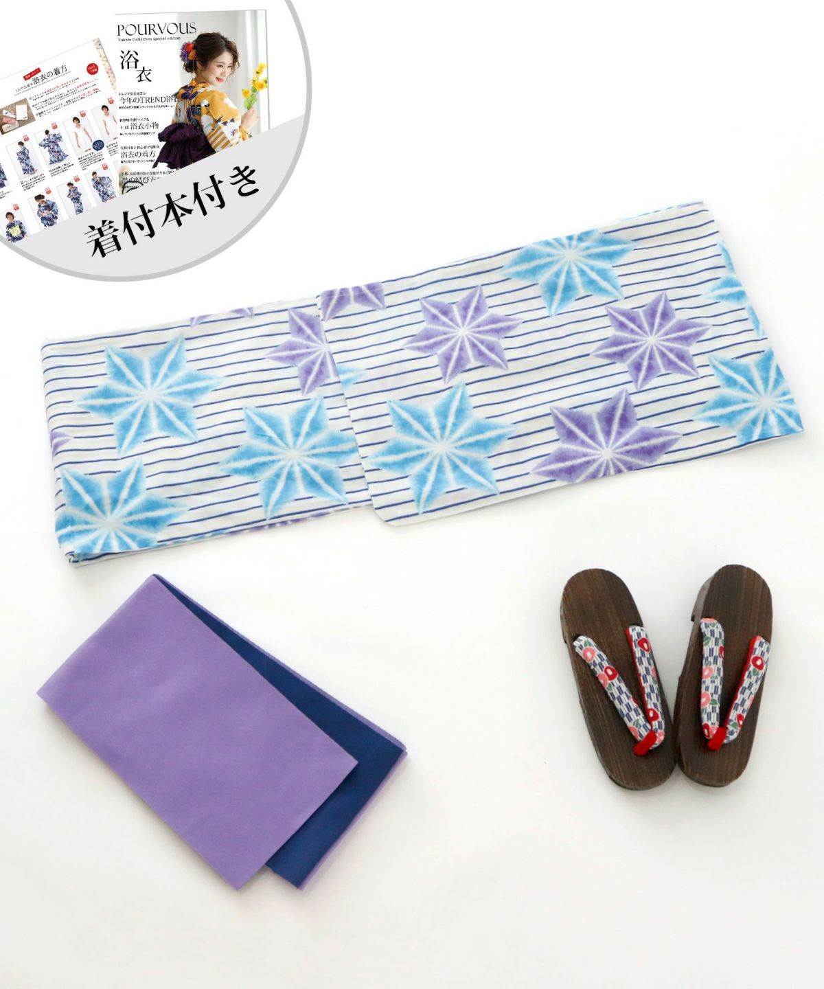 ◆4点セット(浴衣/着付け本/半巾帯/下駄:フリーサイズ23cm~25cm) ◆浴衣素材:綿100%、帯素材:ポリエステル100% |