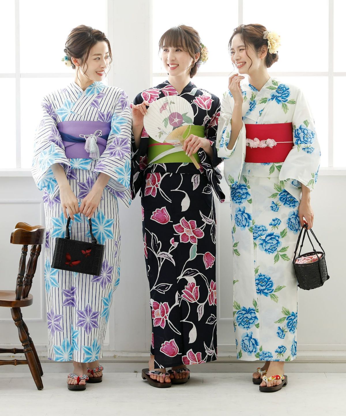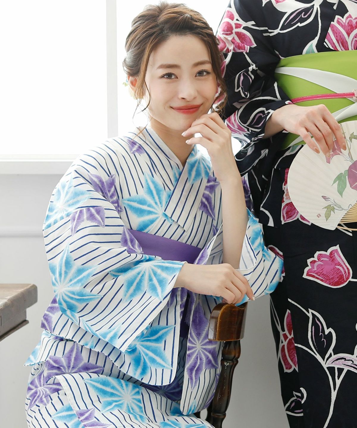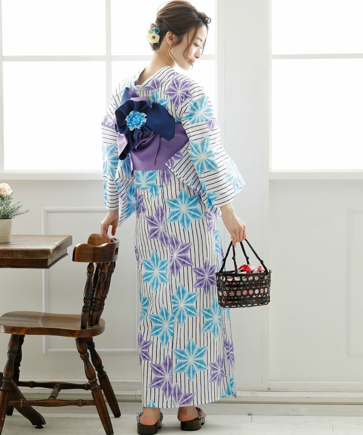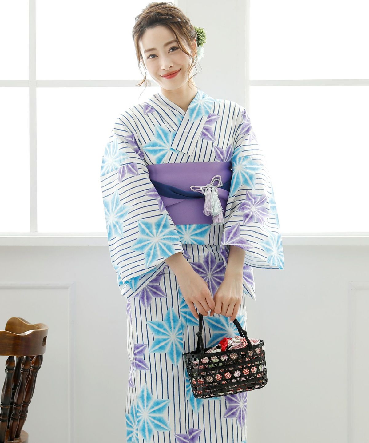 ◆4点セット(浴衣/着付け本/半巾帯/下駄:フリーサイズ23cm~25cm) ◆浴衣素材:綿100%、帯素材:ポリエステル100% |