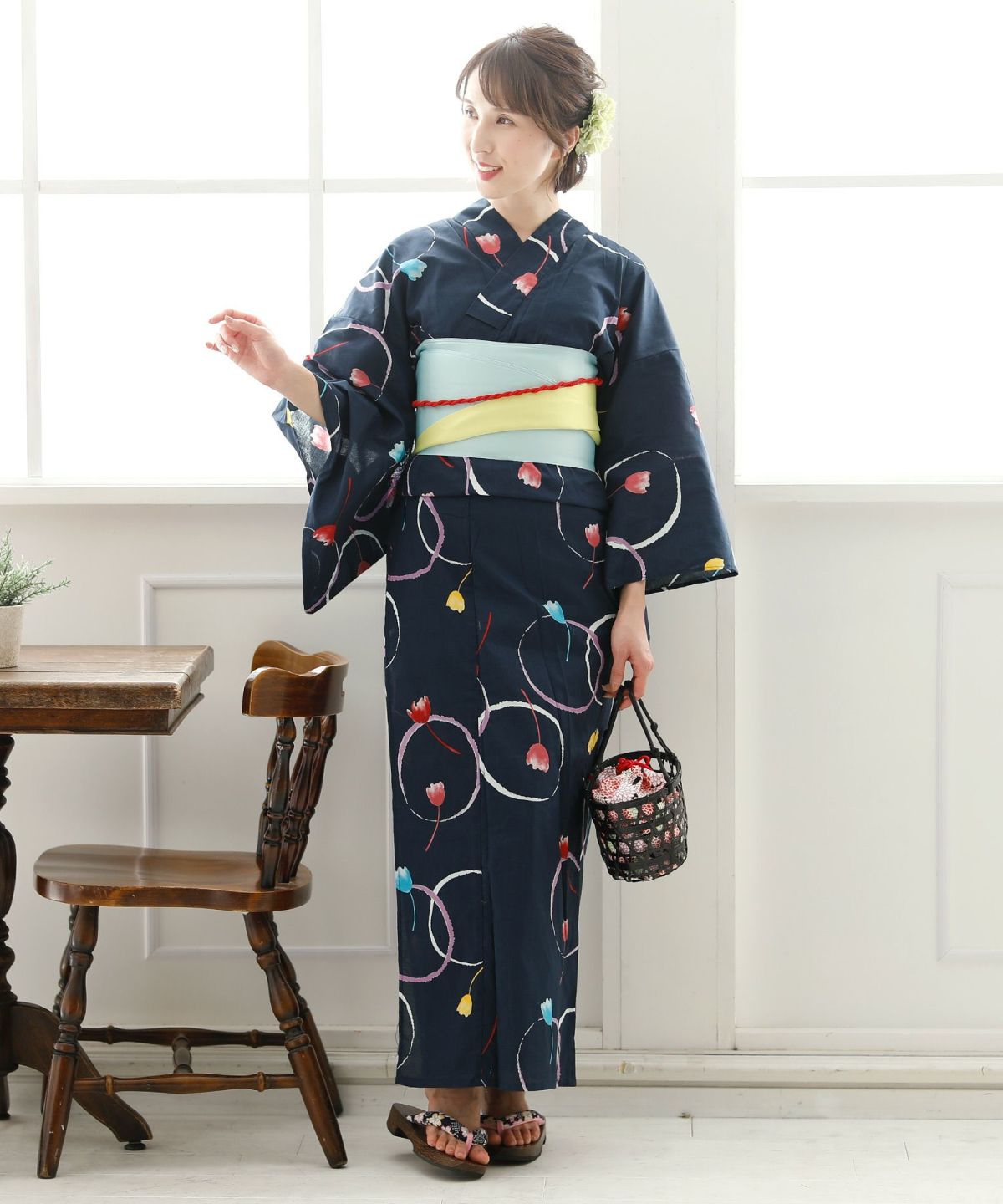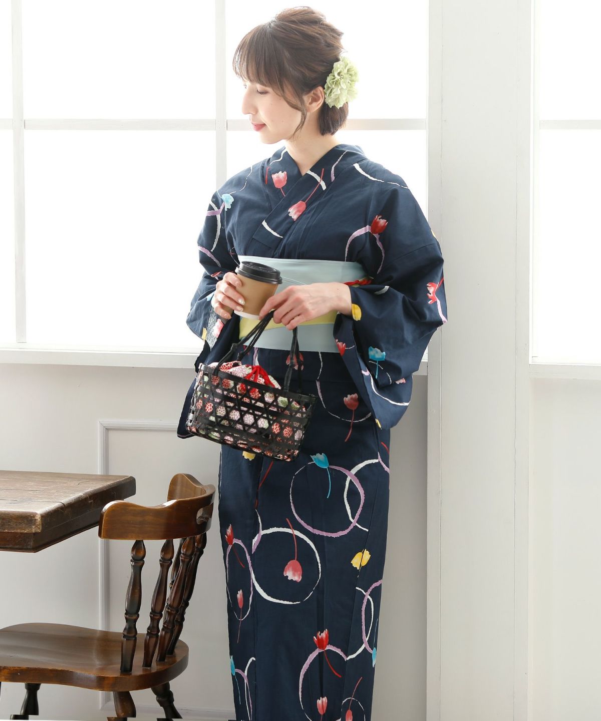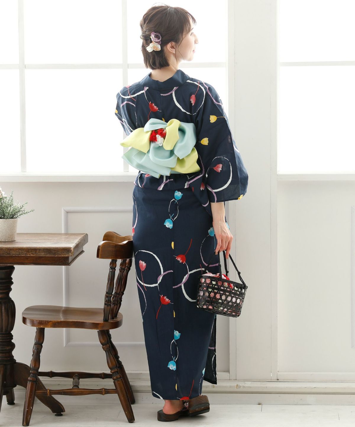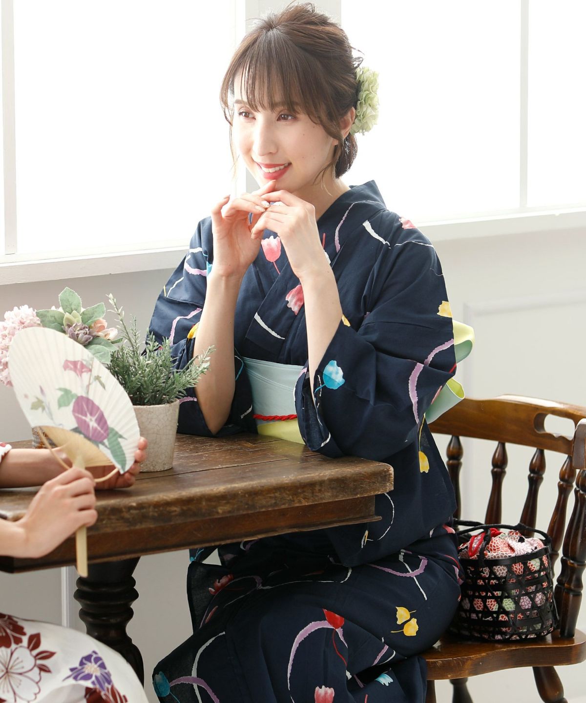 チューリップが紺地に舞う和ポップな浴衣 鬱金香 浴衣4点セット(半巾帯)
