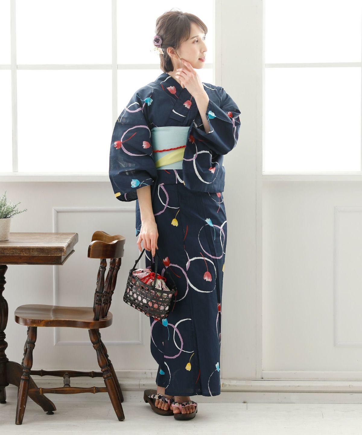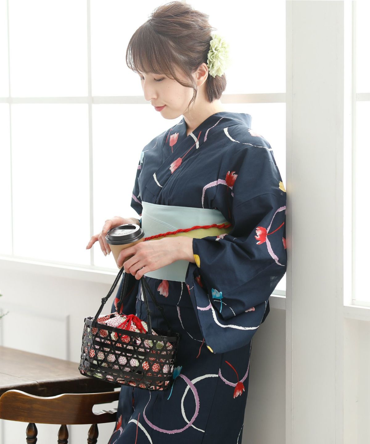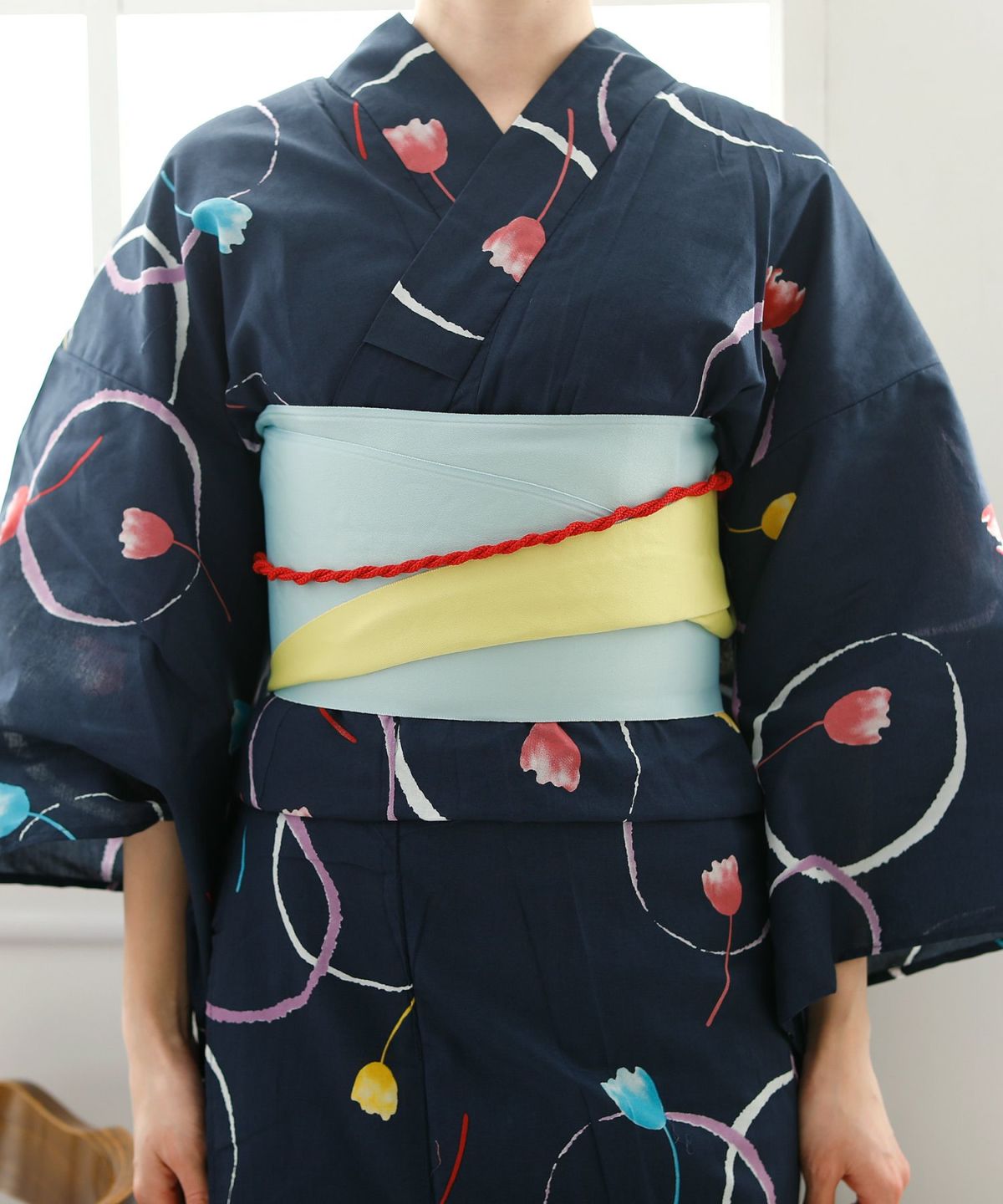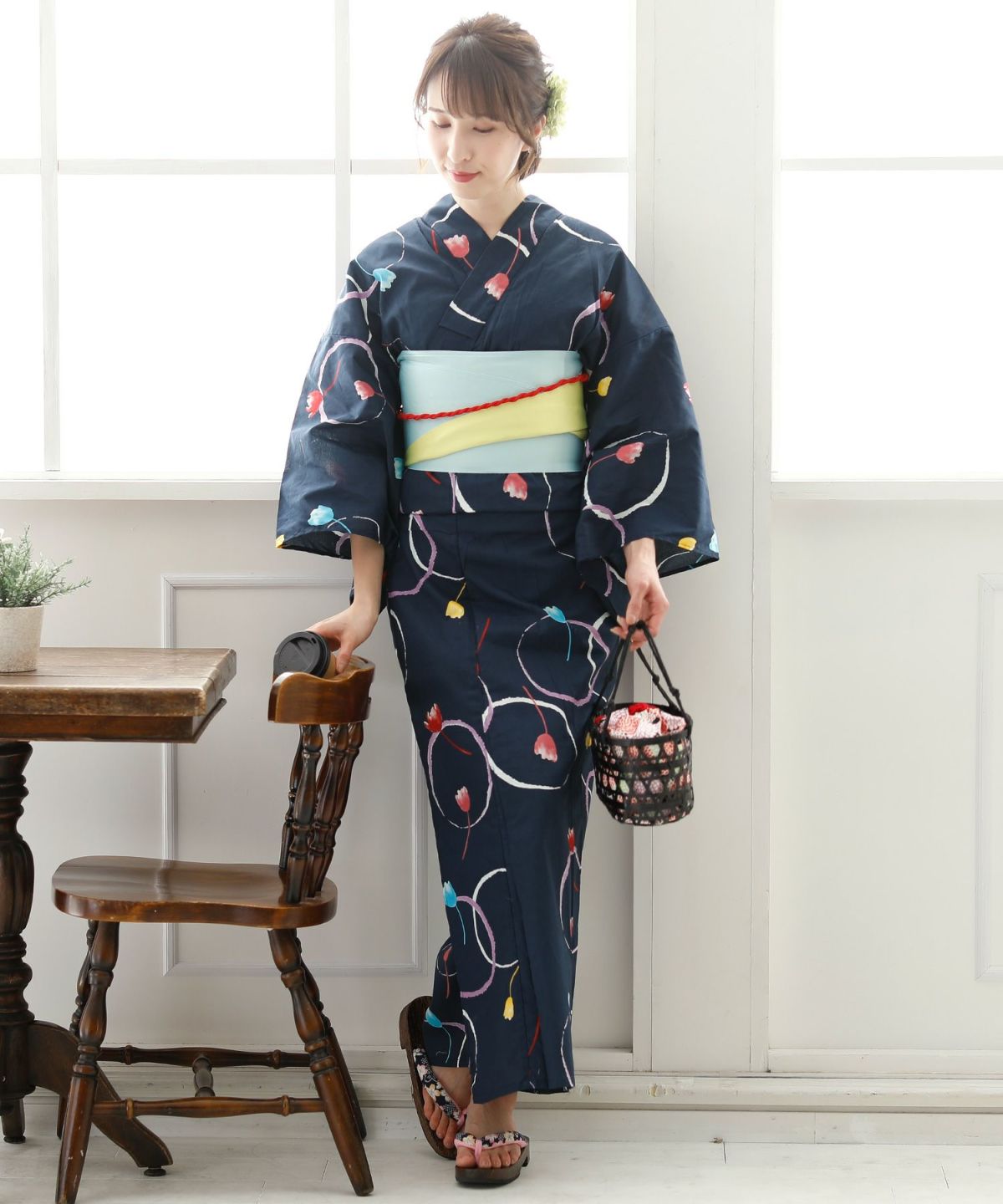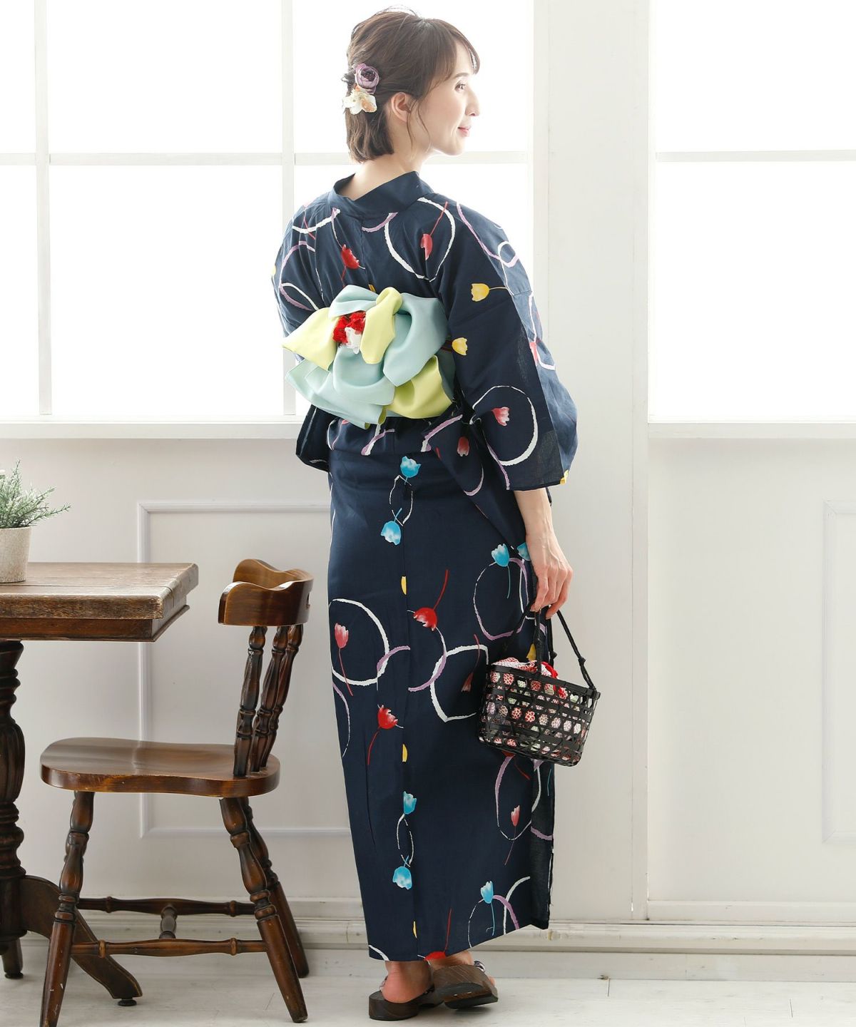チューリップが紺地に舞う和ポップな浴衣 鬱金香 浴衣4点セット(半巾帯)