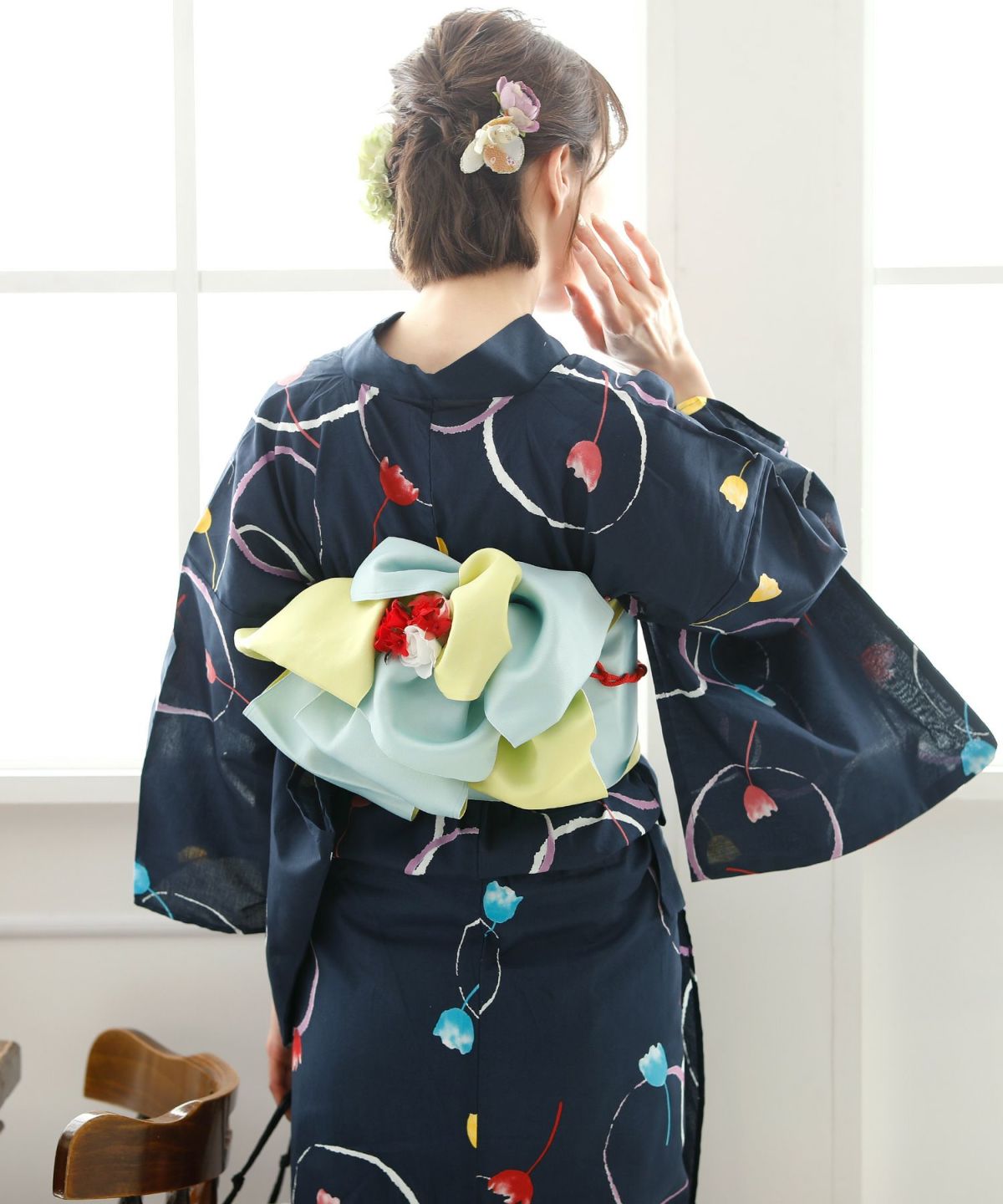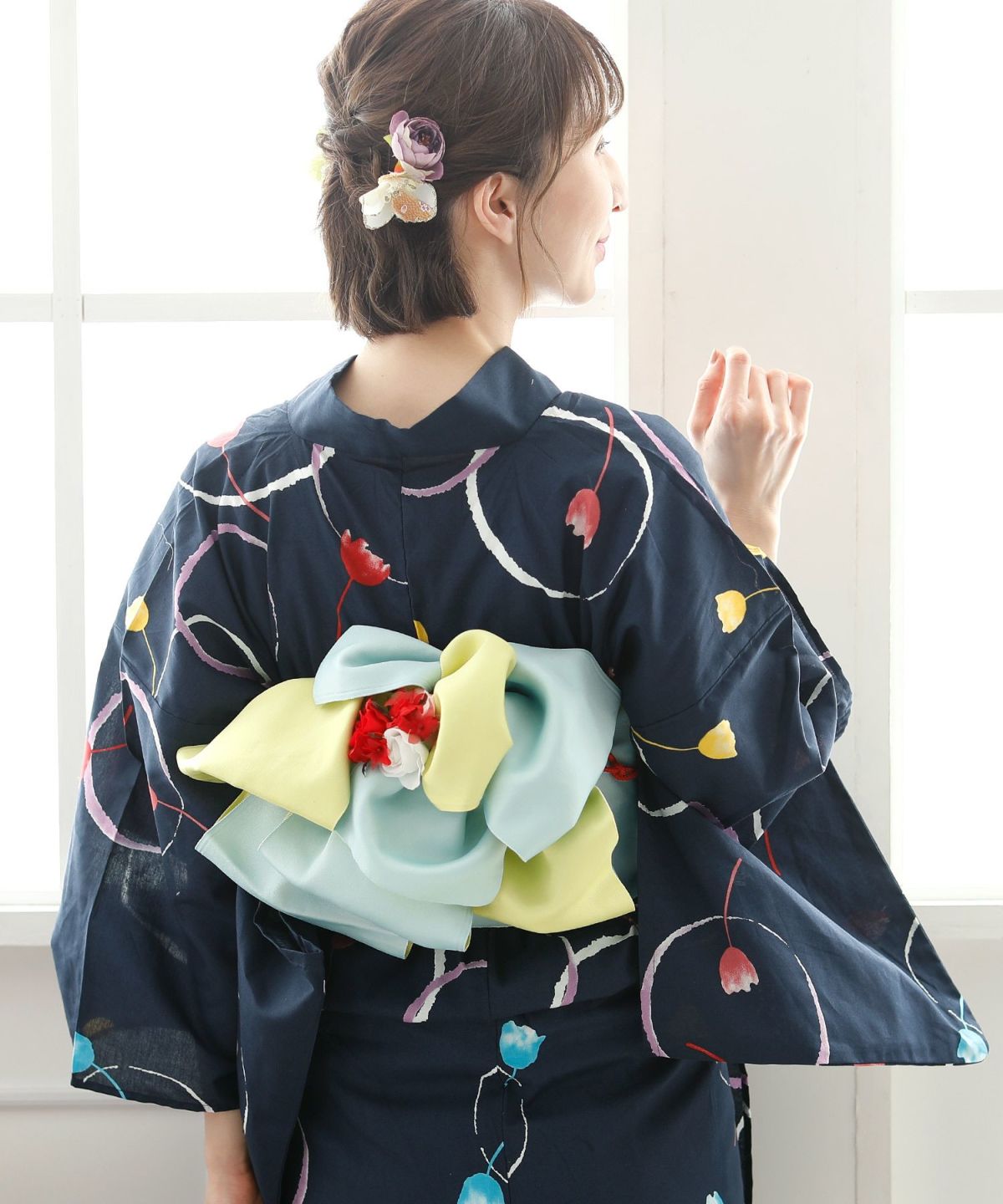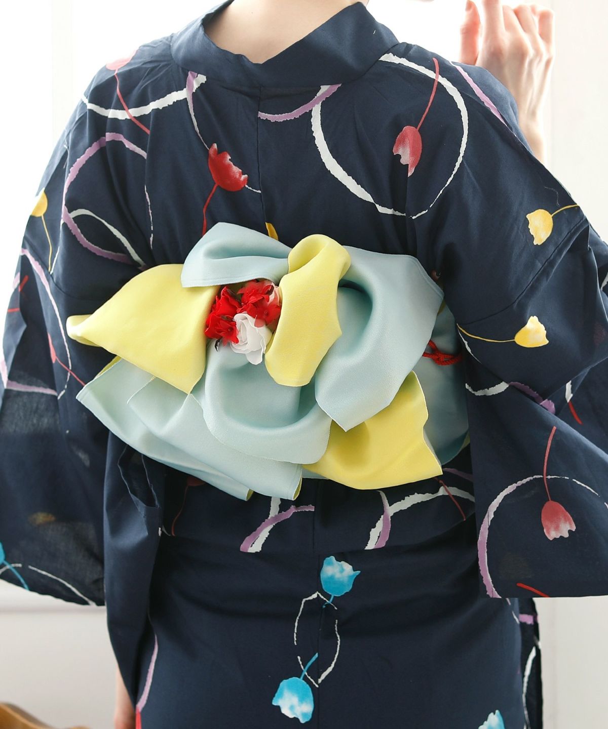 薄黄×水色の可愛らしい帯は、アレンジ自在の半巾帯となっています。