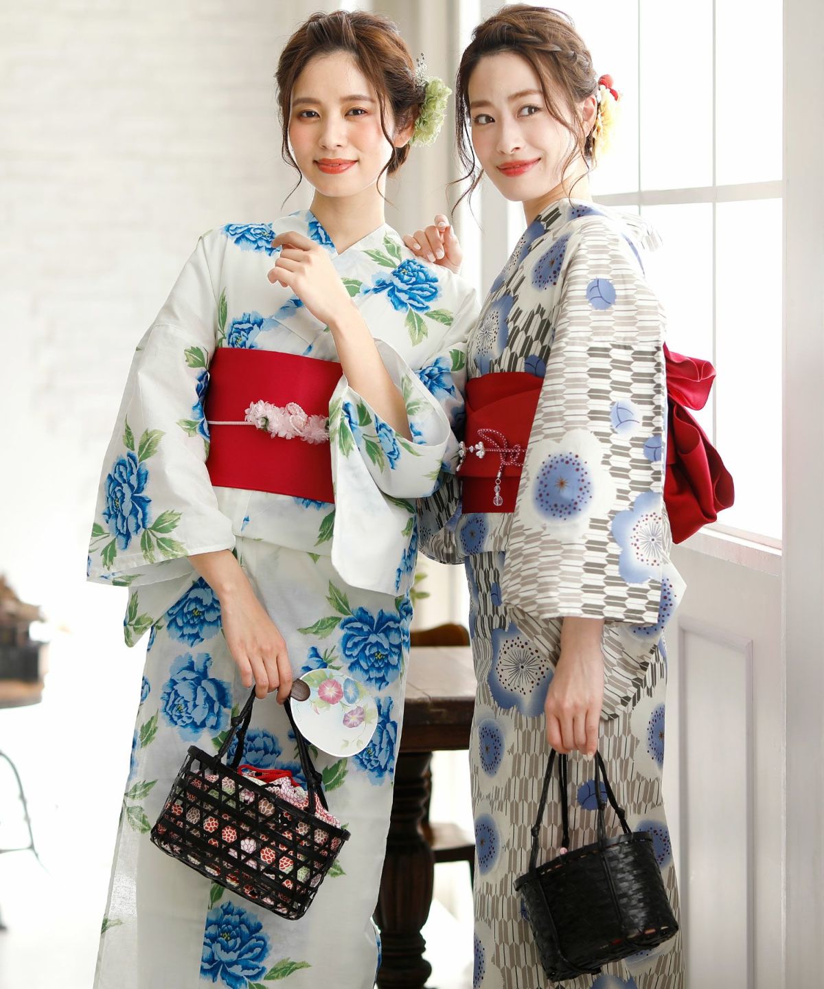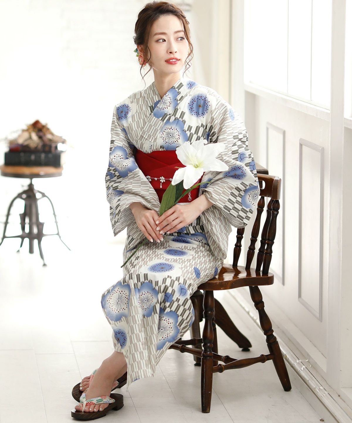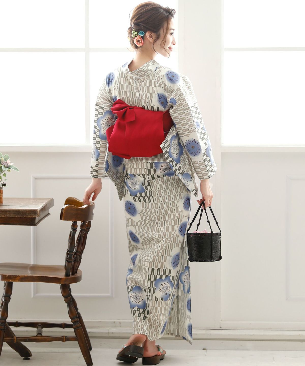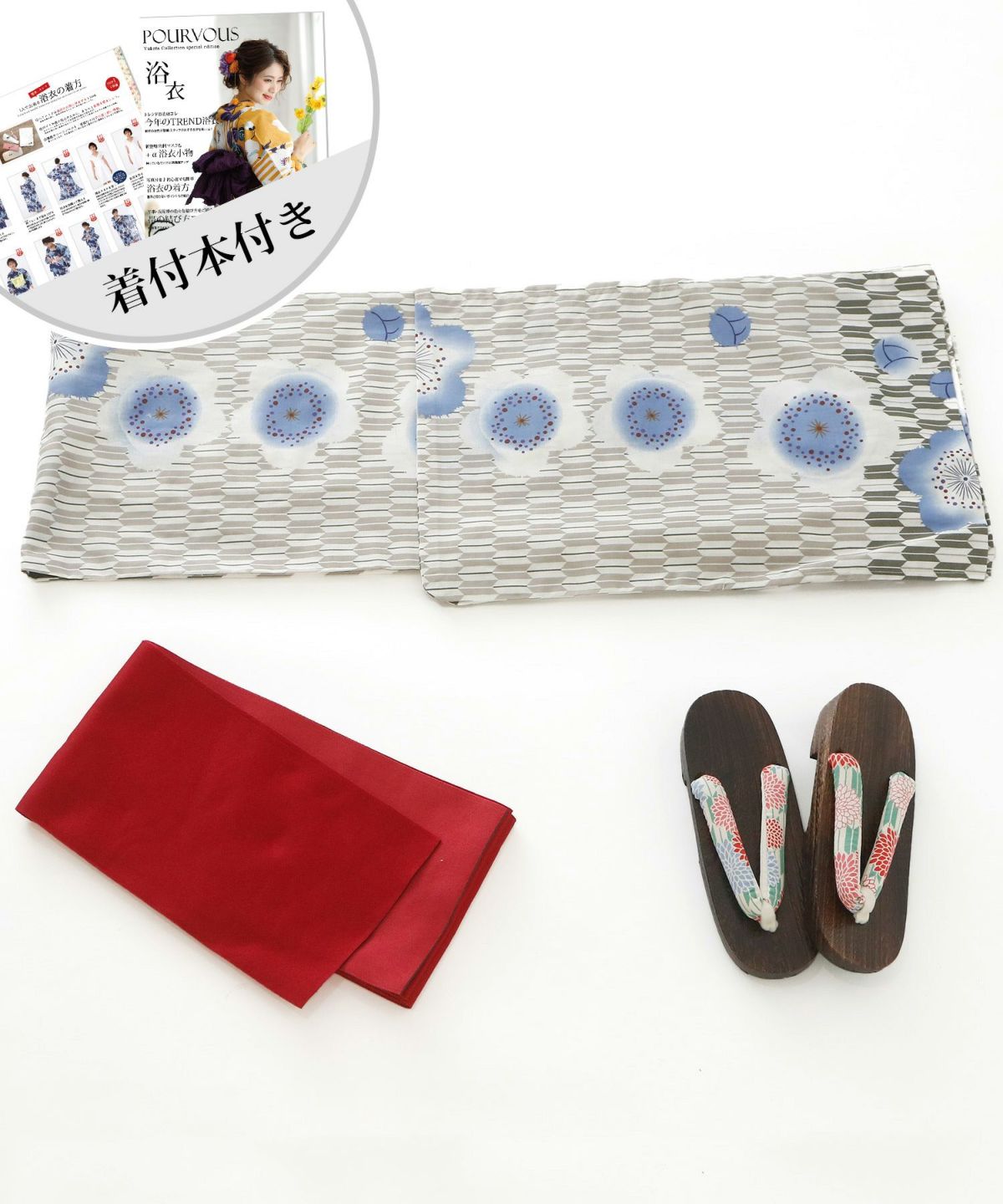 ◆4点セット(浴衣/着付け本/半巾帯/下駄:フリーサイズ23cm~25cm) ◆浴衣素材:綿100%、帯素材:ポリエステル100% |