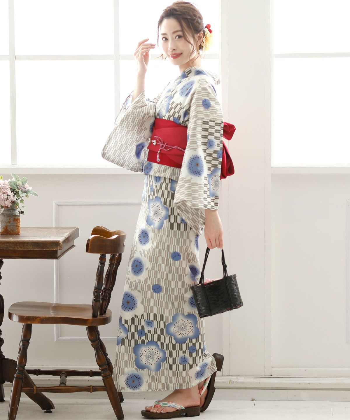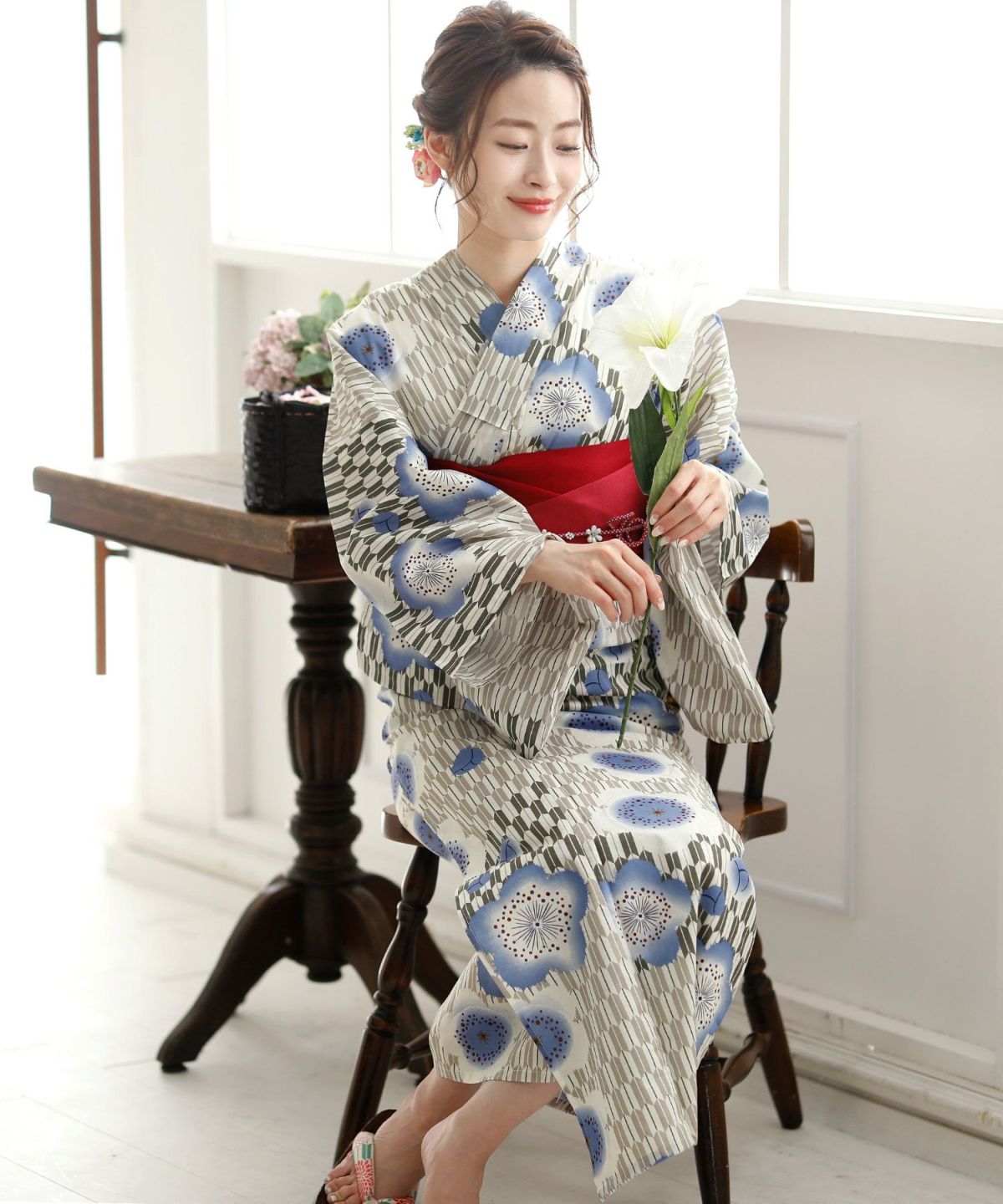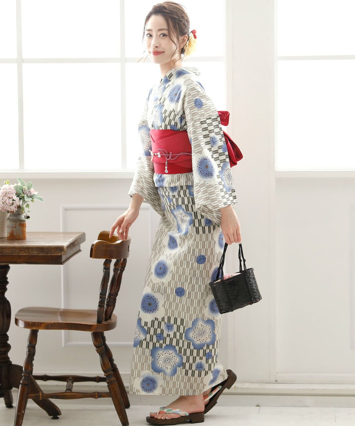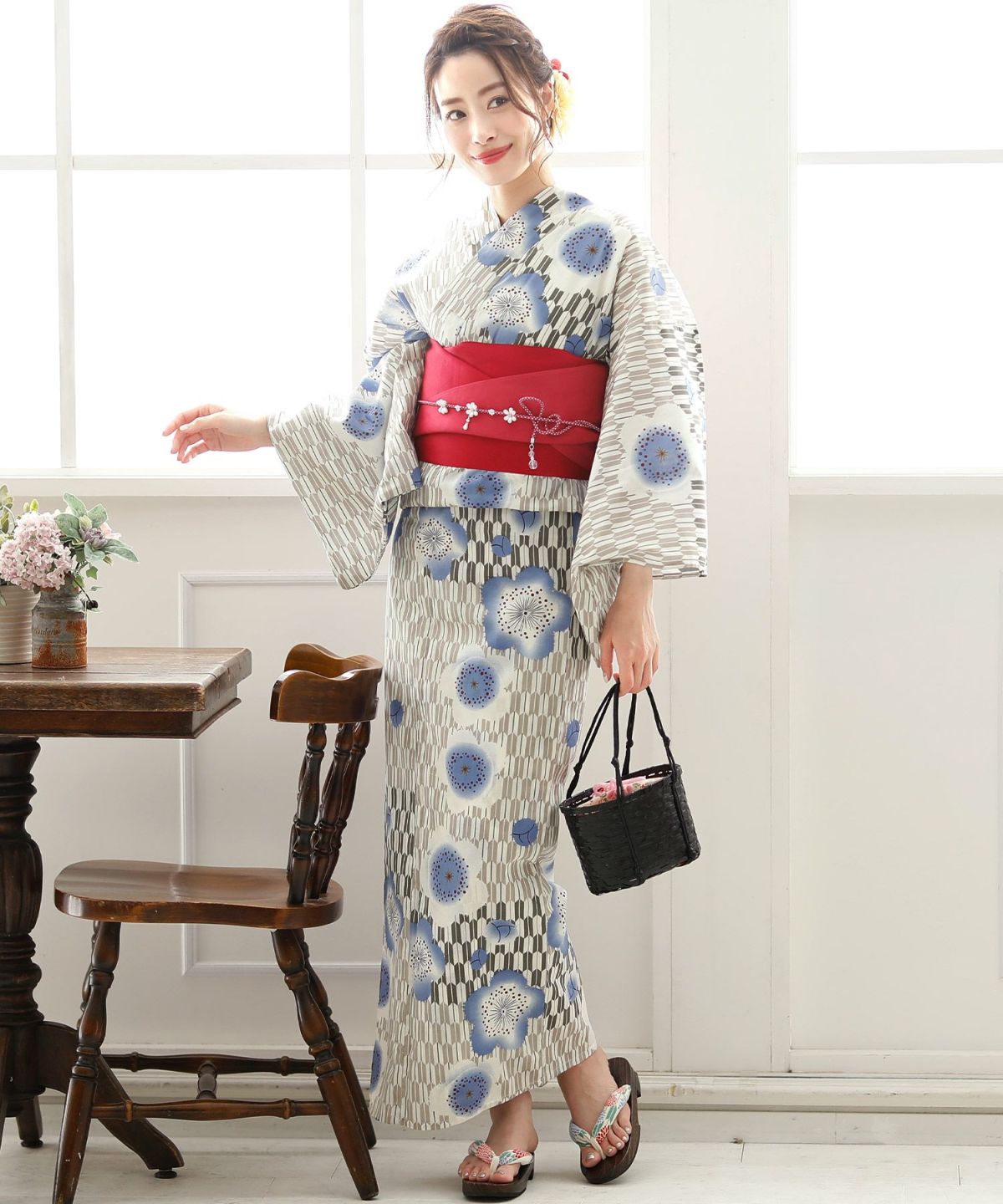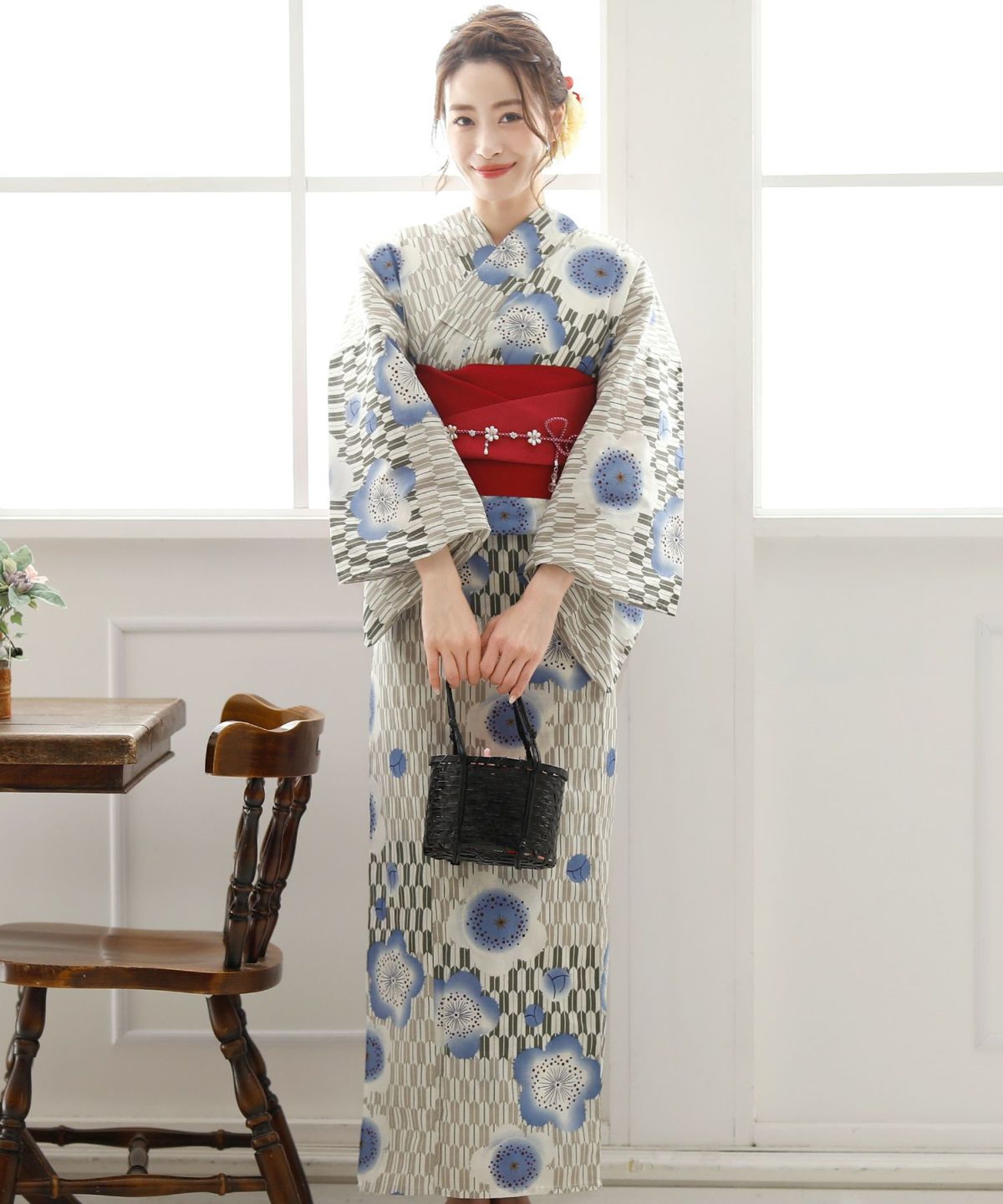 ◆4点セット(浴衣/着付け本/半巾帯/下駄:フリーサイズ23cm~25cm) ◆浴衣素材:綿100%、帯素材:ポリエステル100% |
