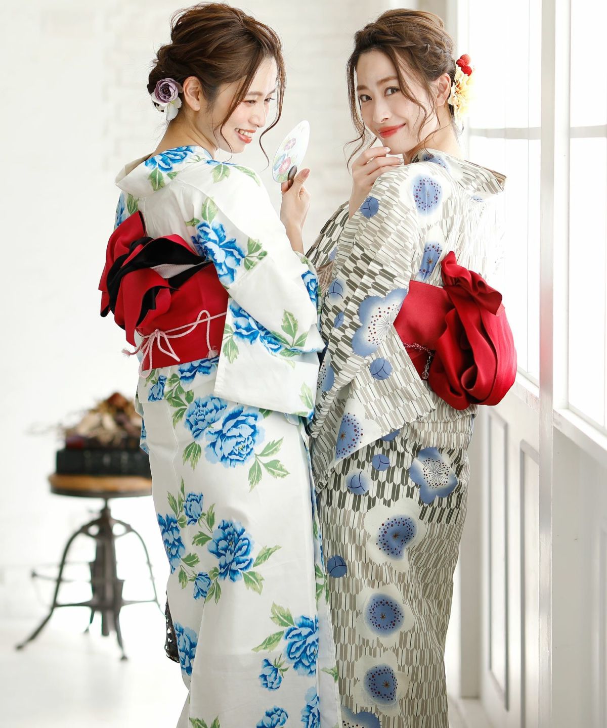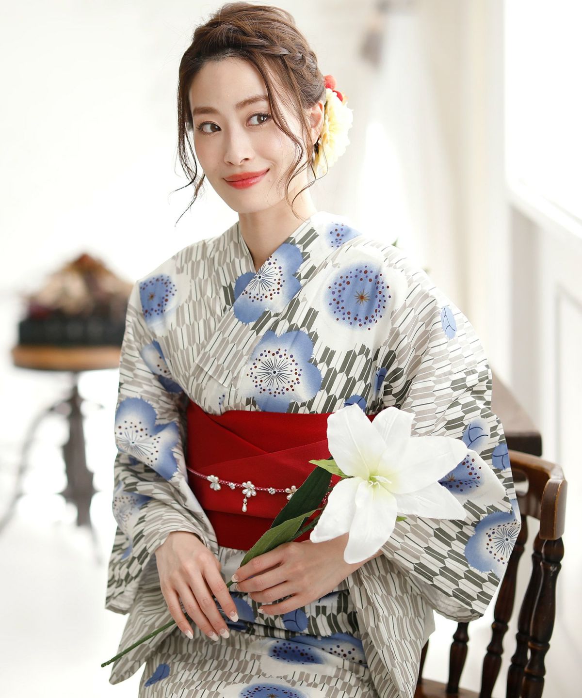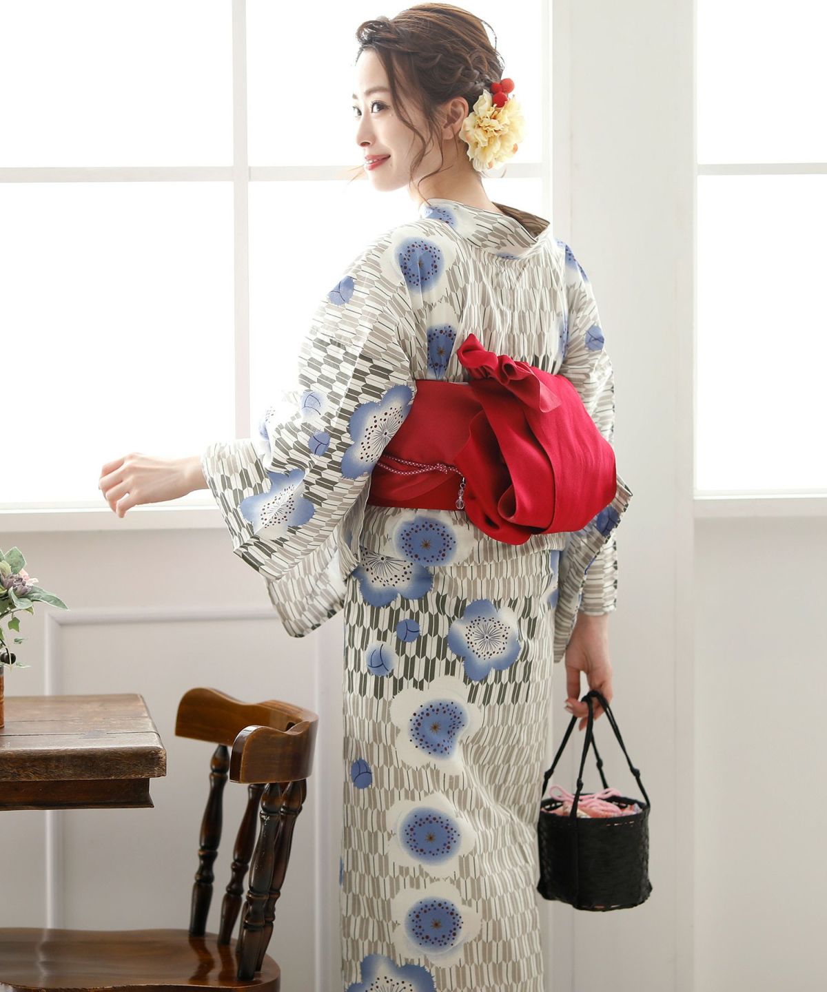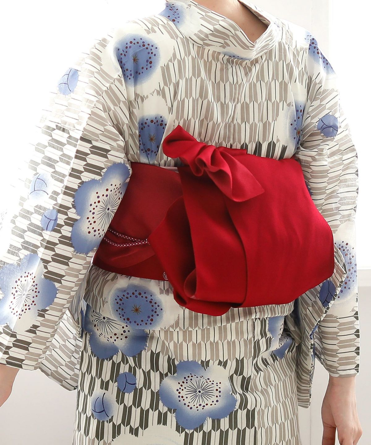 パッと目を引く鮮やかな紅の帯は、アレンジ自在の半巾帯となっています。