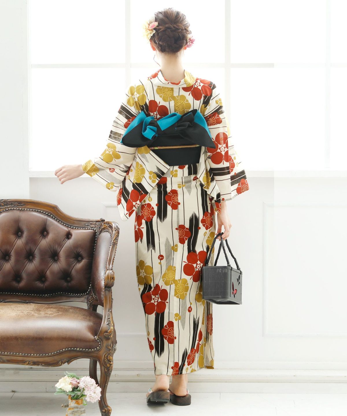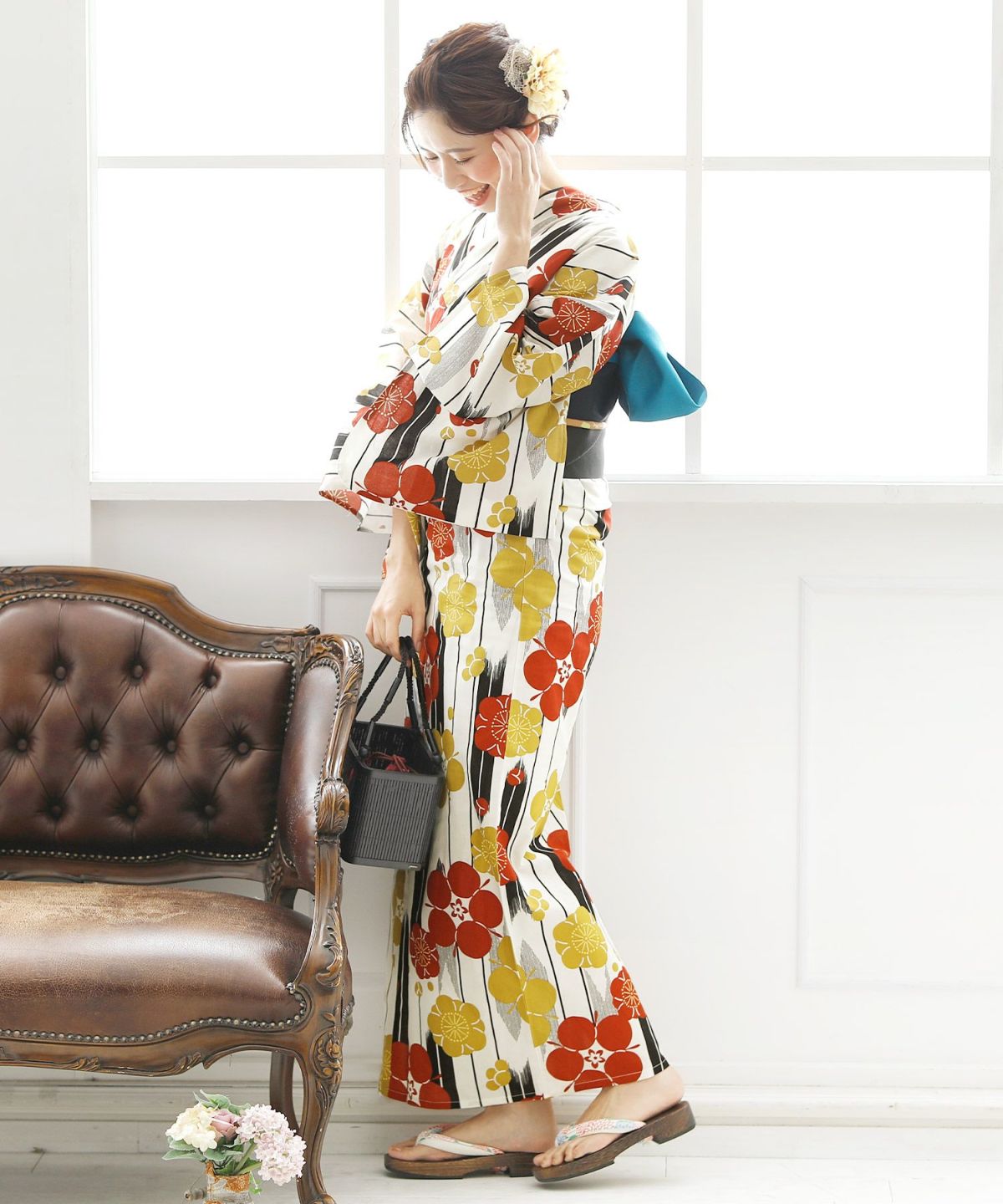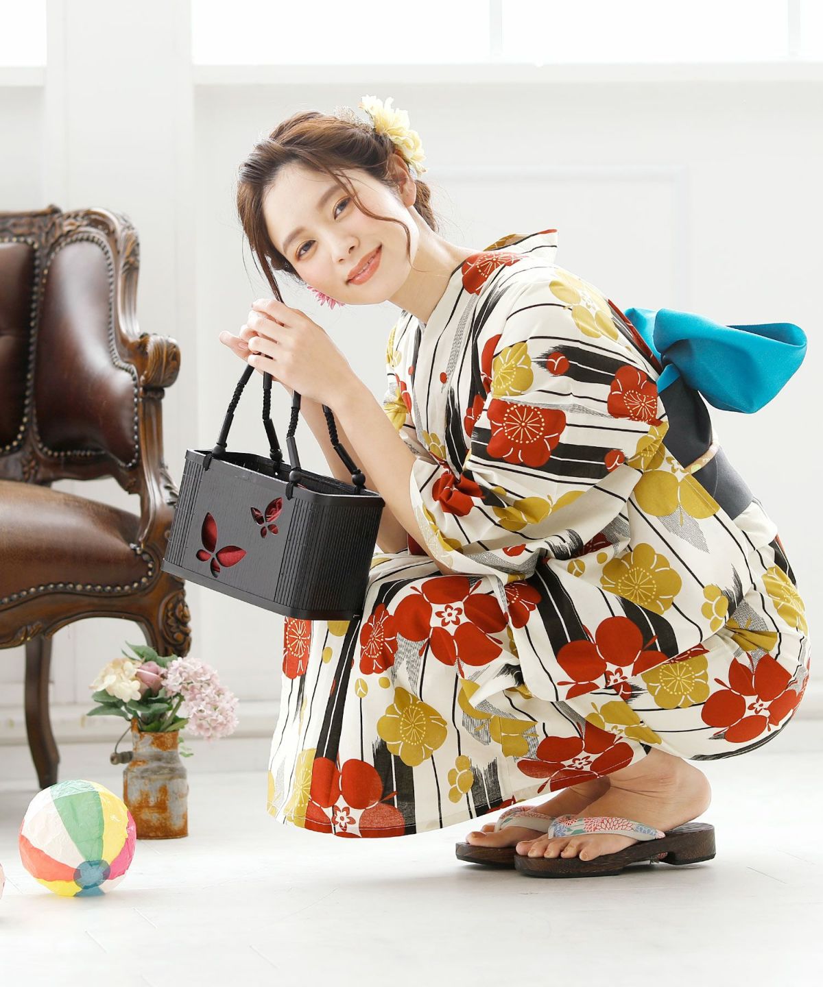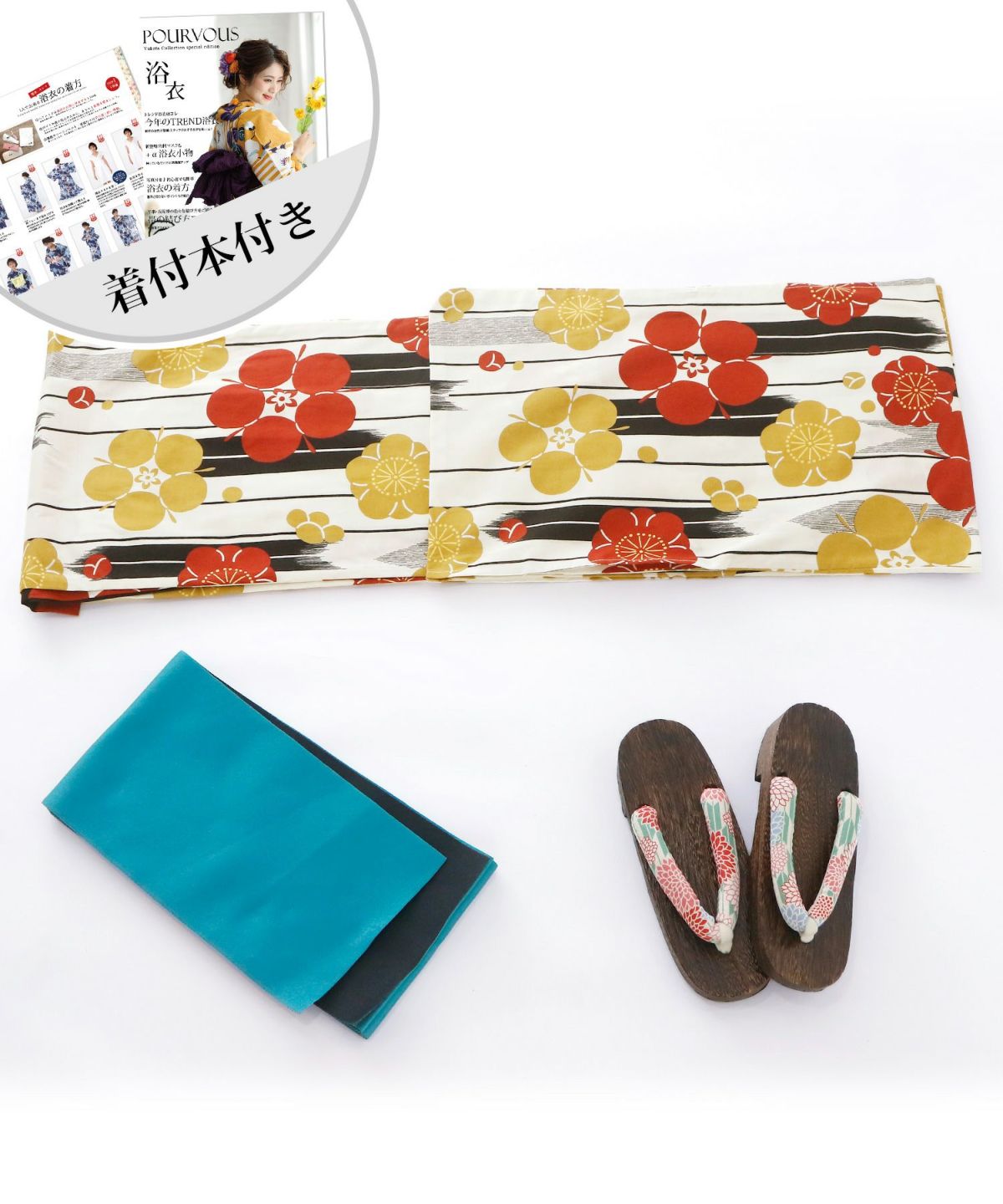 ◆4点セット(浴衣/着付け本/半巾帯/下駄:フリーサイズ23cm~25cm) ◆浴衣素材:綿100%、帯素材:ポリエステル100% |