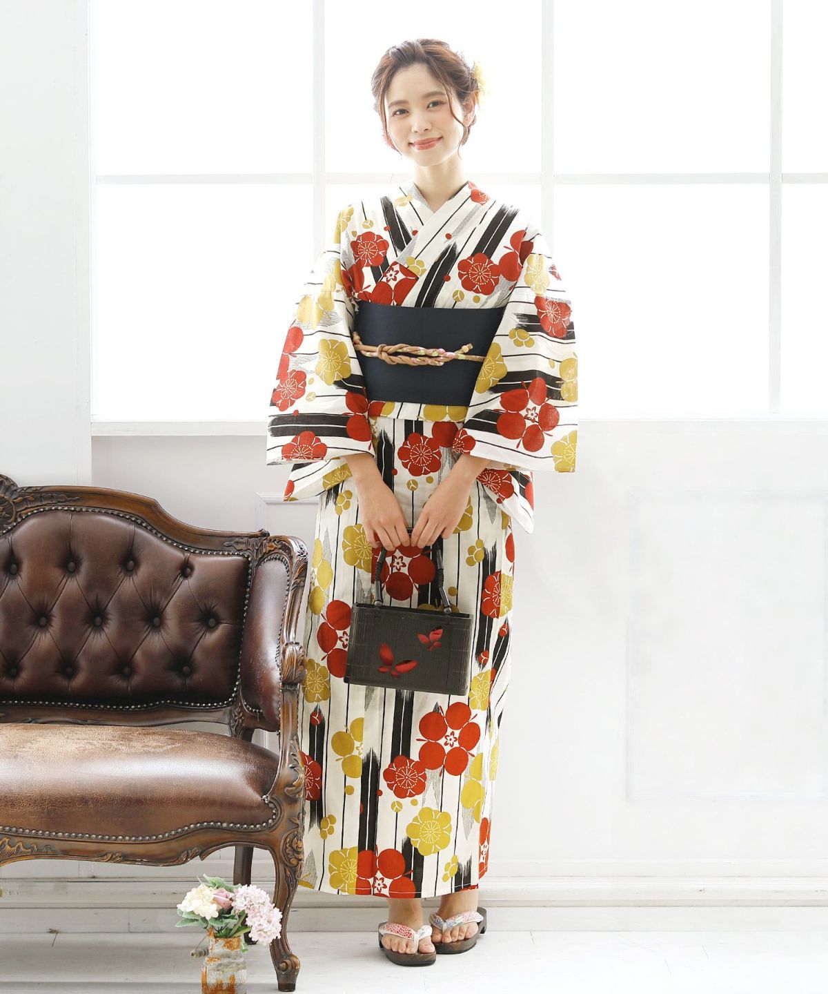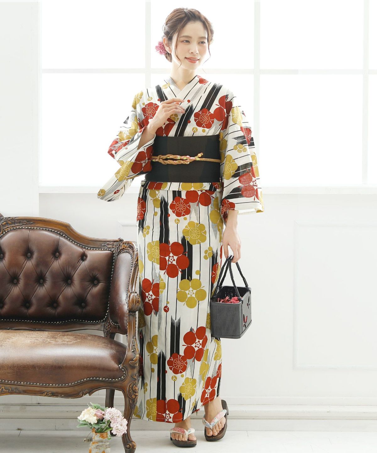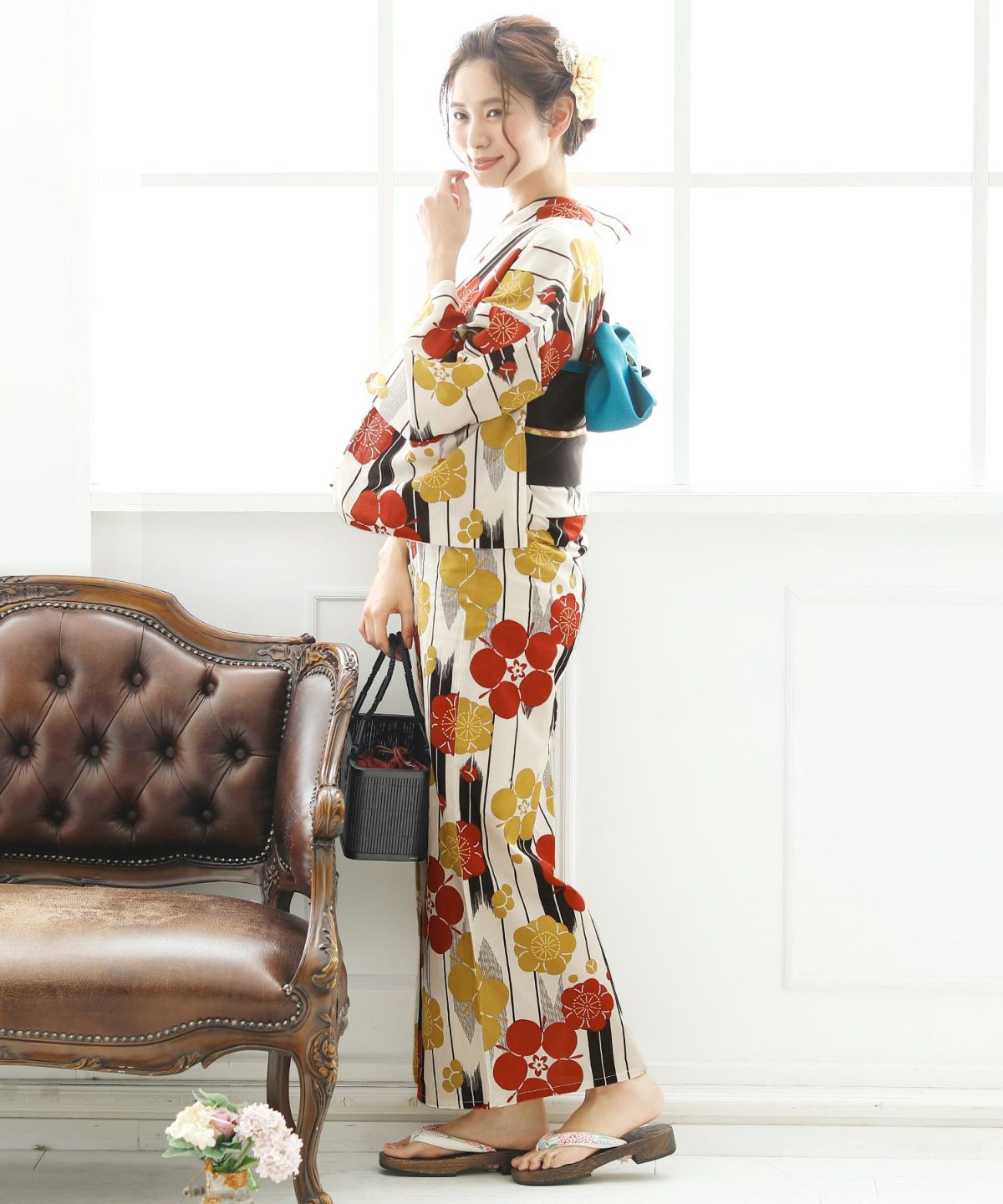 ◆4点セット(浴衣/着付け本/半巾帯/下駄:フリーサイズ23cm~25cm) ◆浴衣素材:綿100%、帯素材:ポリエステル100% |