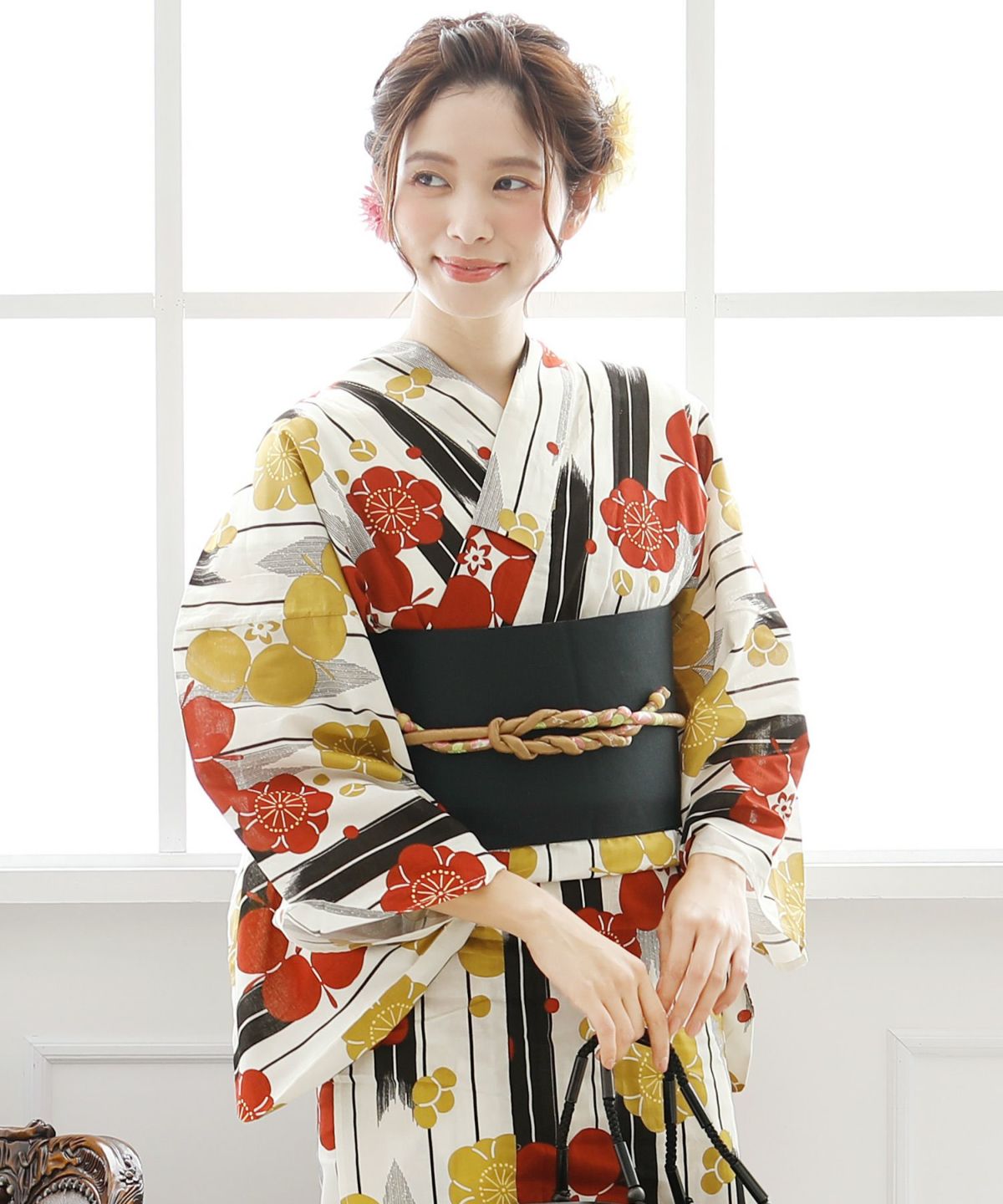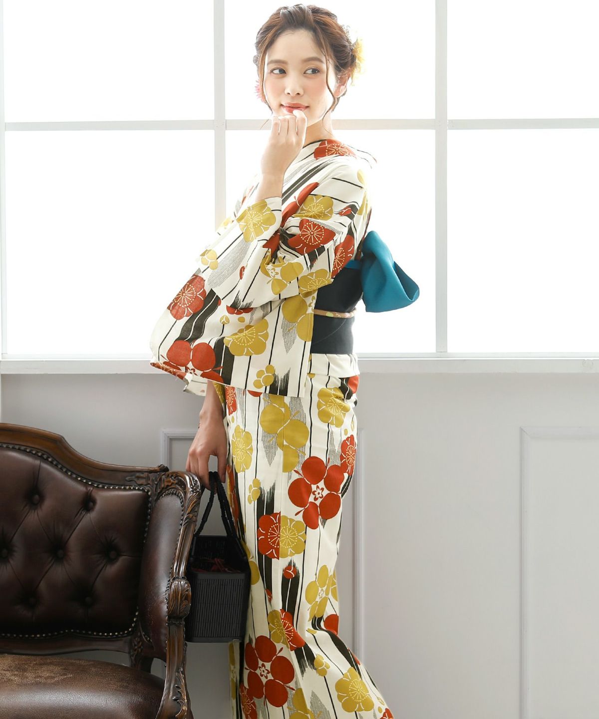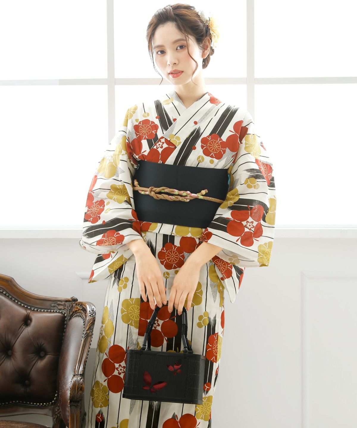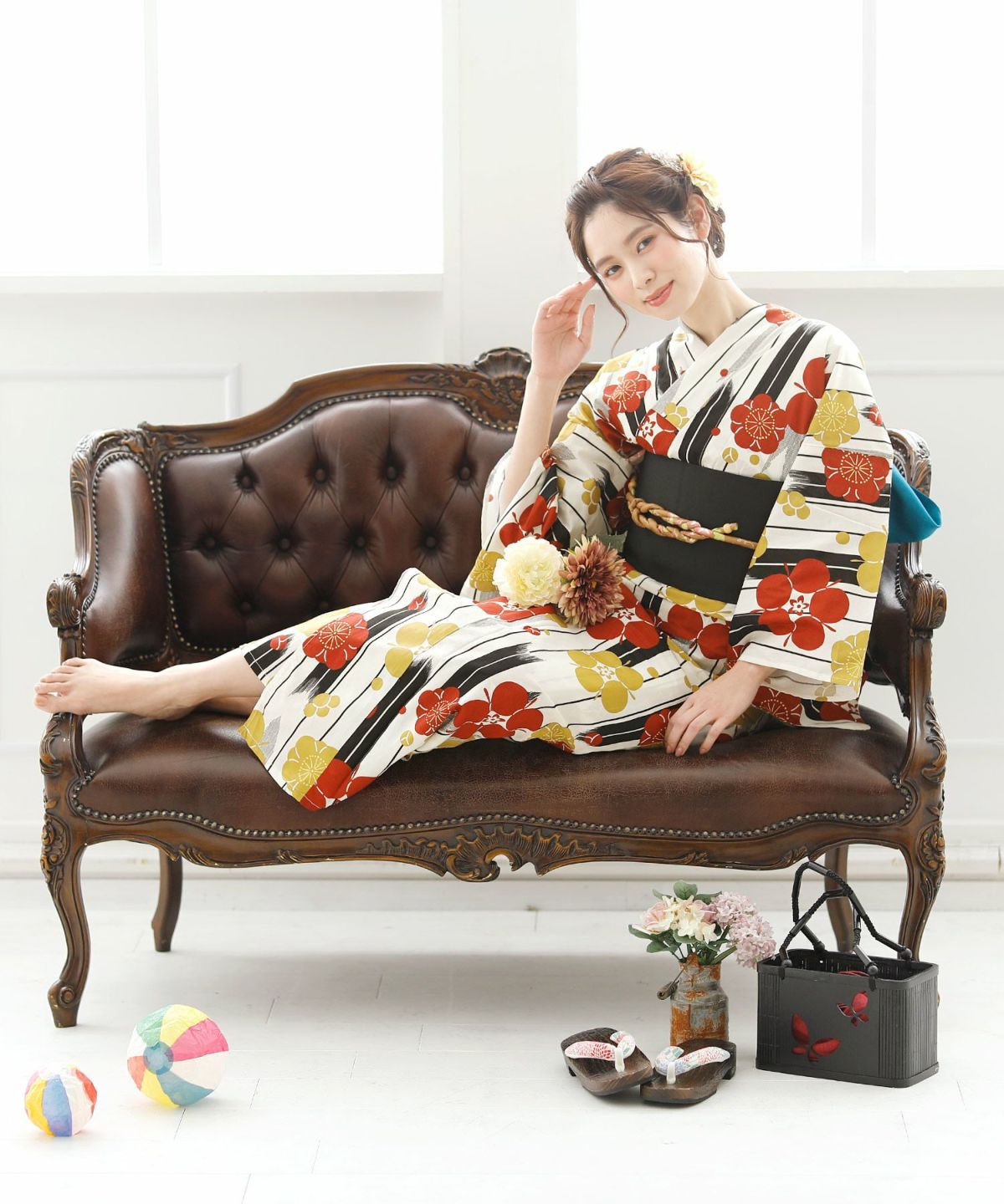 ◆4点セット(浴衣/着付け本/半巾帯/下駄:フリーサイズ23cm~25cm) ◆浴衣素材:綿100%、帯素材:ポリエステル100% |