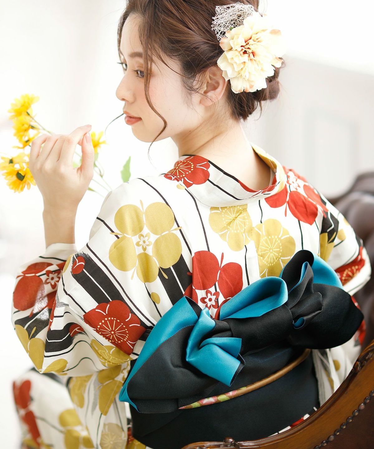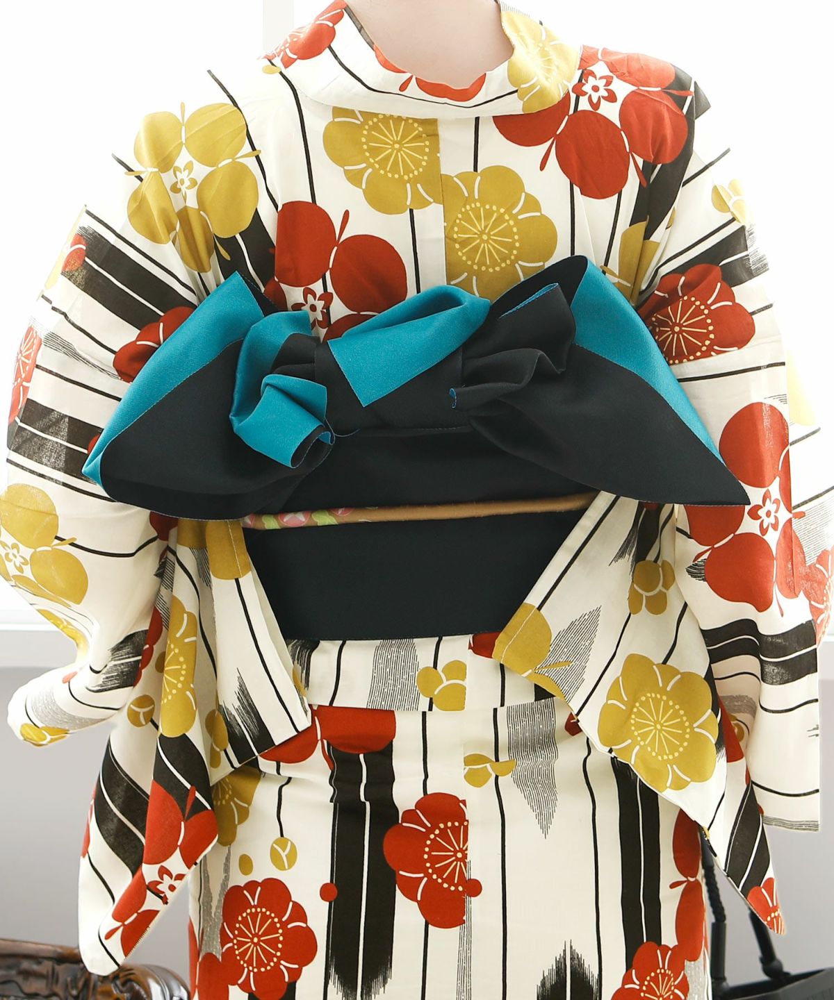 可愛いターコイズ×黒の帯は、アレンジ自在の半巾帯となっています。