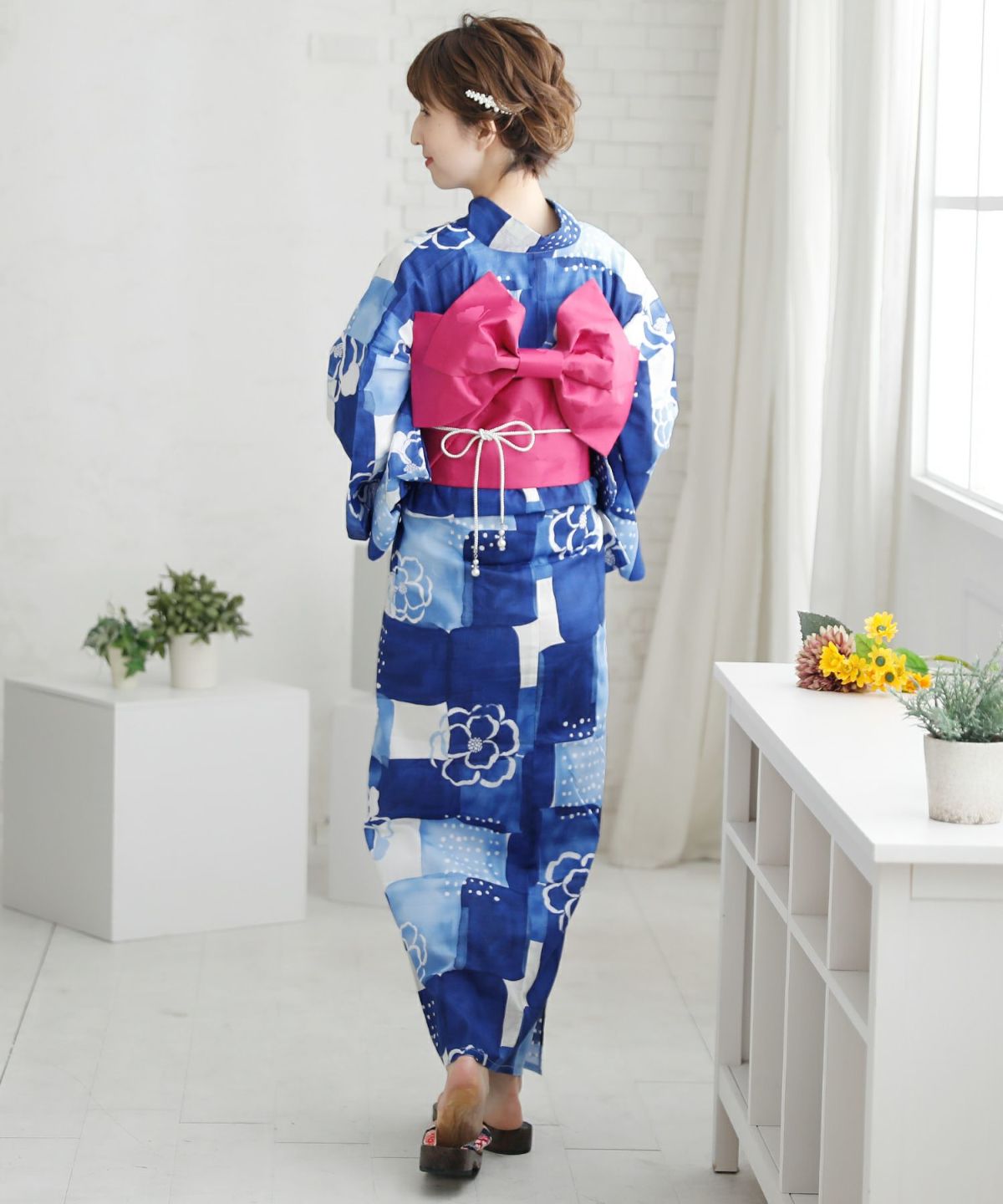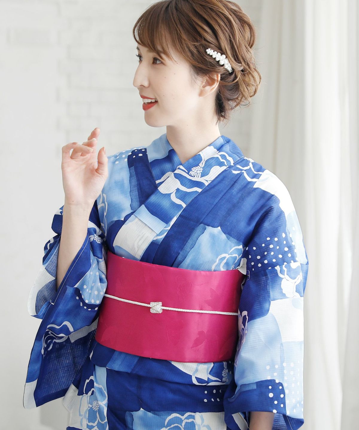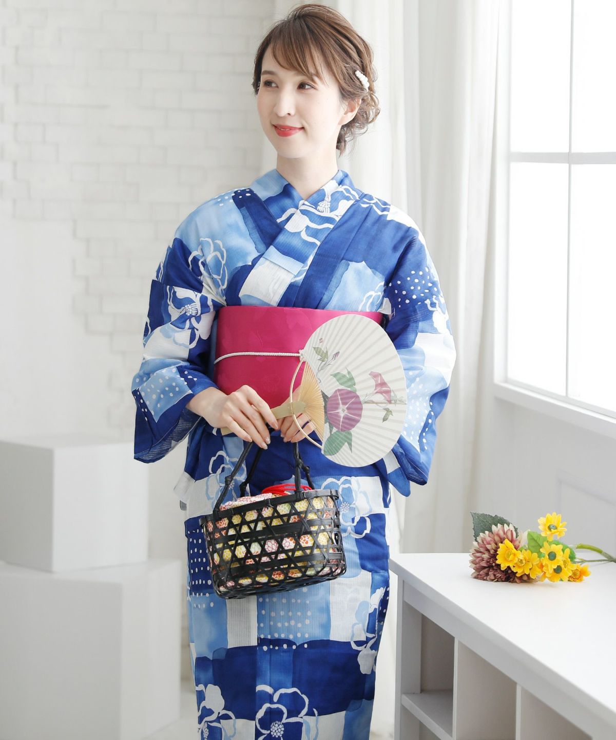 ◆浴衣素材:綿100%、帯素材:ポリエステル100% モデル参考 備考 ※浴衣の【しつけ糸】を切った場合は、【返品交換不可】となります。予めご了承ください。