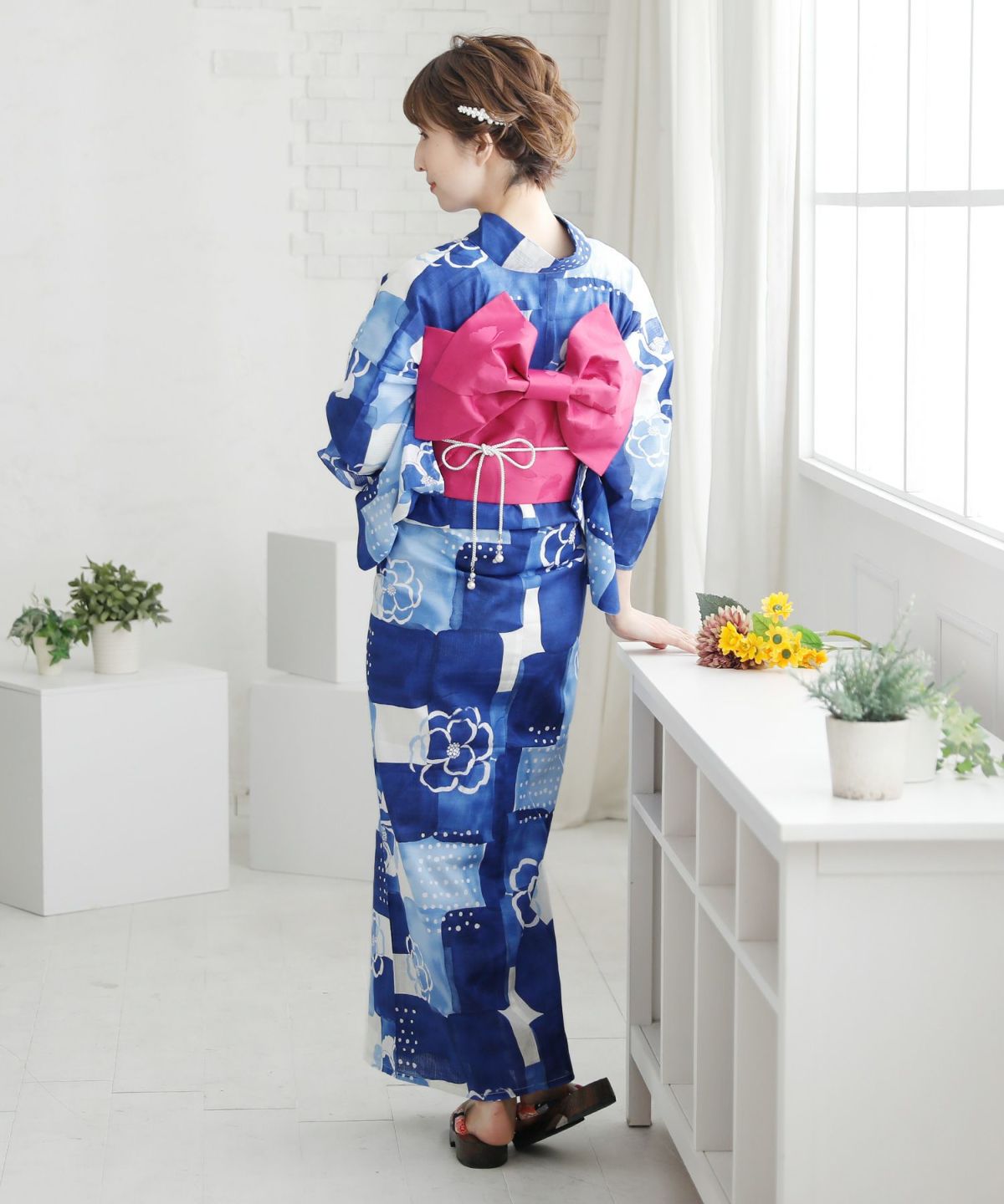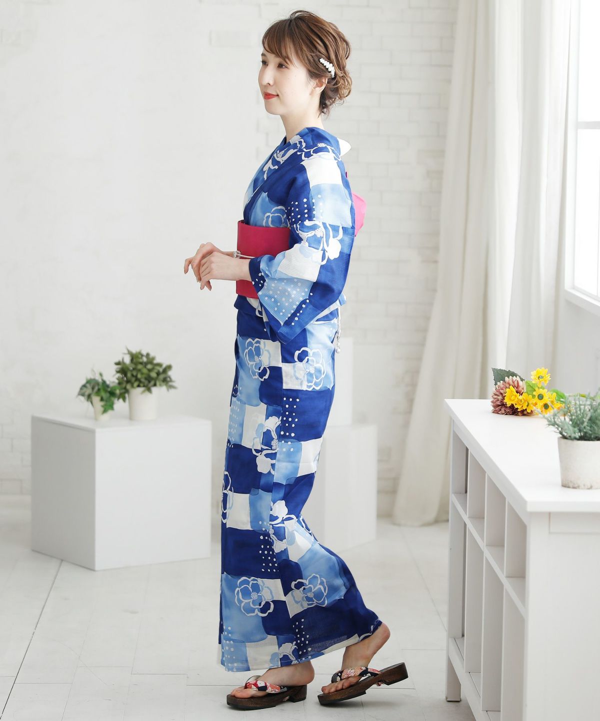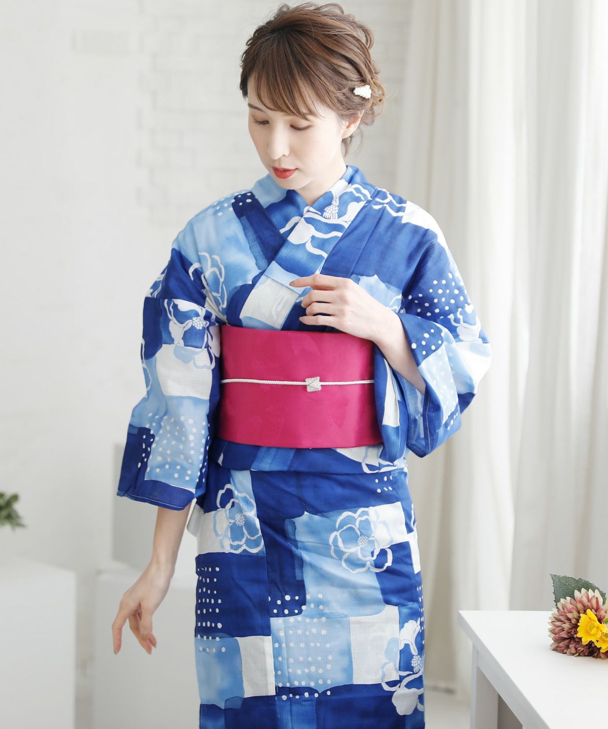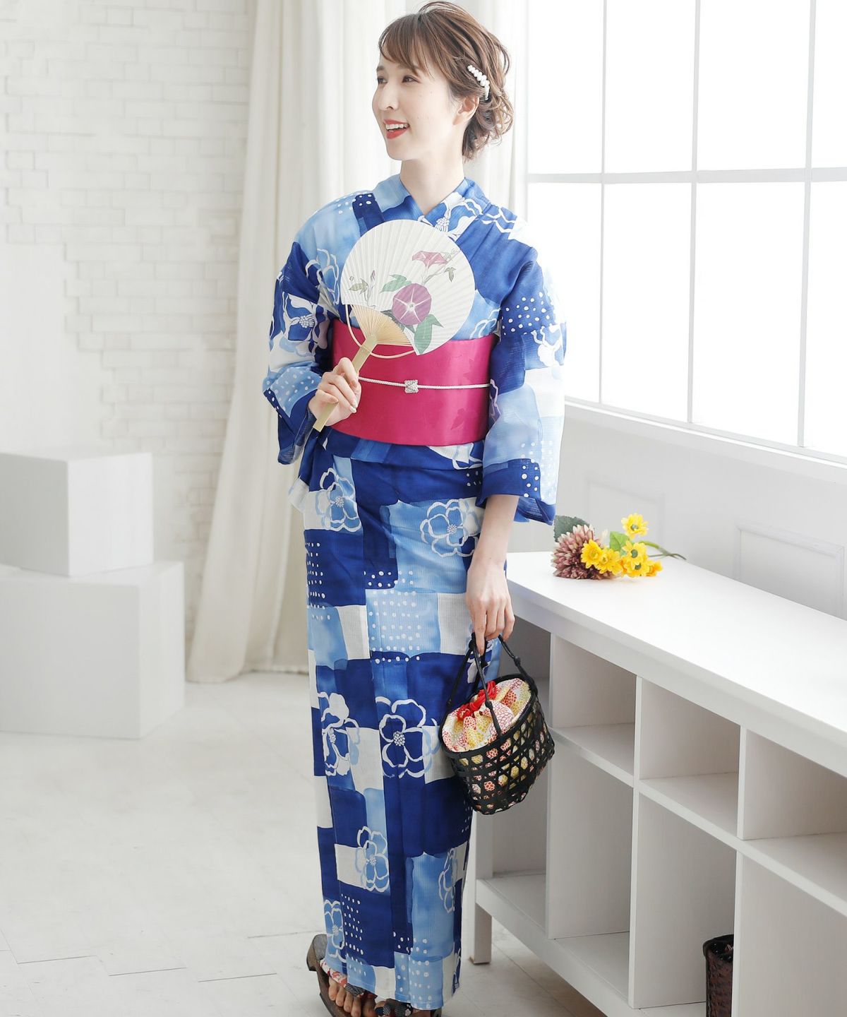 ◆浴衣素材:綿100%、帯素材:ポリエステル100% モデル参考 備考 ※浴衣の【しつけ糸】を切った場合は、【返品交換不可】となります。予めご了承ください。