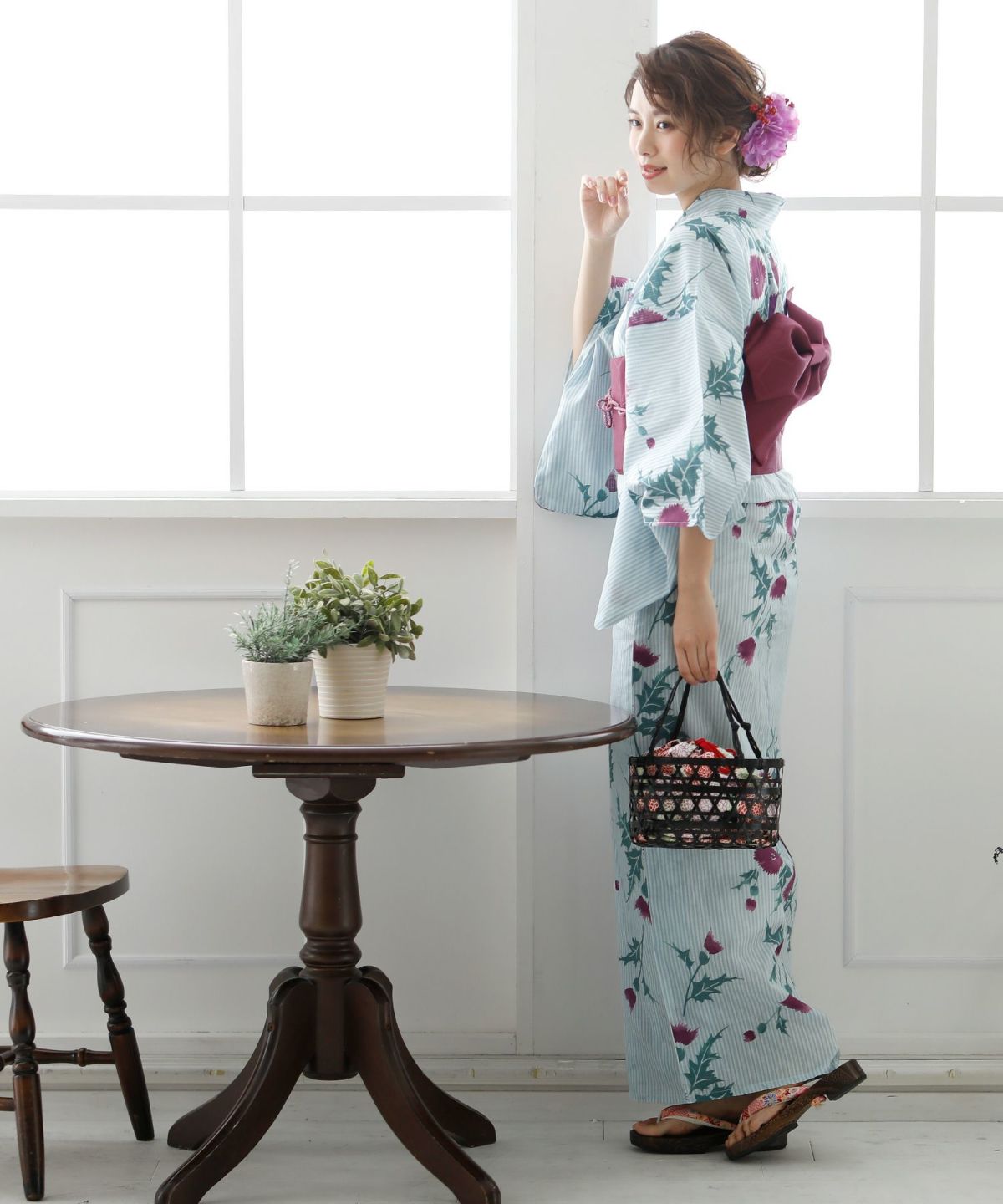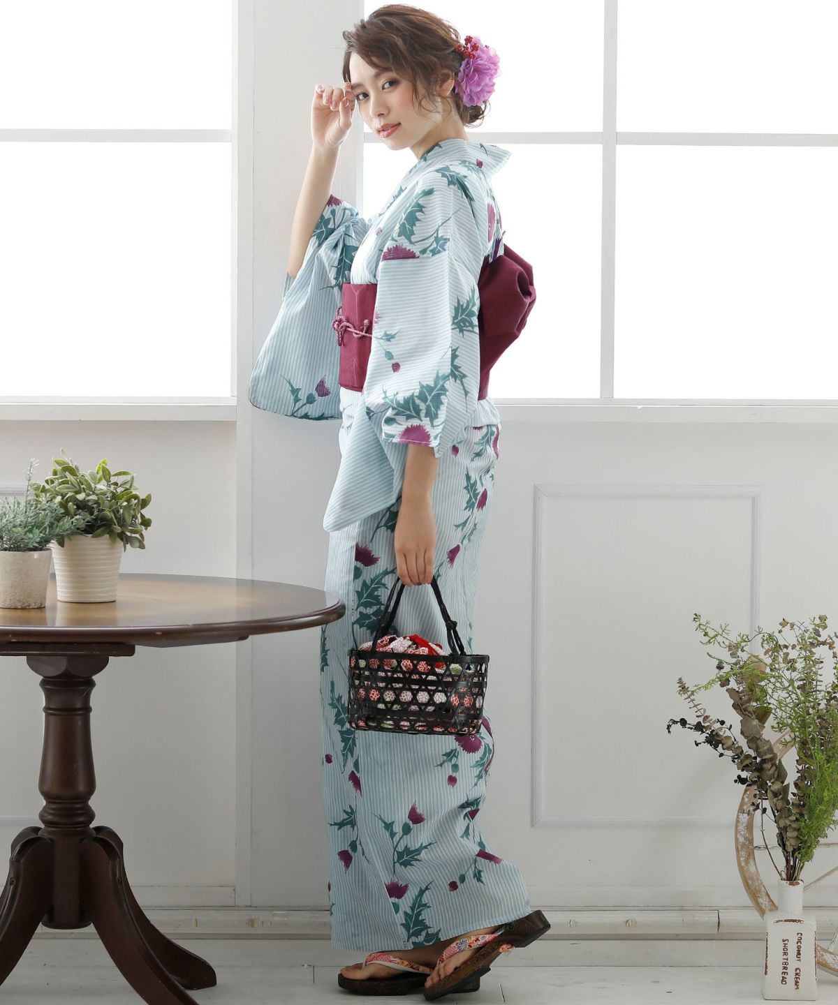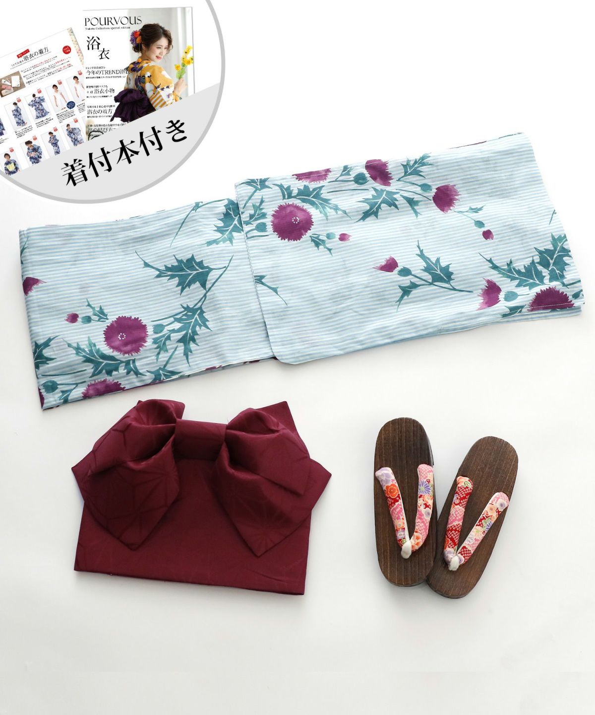 ◆4点セット(浴衣/着付け本/作り帯/下駄:フリーサイズ23cm~25cm)